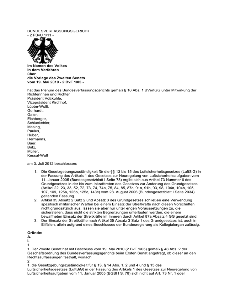 BUNDESVERFASSUNGSGERICHT - 2 PBvU 1/11 - Im Namen des Volkes In dem Verfahren über die Vorlage des Zweiten Senats vom 19. Mai 2010 - 2 BvF 1/05 hat das Plenum des Bundesverfassungsgerichts gemäß § 16 Abs. 1 BVerfGG unter Mitwirkung der Richterinnen und Richter Präsident Voßkuhle, Vizepräsident Kirchhof, Lübbe-Wolff, Gerhardt, Gaier, Eichberger, Schluckebier, Masing, Paulus, Huber, Hermanns, Baer, Britz, Müller, Kessal-Wulf am 3. Juli 2012 beschlossen: 1. Die Gesetzgebungszuständigkeit für die §§ 13 bis 15 des Luftsicherheitsgesetzes (LuftSiG) in der Fassung des Artikels 1 des Gesetzes zur Neuregelung von Luftsicherheitsaufgaben vom 11. Januar 2005 (Bundesgesetzblatt I Seite 78) ergibt sich aus Artikel 73 Nummer 6 des Grundgesetzes in der bis zum Inkrafttreten des Gesetzes zur Änderung des Grundgesetzes (Artikel 22, 23, 33, 52, 72, 73, 74, 74a, 75, 84, 85, 87c, 91a, 91b, 93, 98, 104a, 104b, 105, 107, 109, 125a, 125b, 125c, 143c) vom 28. August 2006 (Bundesgesetzblatt I Seite 2034) geltenden Fassung. 2. Artikel 35 Absatz 2 Satz 2 und Absatz 3 des Grundgesetzes schließen eine Verwendung spezifisch militärischer Waffen bei einem Einsatz der Streitkräfte nach diesen Vorschriften nicht grundsätzlich aus, lassen sie aber nur unter engen Voraussetzungen zu, die sicherstellen, dass nicht die strikten Begrenzungen unterlaufen werden, die einem bewaffneten Einsatz der Streitkräfte im Inneren durch Artikel 87a Absatz 4 GG gesetzt sind. 3. Der Einsatz der Streitkräfte nach Artikel 35 Absatz 3 Satz 1 des Grundgesetzes ist, auch in Eilfällen, allein aufgrund eines Beschlusses der Bundesregierung als Kollegialorgan zulässig. Gründe: A. I. 1 1. Der Zweite Senat hat mit Beschluss vom 19. Mai 2010 (2 BvF 1/05) gemäß § 48 Abs. 2 der Geschäftsordnung des Bundesverfassungsgerichts beim Ersten Senat angefragt, ob dieser an den Rechtsauffassungen festhält, wonach 2 1. die Gesetzgebungszuständigkeit für § 13, § 14 Abs. 1, 2 und 4 und § 15 des Luftsicherheitsgesetzes (LuftSiG) in der Fassung des Artikels 1 des Gesetzes zur Neuregelung von Luftsicherheitsaufgaben vom 11. Januar 2005 (BGBl I S. 78) sich nicht auf Art. 73 Nr. 1 oder Art. 73 Nr. 6 GG, sondern allein auf Art. 35 Abs. 2 Satz 2 und Abs. 3 GG stützen lässt (BVerfGE 115, 118 <140 f.>), 3 2. Art. 35 Abs. 2 Satz 2 und Abs. 3 GG einen Einsatz der Streitkräfte mit spezifisch militärischen Waffen nicht zulässt (BVerfGE 115, 118 <146 ff., 150 f.>), und 4 3. § 13 Abs. 3 Satz 2 und 3 LuftSiG mit Art. 35 Abs. 3 Satz 1 GG unvereinbar sind, soweit sie eine Eilkompetenz des Bundesministers der Verteidigung auch für die Fälle des Art. 35 Abs. 3 GG vorsehen (BVerfGE 115, 118 <149 f.>). 5 2. Der Anfrage liegt zugrunde, dass der Zweite Senat in einem Verfahren der abstrakten Normenkontrolle (2 BvF 1/05) auf Antrag der Bayerischen Staatsregierung und der Hessischen Landesregierung darüber zu entscheiden hat, ob § 13, § 14 Abs. 1, 2 und 4 und § 15 LuftSiG, die die Voraussetzungen und Modalitäten eines Einsatzes der Streitkräfte zur Abwehr besonders schwerer von Luftfahrzeugen ausgehender Unglücksfälle regeln, mit dem Grundgesetz vereinbar sind. Der Normenkontrollantrag betraf ursprünglich die §§ 13 bis 15 LuftSiG. Nachdem § 14 Abs. 3 LuftSiG, der zum Abschuss eines gegen das Leben von Menschen eingesetzten Luftfahrzeugs ermächtigte, durch Urteil des Ersten Senats vom 15. Februar 2006 für nichtig erklärt wurde (BVerfGE 115, 118 <119>), haben die Antragstellerinnen ihren Antrag insoweit für erledigt erklärt. Damit stehen in dem Ausgangsverfahren nur noch § 13, § 14 Abs. 1, 2 und 4 und § 15 LuftSiG zur Prüfung. Der Zweite Senat möchte in diesem Verfahren abweichend von den genannten Rechtsauffassungen entscheiden (§ 16 BVerfGG, § 48 Abs. 2 GOBVerfG). 6 3. Der Erste Senat hat mit Beschluss vom 12. Oktober 2010 erklärt, dass er an seinen Rechtsauffassungen festhält. 7 4. Mit Beschluss vom 3. Mai 2011 hat der Zweite Senat das Plenum angerufen. 8 5. Die Antragstellerinnen des Ausgangsverfahrens, der Bundestag, der Bundesrat, die Bundesregierung, das Bundesministerium des Innern und die (weiteren) Landesregierungen erhielten Kenntnis von der Vorlage. Stellungnahmen sind nicht eingegangen. II. 9 Das Plenum ist zur Entscheidung über die Vorlage berufen. 10 1. Die Anrufung des Plenums (§ 16 BVerfGG) ist geboten, wenn ein Senat von einer Rechtsauffassung des anderen Senats abweichen möchte, die für die Entscheidung des anderen Senats tragend war (vgl. BVerfGE 4, 27 <28>; 77, 84 <104>; 96, 375 <404>; 112, 1 <23>; 112, 50 <63>). Die Rechtsauffassungen, auf die sich die vorliegende Anfrage bezieht, waren in dem Urteil des Ersten Senats, mit dem über die Gültigkeit der gesetzlichen Ermächtigung des § 14 Abs. 3 LuftSiG entschieden wurde, tragend im für die Anwendung des § 16 BVerfGG maßgebenden Sinne. 11 2. An der tragenden Qualität fehlt es diesen Rechtsauffassungen nicht deshalb, weil § 14 Abs. 3 LuftSiG in dem Urteil nicht allein auf ihrer Grundlage, sondern auch wegen Verstoßes gegen Art. 1 Abs. 1 GG für nichtig erklärt wurde. Tragend sind jedenfalls diejenigen Rechtsauffassungen, die nicht hinweggedacht werden können, ohne dass das konkrete Entscheidungsergebnis nach dem in der Entscheidung zum Ausdruck gekommenen Gedankengang entfiele (vgl. BVerfGE 96, 375 <404>). Der Urteilsausspruch des Ersten Senats zu § 14 Abs. 3 LuftSiG lautete, dass die Bestimmung mit Art. 2 Abs. 2 Satz 1 in Verbindung mit Art. 87a Abs. 2 und Art. 35 Abs. 2 und 3 sowie in Verbindung mit Art. 1 Abs. 1 GG unvereinbar und nichtig sei (BVerfGE 115, 118 <119>). Dieses im Urteilstenor ausgesprochene Entscheidungsergebnis hätte nicht dieselbe Gestalt, wenn der Erste Senat sich nicht über seine Auslegung des Art. 1 Abs. 1 GG hinaus auch auf Auslegungen des Art. 35 GG gestützt hätte, auf die sich die vorliegende Anfrage bezieht. 12 Allerdings wäre der Urteilsausspruch unverändert geblieben, wenn der Erste Senat seine Entscheidung 