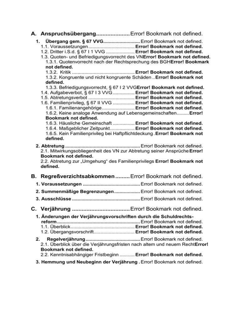 A. Anspruchsübergang..................... Error! Bookmark not defined. 1. Übergang gem. § 67 VVG........................... Error! Bookmark not defined. 1.1. Voraussetzungen .................................. Error! Bookmark not defined. 1.2. Dritter i.S.d. § 67 I 1 VVG ..................... Error! Bookmark not defined. 1.3. Quoten- und Befriedigungsvorrecht des VNError! Bookmark not defined. 1.3.1. Quotenvorrecht nach der Rechtsprechung des BGHError! Bookmark not defined. 1.3.2. Kritik .............................................. Error! Bookmark not defined. 1.3.2. Kongruente und nicht kongruente Schäden .. Error! Bookmark not defined. 1.3.3. Befriedigungsvorrecht, § 67 I 2 VVGError! Bookmark not defined. 1.4. Aufgabeverbot, § 67 I 3 VVG ................ Error! Bookmark not defined. 1.5. Abtretungsverbot .................................. Error! Bookmark not defined. 1.6. Familienprivileg, § 67 II VVG ................ Error! Bookmark not defined. 1.6.1. Familienangehörige ........................ Error! Bookmark not defined. 1.6.2. Keine analoge Anwendung auf Lebensgemeinschaften......... Error! Bookmark not defined. 1.6.3. Häusliche Gemeinschaft ................ Error! Bookmark not defined. 1.6.4. Maßgeblicher Zeitpunkt .................. Error! Bookmark not defined. 1.6.5. Kein Familienprivileg bei Haftpflichtdeckung . Error! Bookmark not defined. 2. Abtretung ....................................................... Error! Bookmark not defined. 2.1. Mitwirkungsobliegenheit des VN zur Abtretung seiner Ansprüche Error! Bookmark not defined. 2.2. Abtretung zur „Umgehung“ des Familienprivilegs Error! Bookmark not defined. B. Regreßverzichtsabkommen ......... Error! Bookmark not defined. 1. Voraussetzungen .......................................... Error! Bookmark not defined. 2. Summenmäßige Begrenzungen ................... Error! Bookmark not defined. 3. Ausschlüsse .................................................. Error! Bookmark not defined. C. Verjährung .................................... Error! Bookmark not defined. 1. Änderungen der Verjährungsvorschriften durch die Schuldrechtsreform ............................................................. Error! Bookmark not defined. 1.1. Überblick ............................................... Error! Bookmark not defined. 1.2. Übergangsvorschrift .............................. Error! Bookmark not defined. 2. Regelverjährung ........................................ Error! Bookmark not defined. 2.1. Überblick über die Verjährungsfristen nach altem und neuem RechtError! Bookmark not defined. 2.2. Kenntnisabhängiger Fristbeginn ........... Error! Bookmark not defined. 3. Hemmung und Neubeginn der Verjährung . Error! Bookmark not defined. 4. Verjährungsvereinbarungen......................... Error! Bookmark not defined. 5. Besonders praxisrelevante VerjährungsfristenError! Bookmark not defined. 5.1. Kaufvertragsrechtliche Ansprüche, § 438 BGB .... Error! Bookmark not defined. 5.2. Werkvertragsrechtliche Ansprüche, § 634 a BGB Error! Bookmark not defined. 5.2.1. Bauwerksarbeiten .......................... Error! Bookmark not defined. 5.2.2. Arglistige Täuschung, insb. Organisationsverschulden ......... Error! Bookmark not defined. 5.2.3. “Weiterfresserschäden“ .................. Error! Bookmark not defined. 5.2.4. Ansprüche aus pVV nach altem RechtError! Bookmark not defined. 5.2.5. Sekundärhaftung ........................... Error! Bookmark not defined. 5.2.6. Schäden, die nicht mit Mängeln zusammenhängenError! Bookmark not defined. 5.3. Gewährleistungsansprüche nach § 13 Ziff. 4 VOB/B 2002Error! Bookmark not defined. 5.4. Mietvertragliche Ansprüche, § 548 BGBError! Bookmark not defined. 5.4.1. Von der kurzen Verjährung miterfaßte AnsprücheError! Bookmark not defined. 5.4.2. Persönlicher Anwendungsbereich .. Error! Bookmark not defined. 5.4.3. Sachlicher Anwendungsbereich ..... Error! Bookmark not defined. 5.4.4. Verjährungsbeginn ......................... Error! Bookmark not defined. 5.4.5. Einschränkungen der kurzen VerjährungsfristError! Bookmark not defined. 5.4.6. Ansprüche des Mieters gegen den VermieterError! Bookmark not defined. D. Haftungsgrundlagen..................... Error! Bookmark not defined. 1. Überblick ........................................................ Error! Bookmark not defined. 2. Haftung für das Handeln Dritter ................... Error! Bookmark not defined. 2.1. Verrichtungsgehilfe, § 831 BGB ............ Error! Bookmark not defined. 2.2. Erfüllungsgehilfe, § 278 BGB ................ Error! Bookmark not defined. 2.3. Organhaftung, § 31 BGB ...................... Error! Bookmark not defined. 3. Besondere materiell-rechtliche KonstellationenError! Bookmark not defined. 3.1. Beweiserleichterung bei mehreren Beteiligten, § 830 BGB .......... Error! Bookmark not defined. 3.1.1. Unmittelbare Anwendung .................. Error! Bookmark not defined. 3.1.2. Analoge Anwendung ......................... Error! Bookmark not defined. 3.2. Mitverschulden des VN, § 254 BGB ..... Error! Bookmark not defined. 3.3. Drittschadensliquidation ........................ Error! Bookmark not defined. 4. Änderungen durch die Schuldrechtsreform Error! Bookmark not defined. 4.1. Übergangsvorschriften - Anwendbarkeit altes oder neues Recht . Error! Bookmark not defined. 4.2. § 280 als zentrale Norm – Haftung wegen Pflichtverletzung......... Error! Bookmark not defined. 4.3. Gewährleistung im Kaufrecht ................ Error! Bookmark not defined. 4.4. Gewährleistung im Werkvertrag ............ Error! Bookmark not defined. E. Typische Regreßfälle.................... Error! Bookmark not defined. 1. Mieterregreß ............................................... Error! Bookmark not defined. 1.1. Anspruchsgrundlage und grundsätzliche BeweislastError! Bookmark not defined. 1.2. „Stillschweigende Haftungsbegrenzung“Error! Bookmark not defined. 1.2.1. Entwicklung der 
