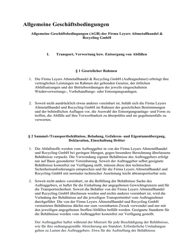 Allgemeine Geschäftsbedingungen Allgemeine Geschäftsbedingungen (AGB) der Firma Leyers Altmetallhandel & Recycling GmbH I. Transport, Verwertung bzw. Entsorgung von Abfällen § 1 Gesetzlicher Rahmen 1. Die Firma Leyers Altmetallhandel & Recycling GmbH (Auftragnehmer) erbringt ihre vertraglichen Leistungen im Rahmen der geltenden Gesetze, der örtlichen Abfallsatzungen und der Betriebsordnungen der jeweils eingeschalteten Wiederverwertungs-, Vorbehandlungs- oder Entsorgungsanlagen. 2. Soweit nicht ausdrücklich etwas anderes vereinbart ist, behält sich die Firma Leyers Altmetallhandel und Recycling GmbH im Rahmen der gesetzlichen Bestimmungen und der behördlichen Auflagen vor, die Auswahl der Entsorgungsanlage- und Form zu treffen, die Abfälle auf ihre Verwertbarkeit zu überprüfen und sie gegebenenfalls zu verwerten. § 2 Sammel-/Transportbehältnisse, Beladung, Gefahren- und Eigentumsübergang, Deklaration, Einschaltung Dritter 1. Die Abfallstoffe werden vom Auftraggeber in von der Firma Leyers Altmetallhandel und Recycling GmbH bei geringen Mengen, gegen besondere Berechnung überlassene Behältnisse verpackt. Die Verwendung eigener Behältnisse des Auftraggebers erfolgt nur auf Basis gesonderter Vereinbarung. Soweit der Auftraggeber selbst geeignete Behältnisse kostenfrei zur Verfügung stellt, müssen diese den technischen Sicherheitsanforderungen entsprechen und für die Firma Leyers Altmetallhandel und Recycling GmbH mit normaler technischer Ausrüstung leicht abtransportierbar sein. 2. Soweit nicht anders vereinbart, ist die Befüllung der Behältnisse Sache des Auftraggebers, er haftet für die Einhaltung der angegebenen Gewichtsgrenzen und für die Transportsicherheit. Soweit die Behälter von der Firma Leyers Altmetallhandel und Recycling GmbH überlassen werden und nichts anderes vereinbart ist, wird die Verladung der Behältnisse auf die jeweiligen Transportmittel vom Auftragnehmer durchgeführt. Die von der Firma Leyers Altmetallhandel und Recycling GmbH vermieteten Behältnisse dürfen nur zum vereinbarten Zweck verwendet und nur mit den jeweiligen angegebenen Stoffen/Abfällen befüllt werden. Geeignete Standorte für die Behältnisse werden vom Auftraggeber kostenfrei zur Verfügung gestellt. Der Auftraggeber haftet während der Mietzeit für jede Beschädigung der Behältnisse, wie für ihre ordnungsgemäße Absicherung am Standort. Erforderliche Umladungen gehen zu Lasten des Auftraggebers. Etwa für die Aufstellung der Behältnisse erforderliche Genehmigungen jedweder Art hat der Auftraggeber auf eigene Kosten einzuholen. Die Firma Leyers Altmetallhandel und Recycling GmbH ist berechtigt, auf Kosten des Auftraggebers erforderliche Genehmigungen zu beantragen. 3. Der Gefahrenübergang (Sach-/Preisgefahr) sowie der Haftungsübergang erfolgen mit Übernahme der Abfallstoffe durch den Auftragnehmer. Gleichzeitig gehen die Abfallstoffe in das Eigentum des Auftragnehmers über, sofern nicht ausdrücklich nur Transportleistungen vereinbart sind. 4. Der Auftraggeber hat der Firma Leyers Altmetallhandel und Recycling GmbH der Übergabe schriftlich die Art des jeweiligen Abfallstoffes genau zu zeichnen und ihn auf etwaige Gefahren, die von dem Abfallstoff ausgehen können, aufmerksam zu machen. Dies gilt insbesondere für den Fall, dass die zu befördernden Abfallstoffe den Bestimmungen über den Transport gefährlicher Güter unterliegen. Abfallstoffe verschiedener Art dürfen vorbehaltlich besonderer Vereinbarungen, keinesfalls miteinander vermischt werden. Der Auftraggeber übernimmt die volle Haftung für die zutreffende Bezeichnung der übergebenen Abfallstoffe, deren Übereinstimmung mit dem tatsächlichen Inhalt der Behältnisse sowie dafür, dass weitere als die angegebenen Gefahren nicht bestehen. Er hat für alle etwaigen Schäden, insbesondere auch für indirekte, Folge- und sonstige Vermögensschäden, einzustehen, die der Firma Leyers Altmetallhandel und Recycling GmbH oder Dritten aus einem Verstoß entstehen. 5. Die Firma Leyers Altmetallhandel und Recycling GmbH ist berechtigt, die angelieferten Abfallstoffe sowohl vor als auch nach der Übernahme zu überprüfen, nach eigenem Ermessen und auf Verlangen der Entsorgungs- oder Vorbehandlungsanlagen bzw. Fach-oder Aufsichtsbehörden Proben zu entnehmen und auf Kosten des Auftraggebers Analysen anzufertigen oder anfertigen zu lassen. 6. Der Auftragnehmer ist berechtigt, seine vertraglichen Leistungen durch Dritte zu bewirken. Der Auftraggeber kann seine vertraglichen Rechte und Pflichten nur mit vorheriger schriftlicher Zustimmung der Firma Leyers Altmetallhandel und Recycling GmbH übertragen. § 3 Außerordentliches Kündigungsrecht, Mehrentgelt, Höhere Gewalt 1. Bei Vertragsverletzungen durch den Auftraggeber ist die Firma Leyers Altmetallhandel und Recycling GmbH berechtigt, das Vertragsverhältnis in entsprechender Anwendung des § 626 BGB zu kündigen; auch in diesem Fall kann die Firma Leyers Altmetallhandel und Recycling GmbH das Entgelt für ihre noch ausstehenden Leistungen fordern, abzüglich der infolge der Aufhebung des Vertrages ersparten Aufwendungen. Als Vertragsverletzung gelten insbesondere die Vermischung von Abfallstoffen verschiedener Art, die falsche Bezeichnung von Abfallstoffen und Inhalten von Behältnissen, sowie das Fehlen von Gefahrhinweisen im o. g. Sinne. 2. Der Auftraggeber gewährleistet, dass die zur Entsorgung übergebenen Stoffe frei sind von atypischen und fremden Stoffen, die eine Entsorgung erschweren könnten. Bei Verstößen hat die Firma Leyers Altmetallhandel und Recycling GmbH wahlweise ein Zurückweisungsrecht oder einen Anspruch auf ein Mehrentgelt, welches sich nach der jeweiligen Verunreinigung richtet, zuzüglich eines angemessenen Verwaltungskostenzuschlages. 3. Höhere Gewalt, einschließlich Streik oder Aussperrung, behördliche Anordnungen sowie das Wohl der Allgemeinheiten berechtigen die Firma Leyers Altmetallhandel & Recycling GmbH jederzeit ohne Einhalt
