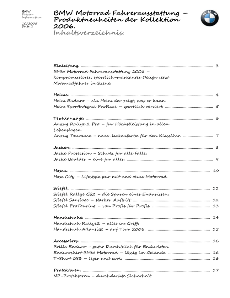BMW PresseInformation 10/2005 Seite 2 BMW Motorrad Fahrerausstattung – Produktneuheiten der Kollektion 2006. Inhaltsverzeichnis. Einleitung. ............................................................................................................................ 3 BMW Motorrad Fahrerausstattung 2006 – kompromissloses, sportlich-markantes Design setzt Motorradfahrer in Szene. Helme. ..................................................................................................................................... 4 Helm Enduro – ein Helm der zeigt, was er kann. Helm SportIntegral ProRace – sportlich versiert. ............................................. 5 Textilanzüge. ....................................................................................................................... 6 Anzug Rallye 2 Pro – für Höchstleistung in allen Lebenslagen. Anzug Tourance – neue Jackenfarbe für den Klassiker. ............................ 7 Jacken. .................................................................................................................................... 8 Jacke Protection – Schutz für alle Fälle. Jacke Boulder – eine für alles. ................................................................................. 9 Hosen. ................................................................................................................................... 10 Hose City – Lifestyle pur mit und ohne Motorrad. Stiefel. .................................................................................................................................. 11 Stiefel Rallye GS2 – die Spuren eines Enduristen. Stiefel Santiago – starker Auftritt. ........................................................................ 12 Stiefel ProTouring – von Profis für Profis. ...................................................... 13 Handschuhe. ..................................................................................................................... 14 Handschuh Rallye2 – alles im Griff. Handschuh Atlantis2 – auf Tour 2006. .......................................................... 15 Accessoires. ......................................................................................................................... 16 Brille Enduro – guter Durchblick für Enduristen. Enduroshirt BMW Motorrad – lässig im Gelände. ....................................... 16 T-Shirt GS3 – leger und cool. ................................................................................ 16 Protektoren. ....................................................................................................................... 17 NP-Protektoren – durchdachte Sicherheit. BMW PresseInformation 10/2005 Seite 3 Gepäck. ................................................................................................................................ 18 Tasche Giant – oder: 90–40–40. Hip Bag – ganz schön praktisch. ........................................................................... 18 BMW PresseInformation 10/2005 Seite 4 Einleitung. BMW Motorrad Fahrerausstattung 2006 – kompromissloses, sportlich-markantes Design setzt Motorradfahrer in Szene. Ganz im Zeichen der sportlichen Ausrichtung der BMW Motorräder sorgt die BMW Motorrad Fahrerausstattung 2006 mit durchdachten und flotten Akzenten für das passende Outfit. So geben im Programm der BMW Motorrad Fahrerausstattung ab Frühjahr 2006 sichtlich dynamisch anmutende Produkte den Ton an. Die neue BMW Endurokollektion, bestehend aus dem Helm Enduro, dem Anzug Rallye 2 Pro, Stiefel GS2 sowie dem Handschuh Rallye 2 und diversen Accessoires, bietet sportlichambitionierten Fahrern rundum Schutz und Komfort. Die uneingeschränkte Bewegungsfreiheit – für engagierte Fahrmanöver im Gelände unerlässlich – wird durch den richtigen Schnitt und ausgesuchte Materialien gewährleistet. Die mit Sorgfalt und Liebe zum Detail erstellte Kollektion ist beispielhaft für die hohe Qualität, die die gesamte Produktpalette der BMW Fahrerausstattung bestimmt. Ebenso neu im Programm und ein echter Sportler ist der Helm SportIntegral ProRace. Ganz auf temperamentvolles Fahren abgestimmt, bietet er seinem Träger optimalen Schutz und beste Passform. Passend dazu findet sich in der BMW Motorrad Fahrerausstattung 2006 der Lederanzug ProRace wieder, der bereits seit letztem Jahr auf dem Markt ist. Passive Sicherheit ist ein besonders wichtiger Aspekt in der attraktiven Kollektion. Die von BMW Motorrad neu entwickelten Protektoren sind das Ergebnis vielfältiger Tests und Untersuchungen. Geschützt werden damit vor allem die Gelenke und im Falle der Jacke Protection außerdem Rücken, Brustkorb und Schulterpartie. Auf dem neuesten Stand der Technik bieten diese weiterentwickelten Protektoren gegenwärtig den besten Schutz für Motorradfahrer. BMW PresseInformation 10/2005 Seite 5 BMW PresseInformation 10/2005 Seite 6 Helme. Helm Enduro – ein Helm der zeigt, was er kann. Das futuristische Design des Helms Enduro folgt in der Formensprache den geländegängigen Maschinen von BMW Motorrad. In Sachen Aerodynamik ist der Helm sowohl mit als auch ohne Schirm richtungweisend. Er liegt neutral im Luftstrom und hat nur einen geringen Luftwiderstand, auch wenn der Fahrer den Kopf dreht. Das im Nu abnehmbare Visier ist dreidimensional geformt und bietet damit nicht nur ein optimales Strömungsverhalten, sondern auch ein Höchstmaß an Sicherheit. Die Kratzfestigkeit übertrifft die Anforderungen der ECE um ein Vielfaches. Des Weiteren werden sowohl vom getönten, als auch vom klaren und vom verspiegelten Visier nahezu 100 Prozent der UVA- und UVB-Strahlung absorbiert. Bei nur 1390 Gramm Gewicht trägt sich der Helm Enduro sehr komfortabel – selbst bei sportlicher Höchstleistung bleibt er ein sehr angenehmer Kopfschutz. Die Schutzfunktion des Helms wird durch die Verarbeitung erstklassiger Materialien garantiert. Die Außenschale besteht aus e