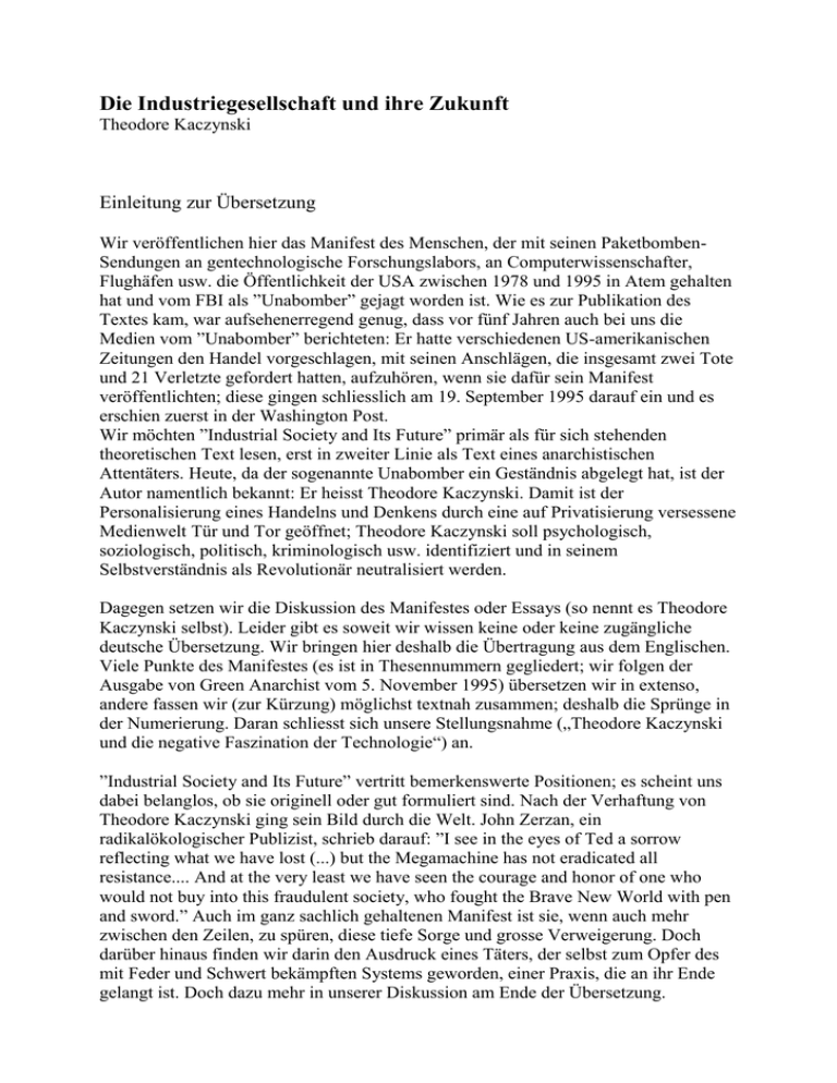 Die Industriegesellschaft und ihre Zukunft Theodore Kaczynski Einleitung zur Übersetzung Wir veröffentlichen hier das Manifest des Menschen, der mit seinen PaketbombenSendungen an gentechnologische Forschungslabors, an Computerwissenschafter, Flughäfen usw. die Öffentlichkeit der USA zwischen 1978 und 1995 in Atem gehalten hat und vom FBI als ”Unabomber” gejagt worden ist. Wie es zur Publikation des Textes kam, war aufsehenerregend genug, dass vor fünf Jahren auch bei uns die Medien vom ”Unabomber” berichteten: Er hatte verschiedenen US-amerikanischen Zeitungen den Handel vorgeschlagen, mit seinen Anschlägen, die insgesamt zwei Tote und 21 Verletzte gefordert hatten, aufzuhören, wenn sie dafür sein Manifest veröffentlichten; diese gingen schliesslich am 19. September 1995 darauf ein und es erschien zuerst in der Washington Post. Wir möchten ”Industrial Society and Its Future” primär als für sich stehenden theoretischen Text lesen, erst in zweiter Linie als Text eines anarchistischen Attentäters. Heute, da der sogenannte Unabomber ein Geständnis abgelegt hat, ist der Autor namentlich bekannt: Er heisst Theodore Kaczynski. Damit ist der Personalisierung eines Handelns und Denkens durch eine auf Privatisierung versessene Medienwelt Tür und Tor geöffnet; Theodore Kaczynski soll psychologisch, soziologisch, politisch, kriminologisch usw. identifiziert und in seinem Selbstverständnis als Revolutionär neutralisiert werden. Dagegen setzen wir die Diskussion des Manifestes oder Essays (so nennt es Theodore Kaczynski selbst). Leider gibt es soweit wir wissen keine oder keine zugängliche deutsche Übersetzung. Wir bringen hier deshalb die Übertragung aus dem Englischen. Viele Punkte des Manifestes (es ist in Thesennummern gegliedert; wir folgen der Ausgabe von Green Anarchist vom 5. November 1995) übersetzen wir in extenso, andere fassen wir (zur Kürzung) möglichst textnah zusammen; deshalb die Sprünge in der Numerierung. Daran schliesst sich unsere Stellungsnahme („Theodore Kaczynski und die negative Faszination der Technologie“) an. ”Industrial Society and Its Future” vertritt bemerkenswerte Positionen; es scheint uns dabei belanglos, ob sie originell oder gut formuliert sind. Nach der Verhaftung von Theodore Kaczynski ging sein Bild durch die Welt. John Zerzan, ein radikalökologischer Publizist, schrieb darauf: ”I see in the eyes of Ted a sorrow reflecting what we have lost (...) but the Megamachine has not eradicated all resistance.... And at the very least we have seen the courage and honor of one who would not buy into this fraudulent society, who fought the Brave New World with pen and sword.” Auch im ganz sachlich gehaltenen Manifest ist sie, wenn auch mehr zwischen den Zeilen, zu spüren, diese tiefe Sorge und grosse Verweigerung. Doch darüber hinaus finden wir darin den Ausdruck eines Täters, der selbst zum Opfer des mit Feder und Schwert bekämpften Systems geworden, einer Praxis, die an ihr Ende gelangt ist. Doch dazu mehr in unserer Diskussion am Ende der Übersetzung. 1. Die industrielle Revolution und ihre Folgen sind ein Desaster für die Menschheit. 2. 3. 4. 5. Sie haben die Lebenserwartung der Bewohner der fortgeschrittenen Länder massiv erhöht, die Gesellschaft hingegen destabilisiert; sie haben das Leben unerfüllt, das menschliche Dasein würdelos gemacht, zu weitverbreiteten psychologischen Leiden geführt. (dies auch in der Dritten Welt) und sie haben der Natur schweren Schaden zugefügt. Die weitergehende technologische Entwicklung wird die Situation noch verschlechtern. Sie wird mit Sicherheit die Menschen noch grösseren Unwürdigkeiten unterwerfen, noch grösseren Schaden an der Natur anrichten, möglicherweise zu grössern gesellschaftlichen Brüchen und grösserem psychischen Leiden führen, ja könnte sogar das physische Leiden in den ”fortgeschrittenen” Ländern anwachsen lassen.. Das industriell-technologische System kann überleben oder zusammenbrechen. Im ersten Fall könnte es vielleicht einen tiefen Pegel physischen und psychischen Leidens erlangen, aber nur nach dem Durchgang durch eine lange und sehr schmerzliche Periode der Anpassung und nur mit der permanenten Reduktion der Menschen und vieler anderer Organismen auf technische Produkte und blosse Rädchen in der Gesellschaftsmaschinerie. Die weiteren Folgen werden aber unausweichlich sein: Keine Reform oder Modifikation wird das System davon abhalten, Menschen ihrer Würde und Autonomie zu berauben. Falls das System hingegen zusammenbricht, werden die Konsequenzen ebenfalls sehr schmerzlich sein. Der Zusammenbruch wird um so grösser sein, je mächtiger das System angewachsen ist; somit wäre es am besten, es bräche möglichst bald zusammen. Wir vertreten deshalb die Idee einer Revolution gegen das Industriesystem. Sie kann Gewalt anwenden, muss aber nicht unbedingt. Sie kann plötzlich ablaufen oder sich über einige Jahrzehnte erstrecken. Darüber können wir nichts aussagen. Doch wir möchten ganz allgemein die Massnahmen aufzeigen, welche diejenigen, die das industrielle System hassen, ergreifen sollten, um den Weg für eine Revolution gegen diese Form der Gesellschaft vorzubereiten. Es wird keine politische Revolution sein. Ihr Ziel wird es sein, nicht Regierungen, sondern Ökonomie und technologische Basis der gegenwärtigen Gesellschaft umzustürzen. Im vorliegenden Manifest beachten wir nur einige der negativen Entwicklungen, welche das industriell-technologische System genommen hat. Andere werden wir nur am Rand erwähnen. Das heisst nicht, wir betrachteten diese als unwesentlich. Nur aus praktischen Gründen beschränken wir hier die Diskussion auf Themen, welche ungenügende öffentliche Aufmerksamkeit erlangt haben oder zu denen wir Neues zu sagen haben. So äussern wir uns zur Degradation und Zerstörung der Wildnis kaum, da es eine gut entwickelte Umwelt- und Wildnisbewegung gibt. Die Psychologie der Linken 6. Wohl die meisten Menschen we