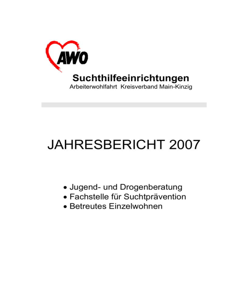 Suchthilfeeinrichtungen Arbeiterwohlfahrt Kreisverband Main-Kinzig JAHRESBERICHT 2007 Jugend- und Drogenberatung Fachstelle für Suchtprävention Betreutes Einzelwohnen Inhaltsverzeichnis SEITE Suchthilfeeinrichtungen - Anschrift -Sprechzeiten 3 Einleitung Kurzer Rückblick auf 25 Jahre Jugend- und Drogenberatung 4 5-6 Jugend- und Drogenberatung Psychosoziale Betreuung von substituierten Opiatabhängigen Betreutes Einzelwohnen Fachstelle für Suchtprävention Jugend- und Drogenberatung Träger/Finanzierung/Mitarbeiter/innen Leistungen und Angebote Statistik Fachtagung „Kinder aus suchtbelasteten Familien“ Psychosoziale Beratung von Substituierten Informationen Bericht zur psychosozialen Beratungssprechstunde Betreutes Einzelwohnen Träger / Finanzierung / Mitarbeiter / Gesetzliche Grundlage / Aufgaben und Ziele Personalsituation und Rahmenbedingungen Klienten/Klientinnen / Jahresüberblick / Kooperation Fachstelle für Suchtprävention Informationen zur Fachstelle für Suchtprävention Angebote der Fachstelle Arbeitsbericht der Fachstelle für Suchtprävention Statistik 2007 / Gremien Pressespiegel 2 7 19 25 35 7 8 9 10 - 15 16 - 17 18 19 20 - 23 24 25 26 - 27 28 - 29 29 - 32 33 34 35 36 - 37 38 - 42 43 - 59 Arbeiterwohlfahrt – Kreisverband Main-Kinzig e.V. SUCHTHILFEEINRICHTUNGEN Berliner Strasse 45, 63571 Gelnhausen Leitung der Suchthilfeeinrichtungen: Günter Roth, Dipl.-Sozialarbeiter r.BSA Telefon: 0 60 51 / 91 55 88-0 FAX: 0 60 51 / 91 55 88-5 e-Mail: [email protected] www.suchthilfe-awo-mk.de JUGEND- UND DROGENBERATUNG GELNHAUSEN – SCHLÜCHTERN Ansprechpartner: Günter Roth, Dipl.-Sozialarbeiter r.BSA Leiter der Suchthilfeeinrichtungen e-Mail:[email protected] Termine nach Vereinbarung Jugendsprechstunde: Dienstag und Donnerstag von 13.00 bis 15:00 Uhr Unser Beratungsangebot in Schlüchtern Jugendcafé der Stadt Schlüchtern Schlossstraße 18 (1. Stock) 36381 Schlüchtern Termine nur über die Beratungsstelle in Gelnhausen BETREUTES EINZELWOHNEN Ansprechpartner/in: Birgit Tragesser, Sozialberaterin, Psychotherapeutin HPG, e-Mail:[email protected] Natalie Diehl, Dipl.-Sozialpädagogin (ab 01.07.2008) Edgar Zeissler, Dipl.-Sozialpädagoge (bis 30.06.2008) e-Mail: [email protected] Termine nur nach Vereinbarung FACHSTELLE FÜR SUCHTPRÄVENTION Ansprechpartnerin: Dagmar Wieland, Dipl.-Pädagogin Leiterin der Fachstelle e-Mail:[email protected] Termine nur nach Vereinbarung 3 EINLEITUNG 25 - Jahre Jugend- und Drogenberatung Mit dem Jahresbericht der AWO-Suchthilfeeinrichtungen möchten wir Sie wieder über die im vergangenen Jahr geleistete Arbeit informieren. Den Zahlen ist zu entnehmen, dass die AWO-Suchthilfeeinrichtungen 2007 stark frequentiert wurden. Das hohe Leistungsvolumen der vergangenen Jahre konnte trotz der seit 2004 dünner gewordenen Personaldecke in der Beratung und der Prävention gehalten werden. Durch die Aktivitäten in der Substitutionsambulanz des Kreises hat sich die Gesamtzahl der Ratsuchenden sogar um 20 Personen erhöht. Bereits geplante Projekte zur Frühintervention und Sekundärprävention konnten auch 2007 leider noch nicht verwirklicht werden. Im Jahr 2008 werden wir das Projekt „HaLT“ (Hart am Limit) starten, ein Angebot das sich u.a. an Kinder und Jugendliche und deren Eltern richtet die mit einer Alkoholintoxikation in die Klinik für Kinder- und Jugendmedizin eingeliefert wurden. Sie sehen, dass wir weiterhin bemüht sind für unsere von Suchtproblemen betroffenen Bürgerinnen und Bürger eine akzeptable Grundversorgung zu gewährleisten und weiter zu entwickeln. Wir bitten daher alle die in Politik und Verwaltung Einfluss haben und Verantwortung tragen, die AWO beim Erhalt und Ausbau ihrer Suchthilfeeinrichtungen zu unterstützen, damit im mittleren und östlichen Main-Kinzig-Kreis ein ausreichendes Hilfeangebot zur Verfügung steht. Neben allen Wünschen und Forderungen ist es uns aber auch wichtig alle denen herzlichen Dank zu sagen, die unsere Arbeit in den vergangenen 25 Jahren durch finanzielle und ideelle Unterstützung ermöglicht haben. Neben dem Kreisverband Main-Kinzig der Arbeiterwohlfahrt sind das vor allem der Main-Kinzig-Kreis mit dem Landrat und den Kreisbeigeordneten an der Spitze und einige Kommunen (Gelnhausen, Schlüchtern, Hasselroth, Steinau und Linsengericht), der Förderverein Suchtprävention, das Land Hessen für die Prävention, der LWV Hessen für das Betreute Wohnen und weitere Unterstützer. Allen ehrenamtlich Tätigen und beruflichen Kooperationspartnern danken wir ebenfalls für die gute Zusammenarbeit und die wohlwollende Unterstützung. 4 Kurzer Rückblick auf 25 Jahre Jugend- und Drogenberatung Ein unvollständigen Schnelldurchgang durch unsere Geschichte. Wie kam es 1982 zu dieser Einrichtung?: Wie war die Lage Ende der 70er Jahre? Die Drogendelikte in der Region nahmen zu, wegen des polizeilichen Drucks wich die Szene vom Raum Frankfurt ins Umland aus auch im östlichen MKK bildete sich von Hanau ausgehend eine beachtliche Drogenszene. Eröffnung: In Gelnhausen, Vor dem Schifftor 4, auf knapp 50 m² haben wir begonnen – der damalige Landrat Hans Rüger sagte bei der Eröffnung: „Wenn ihr im Jahr nur drei Abhängigen helft aus der Sucht auszusteigen hat sich die Investition schon gelohnt“. Aber das sahen nicht alle so: Im Vorfeld waren große Widerstände zu überwinden, im Verband und auf der politischen Ebene, es war viel Überzeugungsarbeit notwendig bis es dann so weit war. Und diese Vorbereitung wurde in erster Linie von Otto Mohn geleistet, damals Vorsitzender des AWO-Kreisverbands, er war der Motor des Ganzen, zusammen mit dem damalige Drogenbeauftragte der Hessischen Landesregierung Wolfgang Winckler, der leider schon verstorben ist. Angefangen mit der Beratungsarbeit haben Esther May und Günter Roth als Beraterin und Berater und Karin Krenz als Verwaltungsangestellte mit halber Stelle. Esther May (verh. Ames) hat die Beratungsstelle im Oktober 2003 verlassen. Karin Krenz und Günter Roth 