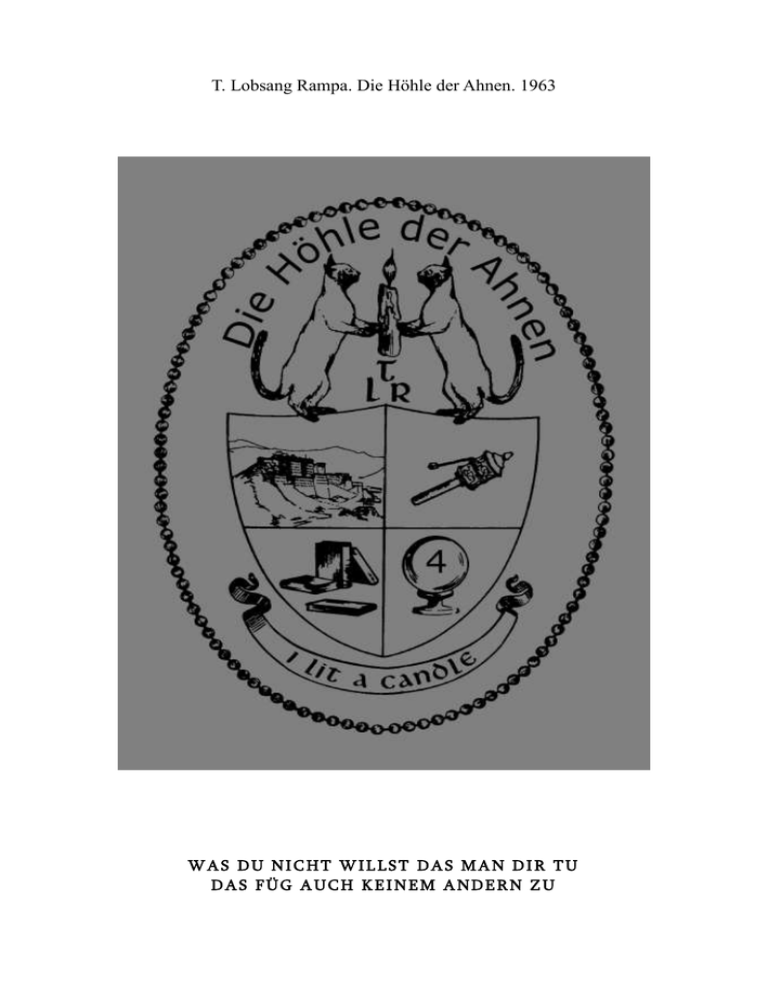 T. Lobsang Rampa. Die Höhle der Ahnen. 1963 WAS DU NICHT WILLST DAS MAN DIR TU DAS FÜG AUCH KEINEM ANDERN ZU T. Lobsang Rampa. Die Höhle der Ahnen. 1963 INHALT VORWORT.............................................................................................................5 KAPITEL EINS.......................................................................................................7 KAPITEL ZWEI...................................................................................................23 KAPITEL DREI....................................................................................................38 KAPITEL VIER.....................................................................................................58 KAPITEL FÜNF....................................................................................................77 KAPITEL SECHS..................................................................................................97 KAPITEL SIEBEN..............................................................................................120 KAPITEL ACHT..................................................................................................142 KAPITEL NEUN.................................................................................................168 KAPITEL ZEHN..................................................................................................188 KAPITEL ELF......................................................................................................209 KAPITEL ZWÖLF...............................................................................................221 T. Lobsang Rampa. Die Höhle der Ahnen. 1963 DIE UNGLAUBLICHE WAHRHEIT Wenige Bücher haben in den letzten Jahren mehr Kontroverse geweckt, als Lobsang Rampas DAS DRITTE AUGE, und die anderen Werke, die aus seiner Feder stammen. Der Grund ist einfach genug. Wenn ein Engländer behauptet, dass sein Körper durch den Geist eines tibetischen Lama übernommen wurde, so kann er vernünftigerweise Hohn erwarten. Wenn er darüber hinaus außergewöhnlich, sehr detaillierte Erfahrungen erzählt, die den Besitz von persönlichen Befugnissen ganz außerhalb der Naturgesetze voraussetzen, wie wir sie verstehen, wird die Reaktion nicht überraschend, ein Aufruhr. Aber Aufstände dieser Art entspringen manchmal aus der Unwissenheit. Ein Einblick in das, was bislang nicht bekannt war ist immer beunruhigend. Die Tatsache, dass Dr. Rampa jetzt viele Tausende von Lesern auf der ganzen Welt hat ist ein Beweis, dass nicht alle Köpfe gegen das Unbekannte verschlossen sind. Es ist für diese große Masse der Leser - und nicht weniger, für die Skeptiker, die nicht in der Lage gewesen sind, seine Geschichte zu widerlegen noch durch ihr Wissen zu erklären, dass die Geschichte nicht wahr ist, die Dr. Rampa in seinem dritten Buch schrieb. DIE RAMPA STORY ist Lobsang Rampas Antwort auf all seine Kritiker, und jede Seite ist seine unerschütterliche Garantie für die WAHRHEIT T. Lobsang Rampa. Die Höhle der Ahnen. 1963 VORWORT Dieses Buch handelt über das Okkulte und des Menschen Macht. Es ist ein leicht verständliches Buch, das weder »Fremdwörter«, Sanskrit noch künstliche Sprachen enthält. Die Durchschnittsperson möchte gerne über die Dinge Bescheid wissen und nicht Worte erraten müssen, die der durchschnittliche Autor selbst nicht versteht! Wenn ein Autor seine Arbeit versteht, kann er auch in einer Sprache schreiben, ohne daß er den Mangel an Kenntnis mit einem Fremdwort auskleiden muß. Viel zu viele Leute lassen sich auf faulen Zauber ein. Die Gesetze des Lebens sind wirklich einfach. Es besteht daher nicht die geringste Notwendigkeit, sie mit mystischen Kults und Pseudoreligionen zu verschönern, noch besteht für irgendjemand die Notwendigkeit, Anspruch auf göttliche Offenbarungen zu erheben. JEDERMANN kann dieselben »Offenbarungen« haben, wenn er daran arbeitet. Keine Religion hält den alleinigen Schlüssel zum Himmel, noch wird man für immer verdammt, nur weil man die Kirche mit einem Hut anstelle ohne Schuhe betritt. In Tibet tragen die Lamaklöstereingänge die Inschrift: Tausend Mönche, tausend Religionen. Es spielt keine Rolle, an was man glaubt, solange es beinhaltet: Was du nicht willst, das man dir tu‘, das füg auch keinem anderen zu — und man wird DURCHKOMMEN, wenn man abberufen wird. Einige sagen, daß man inneres Wissen nur dann erreichen kann, wenn man sich diesem oder jenem Kult anschließt und obendrein noch eine beträchtliche Summe bezahlt. Doch die Gesetze des Lebens besagen: »Suche, und du wirst finden.« Dieses Buch ist die Frucht eines langen Lebens, einer auserlesenen Ausbildung in den größeren Lamaklöstern Tibets sowie einer Kraft, die aufgrund sehr streng befolgter Regeln erlangt wurde. Dies ist Wissen, das die Ahnen längst vergangener Zeiten lehrten und in den Pyramiden von Ägypten, den hohen Tempeln der Anden und dem größten Verwahrungsort des okkulten Wissens auf der Welt, im Hochland Tibets, niedergeschrieben ist.5 T. Lobsang Rampa. Die Höhle der Ahnen. 1963 KAPITEL EINS Der Abend war warm. Herrlich und ungewöhnlich warm für diese Jahreszeit. Leicht und sanft stieg in der windstillen Luft der süße Duft des Weihrauches auf und verlieh unserm Gemüt Ruhe. Weit weg hinter den hohen Gipfeln der Himalajas ging in strahlender Pracht die Sonne unter und färbte die schneebedeckten Bergspitzen blutrot, wie als Warnung des Blutes in dem Tibet dereinst baden würde. Die sich verlängernden Schatten krochen langsam von den Doppeltürmen des Potala der Stadt Lhasa und unserm eigenen Chakpori zu. Unter uns, zur Rechten, nahm eine von der Nacht überraschten Karawane indischer Händler den Weg zum Pargo Kaling oder Westtor auf. Mit einer unziemlichen Hast absolvierten auf der Lingkorstraße noch die letzten gläubigen Pilger ihren Rundgang, so als ob sie Angst hätten, von der samtenen Dunkelheit der schnell hereinbrechenden Nacht 