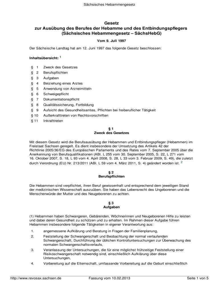 Sächsisches Hebammengesetz Gesetz zur Ausübung des Berufes der Hebamme und des Entbindungspflegers (Sächsisches Hebammengesetz – SächsHebG) Vom 9. Juli 1997 Der Sächsische Landtag hat am 12. Juni 1997 das folgende Gesetz beschlossen: Inhaltsübersicht: 1 § 1 Zweck des Gesetzes § 2 Berufspflichten § 3 Aufgaben § 4 Beiziehung eines Arztes § 5 Anwendung von Arzneimitteln § 6 Schweigepflicht § 7 Dokumentationspflicht § 8 Qualitätssicherung, Fortbildung § 9 Aufsicht des Gesundheitsamtes, Pflichten bei freiberuflicher Tätigkeit § 10 Außerkrafttreten von Rechtsvorschriften § 11 Inkrafttreten §1 Zweck des Gesetzes Mit diesem Gesetz wird die Berufsausübung der Hebammen und Entbindungspfleger (Hebammen) im Freistaat Sachsen geregelt. Es dient insbesondere der Umsetzung des Artikels 42 der Richtlinie 2005/36/EG des Europäischen Parlaments und des Rates vom 7. September 2005 über die Anerkennung von Berufsqualifikationen (ABl. L 255 vom 30. September 2005, S. 22, L 271 vom 16. Oktober 2007, S. 18, L 93 vom 4. April 2008, S. 28, L 33 vom 3. Februar 2009, S. 49), die zuletzt durch Verordnung (EU) Nr. 213/2011 (ABl. L 59 vom 4. März 2011, S. 4) geändert worden ist. 2 §2 Berufspflichten Die Hebammen sind verpflichtet, ihren Beruf gewissenhaft und entsprechend dem jeweiligen Stand der medizinischen Wissenschaft auszuüben. Sie haben das Lebensrecht des Ungeborenen und die Menschenwürde der Mutter und des Neugeborenen zu achten. §3 Aufgaben (1) Hebammen haben Schwangeren, Gebärenden, Wöchnerinnen und Neugeborenen Hilfe zu leisten und dabei deren Gesundheit zu schützen und zu erhalten. Im Rahmen dieser Aufgabe führen Hebammen insbesondere folgende Tätigkeiten in eigener Verantwortung aus: 1. angemessene Aufklärung und Beratung in Fragen der Familienplanung, 2. Feststellung der Schwangerschaft und Beobachtung der normal verlaufenden Schwangerschaft, Durchführung der üblichen Kontrolluntersuchungen zur Überwachung des normalen Schwangerschaftsverlaufs, 3. Veranlassung der Untersuchungen, die für eine möglichst frühzeitige Feststellung einer Risikoschwangerschaft notwendig sind, einschließlich Aufklärung über diese Untersuchungen, 4. Vorbereitung auf die Elternschaft, umfassende Vorbereitung auf die Geburt einschließlich http://www.revosax.sachsen.de Fassung vom 10.02.2013 Seite 1 von 5 Sächsisches Hebammengesetz Beratung in Fragen der Hygiene und Ernährung, 5. Betreuung der Gebärenden während der Geburt und Überwachung des Fötus in der Gebärmutter mit Hilfe geeigneter technischer und klinischer Mittel, 6. Durchführung von Normalgeburten und bei fehlender ärztlicher Hilfe von Beckenendlagengeburten, Ausführung von Dammschnitten und Versorgung von unkomplizierten Geburtsverletzungen, 7. Untersuchung, Überwachung und Pflege des Neugeborenen im erforderlichen zeitlichen Umfang; hierzu gehören auch vorbeugende Maßnahmen sowie die Einleitung und Durchführung der erforderlichen Maßnahmen in Notfällen, insbesondere sofortige Wiederbelebung des Neugeborenen, 8. Betreuung der Wöchnerin und Überwachung des Zustandes der Mutter im erforderlichen zeitlichen Umfang sowie Beratung und Anleitung zur bestmöglichen Ernährung und Pflege des Neugeborenen, Hinweis auf ärztliche Vorsorgeuntersuchungen sowie Schutzimpfungen für Neugeborene und Säuglinge gemäß Empfehlung der Sächsischen Impfkommission, 9. Anleitung der Wöchnerin zum Stillen und Hilfe bei Stillproblemen bis zum Ende der Stillzeit, 10. Durchführung der vom Arzt verordneten Behandlung. (2) Hebammen haben Schwangere, Gebärende und Wöchnerinnen über jede beabsichtigte Maßnahme und deren Folgen aufzuklären. Bei der Aufklärung sind neben medizinischen auch soziale und psychische Faktoren zu berücksichtigen. 3 §4 Beiziehung eines Arztes (1) Hebammen haben auf Regelwidrigkeiten und Risikofaktoren zu achten und erforderlichenfalls dafür zu sorgen, daß ein Arzt beigezogen oder die Einweisung in eine Klinik veranlaßt wird. Übernimmt ein Arzt in diesen Fällen die Behandlung, haben die Hebammen den Anweisungen des Arztes Folge zu leisten. Ist in Notfällen ärztliche Hilfe nicht rechtzeitig zu erlangen, führen die Hebammen die erforderlichen Maßnahmen selbst durch. Zu diesen gehören insbesondere die manuelle Ablösung der Plazenta mit manueller Nachuntersuchung der Gebärmutter sowie die sofortige Wiederbelebung der Frauen. (2) Verlangt der Arzt von der Hebamme eine geburtshilfliche Handlung, die diesem Gesetz oder den anerkannten Regeln der Geburtshilfe widerspricht, hat diese den Arzt darauf hinzuweisen und den Sachverhalt sowie die dazu von ihr gegebene Empfehlung zu dokumentieren. Soweit es die geburtshilfliche Situation erlaubt, kann die Hebamme die Durchführung der ärztlichen Anweisung verweigern. 4 §5 Anwendung von Arzneimitteln (1) Hebammen dürfen ohne ärztliche Anweisung oder Verordnung folgende Arzneimittel unter Beachtung der Gebrauchsinformationen anwenden und verabreichen: 1. bei gegebener Indikation in der Eröffnungsperiode ein nichtverschreibungspflichtiges krampflösendes oder schmerzstillendes Medikament, das für die Geburtshilfe angezeigt ist, 2. im Falle von unkomplizierten Geburtsverletzungen ein nichtverschreibungspflichtiges Lokalanästhetikum, 3. bei Notsituationen unmittelbar vor und während der Geburt sowie in der Nachgeburtsperiode, falls ein Arzt nicht rechtzeitig zugezogen werden kann oder die rechtzeitige Einweisung in ein Krankenhaus nicht möglich ist, Medikamente, die gemäß der jeweils gültigen Anlage zur Verordnung über verschreibungspflichtige Arzneimittel zur Abgabe an Hebammen vorgesehen sind. (2) Freiberuflich tätige Hebammen haben diese Arzneimittel verfügbar zu halten. (3) Arzneimittel sind vor dem Zugriff von Unbefugten geschützt zu lagern. Die Qualität der Arzneimittel darf durch die Art und Weise der Lagerung nicht beeinflusst werden. Arzneimittel sind so zu lagern, dass insbesondere Verwechslungen ausgeschlossen werden. Unberührt b