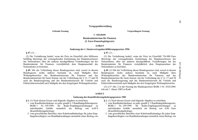 88 Textgegenüberstellung Geltende Fassung: Vorgeschlagene Fassung: 1. Abschnitt Bundesministerium für Finanzen (2. Euro-Finanzbegleitgesetz) Artikel I Änderung des 1. Staatsvertragsdurchführungsgesetzes 1956 § 47. (1) … § 47. (1) … (2) Die Veräußerung bedarf, wenn der Preis im Einzelfall 726 000 Euro übersteigt, der vorausgehenden Zustimmung des Hauptausschusses des Nationalrates; über die anderen durchgeführten Veräußerungen hat der Bundesminister für Finanzen vierteljährlich dem Hauptausschuss des Nationalrates zu berichten. § 49. Mit der Vollziehung dieses Bundesgesetzes sind, soweit in diesem Bundesgesetz nichts anderes bestimmt ist, nach Maßgabe ihres Wirkungsbereiches das Bundesministerium für Finanzen und das Bundesministerium für Justiz betraut, mit der Vollziehung der § 15, 17 und 28 auch die Bundesregierung und das Bundesministerium für Verkehr und Elektrizitätswirtschaft nach Maßgabe des dort festgelegten Wirkungsbereiches. § 49. (1) Mit der Vollziehung dieses Bundesgesetzes sind, soweit in diesem Bundesgesetz nichts anderes bestimmt ist, nach Maßgabe ihres Wirkungsbereiches das Bundesministerium für Finanzen und das Bundesministerium für Justiz betraut, mit der Vollziehung der § 15, 17 und 28 auch die Bundesregierung und das Bundesministerium für Verkehr und Elektrizitätswirtschaft nach Maßgabe des dort festgelegten Wirkungsbereiches. (2) § 47 Abs. 2 in der Fassung des Bundesgesetzes BGBl. I Nr. XXX/2001 tritt mit 1. Jänner 2002 in Kraft. Artikel 2 Änderung des Kunstförderungsbeitragsgesetzes 1981 § 1. (1) Nach diesem Gesetz sind folgende Abgaben zu entrichten: 1. vom Rundfunkteilnehmer zu jeder gemäß § 3 Rundfunkgebührengesetz, BGBl. I Nr. 159/1999, für Radio-Empfangseinrichtungen zu entrichtenden Gebühr monatlich ein Beitrag von 6,60 S (Kunstförderungsbeitrag); 2. vom gewerblichen Betreiber einer Kabelrundfunkanlage für jeden Empfangsberechtigten von Rundfunksendungen monatlich einen Beitrag von § 1. (1) Nach diesem Gesetz sind folgende Abgaben zu entrichten: 1. vom Rundfunkteilnehmer zu jeder gemäß § 3 Rundfunkgebührengesetz, BGBl. I Nr. 159/1999, für Radio-Empfangseinrichtungen zu entrichtenden Gebühr monatlich ein Beitrag von 0,48 Euro (Kunstförderungsbeitrag); 2. vom gewerblichen Betreiber einer Kabelrundfunkanlage für jeden Empfangsberechtigten von Rundfunksendungen monatlich einen Beitrag von 621 der Beilagen (2) Die Veräußerung bedarf, wenn der Preis im Einzelfall zehn Millionen Schilling übersteigt, der vorausgehenden Zustimmung des Hauptausschusses des Nationalrates; über die anderen durchgeführten Veräußerungen hat der Bundesminister für Finanzen vierteljährlich dem Hauptausschuß des Nationalrates zu berichten. Geltende Fassung: Vorgeschlagene Fassung: 3,40 S; 3. von demjenigen, der als Erster im Inland gewerbsmäßig entgeltlich durch Verkauf oder Vermietung Geräte, die zum Empfang von Rundfunksendungen über Satelliten bestimmt sind, (Satellitenreceiver, -decoder) in den Verkehr bringt, eine einmalige Abgabe von 120 S je Gerät. Ausgenommen sind jene Geräte (Decoder), die ausschließlich zum Empfang von Weitersendungen von Rundfunkprogrammen geeignet sind. § 3. (1) bis (5) … 0,25 Euro; 3. von demjenigen, der als Erster im Inland gewerbsmäßig entgeltlich durch Verkauf oder Vermietung Geräte, die zum Empfang von Rundfunksendungen über Satelliten bestimmt sind, (Satellitenreceiver, -decoder) in den Verkehr bringt, eine einmalige Abgabe von 8,72 Euro je Gerät. Ausgenommen sind jene Geräte (Decoder), die ausschließlich zum Empfang von Weitersendungen von Rundfunkprogrammen geeignet sind. § 3. (1) bis (5) … (6) Von den Abgaben gemäß Abs. 1 Abs. 2 und 3 sind die Unternehmen in jenen Kalenderjahren befreit, in denen die nach diesen Bestimmungen insgesamt zu leistende Abgabe den Betrag von 12 000 S nicht übersteigt. § 6. (1) bis (3) … (6) Von den Abgaben gemäß Abs. 1 Abs. 2 und 3 sind die Unternehmen in jenen Kalenderjahren befreit, in denen die nach diesen Bestimmungen insgesamt zu leistende Abgabe den Betrag von 872 Euro nicht übersteigt. § 6. (1) bis (3) … Artikel 3 Änderung des Überweisungsgesetzes § 7. Wer als Verantwortlicher (§ 9 VStG) eines Dienstleisters (§ 1) eine gemäß §2 gebotene Information unterläßt, begeht, eine Verwaltungsübertretung und ist von der Behörde mit Geldstrafe bis zu 10 000 S zu bestrafen. § 8. Dieses Bundesgesetz tritt am 13. August 1999 in Kraft. § 7. Wer als Verantwortlicher (§ 9 VStG) eines Dienstleisters (§ 1) eine gemäß §2 gebotene Information unterlässt, begeht eine Verwaltungsübertretung und ist von der Behörde mit Geldstrafe bis zu 726 Euro zu bestrafen. 621 der Beilagen (4) § 1 Abs. 1 Z 1, Z 2 und Z 3 sowie § 3 Abs. 6 in der Fassung BGBl. I Nr. XXX/2001 treten mit 1. Jänner 2002 in Kraft. § 8. (1) Dieses Bundesgesetz tritt am 13. August 1999 in Kraft. (2) § 7 in der Fassung des Bundesgesetzes BGBl. I Nr. XXX/2001 tritt mit 1. Jänner 2002 in Kraft. Artikel 4 Änderung des Finalitätsgesetzes § 21. Die Teilnehmer, einschließlich der indirekten Teilnehmer, jedes Systems haben sich der Oesterreichischen Nationalbank gegenüber als Teilnehmer oder als indirekte Teilnehmer zu deklarieren. Jede Änderung in der Teilnehmerschaft oder der indirekten Teilnehmerschaft ist vom jeweiligen 89 § 21. Die Teilnehmer, einschließlich der indirekten Teilnehmer, jedes Systems haben sich der Oesterreichischen Nationalbank gegenüber als Teilnehmer oder als indirekte Teilnehmer zu deklarieren. Jede Änderung in der Teilnehmerschaft oder der indirekten Teilnehmerschaft ist vom jeweiligen Geltende Fassung: Vorgeschlagene Fassung: Teilnehmer der Oesterreichischen Nationalbank unverzüglich mitzuteilen. Wer, diese Mitteilungen unterläßt, begeht, eine Verwaltungsübertretung und ist von der Behörde mit Geldstrafe bis zu 300 000 S zu bestrafen. § 23. Dieses Bundesgesetz tritt am 10. Dezember 1999 in Kraft. Teilnehmer der Oesterreichis
