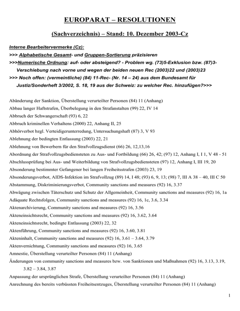 EUROPARAT – RESOLUTIONEN (Sachverzeichnis) – Stand: 10. Dezember 2003-Cz Interne Bearbeitervermerke (Cz): >>> Alphabetische Gesamt- und Gruppen-Sortierung präzisieren >>>Numerische Ordnung: auf- oder absteigend? - Problem wg. (73)5-Exklusion bzw. (87)3Verschiebung nach vorne und wegen der beiden neuen Rec (2003)22 und (2003)23 >>> Noch offen: (vermeintliche) (84) 11-Rec- (Nr. 14 – 24) aus dem Bundesamt für Justiz/Sonderheft 3/2002, S. 18, 19 aus der Schweiz: zu welcher Rec. hinzufügen?>>> Abänderung der Sanktion, Überstellung verurteilter Personen (84) 11 (Anhang) Abbau langer Haftstrafen, Überbelegung in den Strafanstalten (99) 22, IV 14 Abbruch der Schwangerschaft (93) 6, 22 Abbruch kriminellen Verhaltens (2000) 22, Anhang II, 25 Abhörverbot bzgl. Verteidigerunterredung, Untersuchungshaft (87) 3, V 93 Ablehnung der bedingten Entlassung (2003) 22, 21 Ablehnung von Bewerbern für den Strafvollzugsdienst (66) 26, 12,13,16 Abordnung der Strafvollzugsbediensteten zu Aus- und Fortbildung (66) 26, 42; (97) 12, Anhang I, I 1, V 48 - 51 Abschlussprüfung bei Aus- und Weiterbildung von Strafvollzugsbediensteten (97) 12, Anhang I, III 19, 20 Absonderung bestimmter Gefangener bei langen Freiheitsstrafen (2003) 23, 19 Absonderungsverbot, AIDS-Infektion im Strafvollzug (89) 14, I 48; (93) 6, 9, 13; (98) 7, III A 38 – 40, III C 50 Abstammung, Diskriminierungsverbot, Community sanctions and measures (92) 16, 3.37 Abwägung zwischen Täterschutz und Schutz der Allgemeinheit, Community sanctions and measures (92) 16, 1a Adäquate Rechtsfolgen, Community sanctions and measures (92) 16, 1c, 3.6, 3.34 Aktenarchivierung, Community sanctions and measures (92) 16, 3.56 Akteneinsichtsrecht, Community sanctions and measures (92) 16, 3.62, 3.64 Akteneinsichtsrecht, bedingte Entlassung (2003) 22, 32 Aktenführung, Community sanctions and measures (92) 16, 3.60, 3.81 Akteninhalt, Community sanctions and measures (92) 16, 3.61 – 3.64, 3.79 Aktenvernichtung, Community sanctions and measures (92) 16, 3.65 Amnestie, Überstellung verurteilter Personen (84) 11 (Anhang) Änderungen von community sanctions and measures bzw. von Sanktionen und Maßnahmen (92) 16, 3.13, 3.19, 3.82 – 3.84, 3.87 Anpassung der ursprünglichen Strafe, Überstellung verurteilter Personen (84) 11 (Anhang) Anrechnung des bereits verbüssten Freiheitsentzuges, Überstellung verurteilter Personen (84) 11 (Anhang) 1 Anwesenheitsrecht der Eltern im Falle der Polizei-/Untersuchungshaft (2003) 20, III 15 Ältere Strafgefangene, lange Freiheitsstrafen (2003) 23, 28, 29 Ärzte (66) 26, 33 Ärztliche Anamnese (87) 3, II 29, IV 71 Ärztliche Aufsicht, Zwangsmittel (87) 3, II 39 Ärztliche Behandlungspflicht, AIDS-Infektion im Strafvollzug (89) 14, II 71 - 73 Ärztliche Beobachtung und Behandlung, Psychisch kranke Straftäter (87) 3, V 100 Ärztliche Betreuung bei polizeilicher Vernehmung (2003) 20, III 15 Ärztliche Diagnose (87) 3, II 29 Ärztliche Eignungsuntersuchung, Arbeiten im Strafvollzug (87) 3, IV 71 Ärztliche Kontrolle, Disziplinartauglichkeit (87) 3, II 38 Ärztliche Schweigepflicht, Gesundheitsfürsorge im Strafvollzug (98) 7, I C 13 Ärztliche Standesregeln, AIDS-Infektion und andere übertragbare Krankheiten sowie Gesundheitsfürsorge im Strafvollzug (89) 14, II 72, 73; (93) 6, 3, 8, 16, 25, 30; (98) 7, III E 63 Ärztliche Versorgung während der Polizei-/Untersuchungshaft (2003) 20, III 19 Ärztlicher Bericht (87) 3, II 10, 31; (93) 6, 25 Ärztliches Berufsethos, Gesundheitsfürsorge im Strafvollzug (98) 7, I D 19 Ärztliches Zweitgutachten, Gesundheitsfürsorge im Strafvollzug (98) 7, I C 17 Ärztliche Betreuung im Strafvollzug (98) 7: Absonderungsverbot III A 38 – 40, III C 50 AIDS-Infektion und andere übertragbare Krankheiten im Strafvollzug (89) 14; (93) 6, 4, 8, 12; (98) 7, III A 40 Alkoholabhängigkeit I A 7, III B 43 - 47 Allgemeinärztliche Behandlung I B 10 Ältere Strafgefangene III C 50; (2003) 23, 28, 29 Ambulante Beratung I A 3, I A 7 Analphabeten II B 26 Anamnese (87) 3, II 29, IV 71 Angleichungsgrundsatz I B 10, 11, I C 13, I C 16, I C 19, I D 22, III A 41, III A 45, III G 67 Anonyme Untersuchung bzw. Reihenuntersuchung II B 28, III A 37 Anschlussbehandlung bzw. -therapie III B 43, III D 54, 59 Anstaltsarzt I B 10, II A 23, II D 34, III B 44, III E 72, 73(66) 26, 33 Anstaltsordnung II B 26 Ansteckungsgefahr III A 36, 40 Anwesenheitspflicht von ärztlichem Personal I A 4 2 Ärztliche Schweigepflicht I C 13 Ärztliche Standesregeln III E 63 Ärztliches Berufsethos I D 19 Ärztliches Zweitgutachten I C 17 Arztwahlrecht für Untersuchungsgefangene I C 17 Aufklärung durch den Arzt I C 14, III A 42 Aufklärung über die gesundheitlichen Folgen eines Behandlungsabbruchs III E 60 Aufklärung über die gesundheitlichen Folgen eines Hungerstreiks III E 62 Aufnahme in den Vollzug I A 1, II C 30 Aufsicht durch die Gesundheitsbehörde I D 21 Aufsicht, Zwangsmittel (87) 3, II 39 Bauliche Veränderungen für ältere und körperbehinderte Strafgefangene III C 50 Begleitung von Strafgefangenen in ein Krankenhaus I A 9 Begnadigung Sterbender III C 51 Behandlung von Alkohol-, Drogen und Medikamentenabhängigen I A 7, III B 43 – 47 Behandlung von Sexualstraftätern III D 54 Behandlungspflicht, AIDS-Infektion im Strafvollzug (89) 14, II 71 - 73 Behandlungsverweigerung durch den Strafgefangenen I C 15, III E 60 Behinderte Strafgefangene III C 50 Beratung der Anstaltsleitung durch Anstaltsarzt II A 24 Beratung der Strafgefangenen nach Teilnahme an einem HIV-, Hepatitis- bzw. Tuberkulose-Test II B 28, III A 37 Beratung von Alkohol-, Drogen und Medikamentenabhängigen I A 7, III B 43, 47 Bericht (87) 3, II 10, 31; (93) 6, 25 Berichterstattungspflicht bei Gewalt gegenüber Strafgefangenen II C 32 Berufsethos des Arztes I D 19 Beruhigungsmittel III D 57 Besuche bei AIDS-infizierten Strafgefangenen III G 68 Besuchsüberwachung III G 68 Betreuung von Privatpatienten (66) 26, 33 Betreuung von psychisch kranken Straftätern (87) 3,