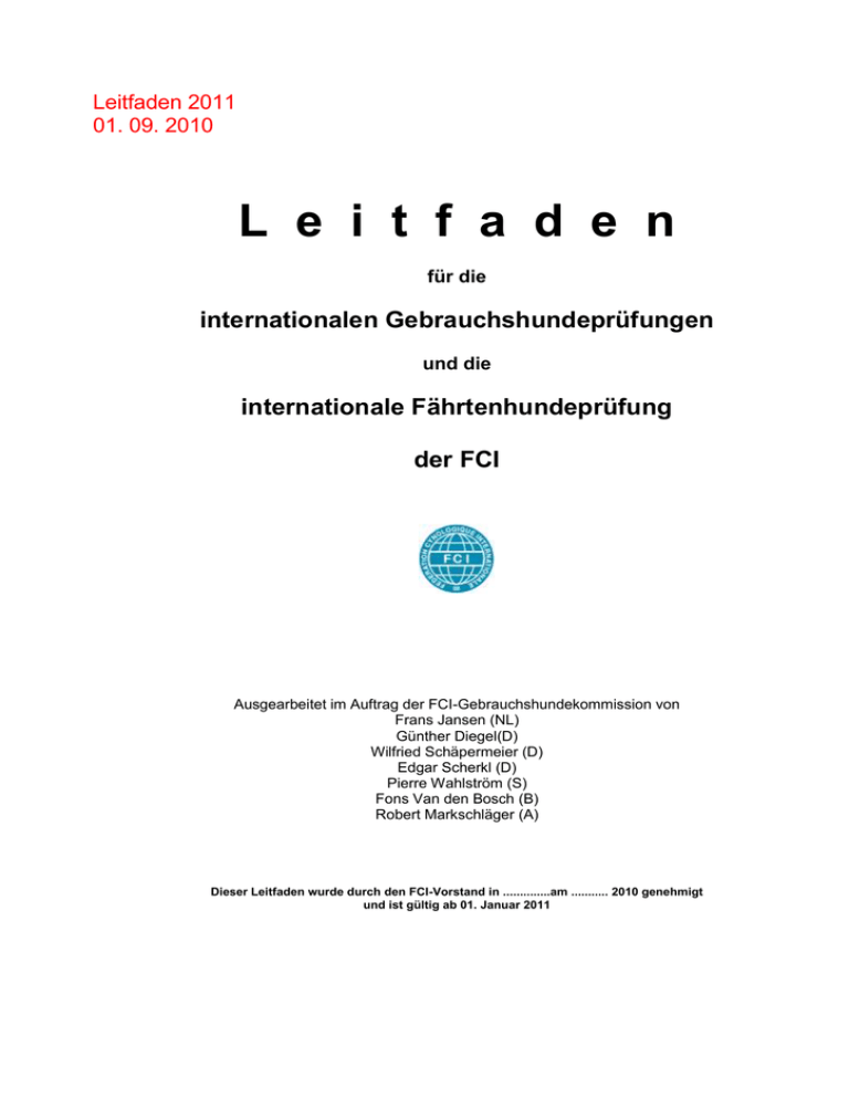 Leitfaden 2011 01. 09. 2010 L e i t f a d e n für die internationalen Gebrauchshundeprüfungen und die internationale Fährtenhundeprüfung der FCI Ausgearbeitet im Auftrag der FCI-Gebrauchshundekommission von Frans Jansen (NL) Günther Diegel(D) Wilfried Schäpermeier (D) Edgar Scherkl (D) Pierre Wahlström (S) Fons Van den Bosch (B) Robert Markschläger (A) Dieser Leitfaden wurde durch den FCI-Vorstand in ..............am ........... 2010 genehmigt und ist gültig ab 01. Januar 2011 FCI Prüfungsordnungen 2011 Seite 2 Präambel Seit mehr als zwölftausend Jahren ist der Hund Gefährte des Menschen. Durch die Domestikation ist der Hund eine enge Sozialgemeinschaft mit dem Menschen eingegangen und in wesentlichen Bereichen auf ihn angewiesen. Damit ist dem Menschen aber auch eine besondere Verantwortung für das Wohlbefinden des Hundes erwachsen. Gerade bei der Ausbildung des Hundes gebührt der physischen wie psychischen Gesundheit oberste Priorität. Als oberstes Prinzip gilt daher ein tiergerechter, artgemäßer und gewaltfreier Umgang mit dem Hund. Selbstverständlich sind die ausreichende Versorgung des Hundes mit Nahrung und Wasser, sowie die Fürsorge für seine Gesundheit, die unter anderem regelmäßige Impfung und ärztliche Untersuchungen einschließt. Darüber hinaus besteht die Verpflichtung, dem Hund regelmäßigen Kontakt mit Menschen und genügend Beschäftigung zur Befriedigung seines Bewegungsbedürfnisses zu gewähren. Im Laufe der Geschichte hatte der Hund die verschiedensten Aufgaben als Helfer d es Menschen zu leisten. In der modernen Welt sind ein großer Teil dieser Aufgaben durch die Technik übernommen worden. Daher hat heute der Hundebesitzer die Pflicht, dem Hund entsprechend dessen Veranlagung als Ersatz für verloren gegangene Aufgaben ausreichend Bewegung und Betätigung in Verbindung mit intensivem Kontakt zum Menschen zu ermöglichen. Auch unter diesen Gesichtspunkten ist die Begleithundeprüfung, die Vielseitigkeitsprüfung für Gebrauchshunde, die Fährtenhundeprüfung und die Stöberprüfung einzuordnen. Der Hund sollte seinen Anlagen und seinem Leistungsvermögen entsprechend beschäftigt werden. Hierzu gehört neben ausreichendem Auslauf auch die intensive Beschäftigung mit Tätigkeiten, die die Lernfähigkeit, den Bewegungsdrang sowie die übrigen Anlagen des Hundes berücksichtigen. Die verschiedenen Formen des Hundesportes sind hierfür hervorragend geeignet. Nicht ausreichend beschäftigte Hunde können auffällig werden und führen zu Beanstandungen in der Öffentlichkeit. Der Mensch, der seinen Hund ausbildet oder gemeinsam mit dem Hund Sport betreibt, hat sich und den ihm anvertrauten Hund einer sorgfältigen Ausbildung zu unterziehen, deren Ziel die größtmögliche Harmonie zwischen Mensch und Hund ist. Das Ziel aller Ausbildungen ist das Vermitteln von Lerninhalten, die für den jeweiligen Hund machbar sind. Die harmonische Übereinstimmung zwischen dem Menschen und seinem Hund, unabhängig davon, wo dieser im Hundesport eingesetzt wird, ist allen Tätigkeiten zugrunde zu legen. Zur Harmonie kann man nur gelangen, wenn man sich weitestgehend in den Hund und seine Anlagen hineinversetzt. Es besteht die ethische Verpflichtung des Menschen, den Hund zu erziehen und ausreichend auszubilden. Die dabei verwendeten Methoden müssen die gesicherten Erkenntnisse der Verhaltenswissenschaften, insbesondere der Kynologie, berücksichtigen. Zur Erreichung des Erziehungs-, Ausbildungs- oder Trainingseffekts ist stets die gewaltfreie und für den Hund positive Methode einzusetzen. Nicht artgerechte Ausbildungs-, Erziehungs- und Trainingsmittel sind abzulehnen (siehe Tierschutzgesetz). Der Einsatz des Hundes im Sport muss sich an seiner Veranlagung, seinem Leistungsvermögen und seiner Leistungsbereitschaft orientieren. Die Beeinflussung des Leistungsvermögens durch medikamentöse oder nicht tiergerechte Einwirkung durch den Menschen ist abzulehnen. Der Mensch muss sorgfältig die Veranlagungen seines Hundes erkunden. Von einem Hund Leistungen zu verlangen, die dieser nicht erbringen kann, widerspricht jedem ethischen Bewusstsein. Der sich seiner Verantwortung bewusste Hundefreund wird nur mit gesunden und leistungsfähigen Hunden an Prüfungen, Wettkämpfen und am Training teilnehmen. FCI Prüfungsordnungen 2011 Inhaltsverzeichnis: Allgemeiner Teil: Gültigkeit Allgemeines Prüfungssaison Prüfungsorganisation / Prüfungsleiter Leistungsrichter Prüfungsteilnehmer Halsbandpflicht / Mitführen der Leine Abbruch wegen Krankheit / Verletzung Maulkorbzwang Zulassungsbestimmungen Unbefangenheitsprobe Bewertung Disqualifikation Hilfen Auswertung Leistungstitel Leistungsheft Haftpflicht Impfungen Prüfungstage Siegerehrung, Vergabe von Ehrenpreise Prüfungsaufsicht Helferbestimmungen Disziplinarrecht „TSB „Bewertung Sonderbestimmungen Weltmeisterschaft Unbefangenheitsüberprüfung Begleithundeprüfung mit Verhaltenstest und Sachkundeüberprüfung Internationale Zuchttauglichkeitsprüfung IPO-ZTP Internationale Gebrauchshundeprüfung IPO - VO Internationale Gebrauchshundeprüfung IPO – 1 Internationale Gebrauchshundeprüfung IPO – 2 Internationale Gebrauchshundeprüfung IPO – 3 Gebrauchshundeprüfung IPO FH – 1 Gebrauchshundeprüfung IPO FH - 2 Internationale Gebrauchshundeprüfung IPO – FH 2 Stöbern 1-3 Anlagen zur IPO (Skizze) Allgemeine Kurzbezeichnungen FCI IPO LAO AKZ LR PL HL HF FL HZ = = = = = = = = = = Federation Cynologique International Internationale Prüfungsordnung Landesorganisation Ausbildungskenzeichen Leistungsrichter. Prüfungsleiter Helfer Hundeführer Fährtenleger Hörzeichen Seite 3 Seite 3 Seite 4 Seite 4 Seite 4 Seite 4 Seite 5 Seite 5 - 6 Seite 6 - 7 Seite 7 Seite 8 Seite 8 Seite 8 - 9 Seite 9 Seite 9 - 10 Seite 10 - 11 Seite 11 Seite 11 Seite 12 Seite 12 Seite 12 Seite 12 Seite 12 - 13 Seite 13 Seite 13 Seite 13 - 17 Seite 17 Seite 17 - 18 Seite 18 Seite 18 Seite 19 - 20 Seite 21 - 26 Seite 26 - 33 Seite 33 - 39 Seite 4