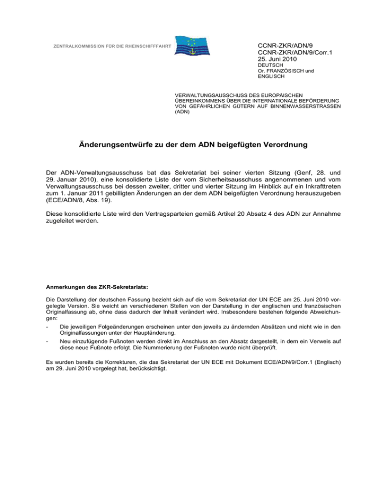 ZENTRALKOMMISSION FÜR DIE RHEINSCHIFFFAHRT CCNR-ZKR/ADN/9 CCNR-ZKR/ADN/9/Corr.1 25. Juni 2010 DEUTSCH Or. FRANZÖSISCH und ENGLISCH VERWALTUNGSAUSSCHUSS DES EUROPÄISCHEN ÜBEREINKOMMENS ÜBER DIE INTERNATIONALE BEFÖRDERUNG VON GEFÄHRLICHEN GÜTERN AUF BINNENWASSERSTRASSEN (ADN) Änderungsentwürfe zu der dem ADN beigefügten Verordnung Der ADN-Verwaltungsausschuss bat das Sekretariat bei seiner vierten Sitzung (Genf, 28. und 29. Januar 2010), eine konsolidierte Liste der vom Sicherheitsausschuss angenommenen und vom Verwaltungsausschuss bei dessen zweiter, dritter und vierter Sitzung im Hinblick auf ein Inkrafttreten zum 1. Januar 2011 gebilligten Änderungen an der dem ADN beigefügten Verordnung herauszugeben (ECE/ADN/8, Abs. 19). Diese konsolidierte Liste wird den Vertragsparteien gemäß Artikel 20 Absatz 4 des ADN zur Annahme zugeleitet werden. Anmerkungen des ZKR-Sekretariats: Die Darstellung der deutschen Fassung bezieht sich auf die vom Sekretariat der UN ECE am 25. Juni 2010 vorgelegte Version. Sie weicht an verschiedenen Stellen von der Darstellung in der englischen und französischen Originalfassung ab, ohne dass dadurch der Inhalt verändert wird. Insbesondere bestehen folgende Abweichungen: - Die jeweiligen Folgeänderungen erscheinen unter den jeweils zu ändernden Absätzen und nicht wie in den Originalfassungen unter der Hauptänderung. - Neu einzufügende Fußnoten werden direkt im Anschluss an den Absatz dargestellt, in dem ein Verweis auf diese neue Fußnote erfolgt. Die Nummerierung der Fußnoten wurde nicht überprüft. Es wurden bereits die Korrekturen, die das Sekretariat der UN ECE mit Dokument ECE/ADN/9/Corr.1 (Englisch) am 29. Juni 2010 vorgelegt hat, berücksichtigt. CCNR-ZKR/ADN/9 TEIL 1 Kapitel 1.1 1.1.3.2 Der Absatz f) erhält folgenden Wortlaut: "f) Gasen, die in Nahrungsmitteln (ausgenommen UN 1950) einschließlich mit Kohlensäure versetzten Getränken enthalten sind;". Folgende neue Absätze hinzufügen: "g) Gasen, die in zur Sportausübung vorgesehenen Bällen enthalten sind, und h) Gasen, die in elektrischen Lampen enthalten sind, vorausgesetzt, diese sind so verpackt, dass die durch ein Zubruchgehen der Lampe verursachte Splitterwirkung auf das Innere des Versandstücks begrenzt bleibt.". Kapitel 1.2 Am Ende der Begriffsbestimmungen für „Batterie-Fahrzeug“ und für „Batteriewagen“ „für Gase der Klasse 2" ändern in: "für in Absatz 2.2.2.1.1 definierte Gase". In der Begriffsbestimmung für „Betriebsdruck, höchstzulässiger“ am Ende anfügen: „oder des Überdruckventils“. In der Begriffsbestimmung für "CSC" "in der jeweils geltenden Fassung" ändern in: "in der jeweils geänderten Fassung". [betrifft nur die deutsche Fassung] In der Begriffsbestimmung für "Druckgefäß" vor "und Flaschenbündel" einfügen: ", Metallhydrid-Speichersystem". In der Begriffsbestimmung für "EN (-Norm)" "(CEN, 36, rue de Stassart, B1050 Brüssel)" ändern in: "(CEN, Avenue Marnix 17, B-1000 Brüssel)". Am Ende der Begriffsbestimmung für "Gascontainer mit mehreren Elementen (MEGC)" "für Gase der Klasse 2" ändern in: "für in Absatz 2.2.2.1.1 definierte Gase". [Die Änderung der Begriffsbestimmung für "Gaspatrone" in der englischen und französischen Fassung betrifft nicht den deutschen Text.] 2 CCNR-ZKR/ADN/9 Die Begriffsbestimmung für "Gefäß, klein, mit Gas" erhält folgenden Wortlaut: "Gefäß, klein, mit Gas (Gaspatrone): Ein nicht nachfüllbares Gefäß, das den anwendbaren Vorschriften des Abschnitts 6.2.6 des ADR entspricht und das ein Gas oder Gasgemisch unter Druck enthält. Es kann mit einem Ventil ausgerüstet sein.". In der Begriffsbestimmung für "Genehmigung/Zulassung" unter "Multilaterale Genehmigung/Zulassung" den letzten Satz streichen. In der Begriffsbestimmung für "GHS" folgende Änderungen vornehmen: – "ST/SG/AC.10/30/Rev.2" ändern in: "ST/SG/AC.10/30/Rev.3"; – "zweite" ändern in: "dritte"; – "für die Klassifizierung und Bezettelung von chemischen Produkten" ändern in: "zur Einstufung und Kennzeichnung von Chemikalien". [betrifft nur die deutsche Fassung] In der Begriffsbestimmung für "Handbuch Prüfungen und Kriterien" "Vierte" ändern in: "Fünfte" und am Ende den Text in Klammern ändern in: "(ST/SG/AC.10/11/Rev.5)". In der Begriffsbestimmung für „Hochgeschwindigkeitsventil“ nach „Flammenausbreitungsgeschwindigkeit“ einfügen: „eines entzündbaren Gemisches“. In der Begriffsbestimmung für "IAEA" "(IAEA – Internationale Atomenergiebehörde) (IAEA, Postfach 100, A-1400 Wien)" ändern in: "(IAEO – Internationale Atomenergieorganisation) (IAEO, Postfach 100, A1400 Wien)". [betrifft nur die deutsche Fassung] In der Begriffsbestimmung für "Kryo-Behälter" am Ende vor dem Punkt einfügen: "(siehe auch offener Kryo-Behälter)". Die Begriffsbestimmung für „Ladungsbuch“ streichen. Die Begriffsbestimmung für „Ladungsrückstände“ erhält folgenden Wortlaut: „Ladungsrückstände: Flüssige Ladung, die nicht durch das Nachlenzsystem aus den Ladetanks oder den Leitungssystemen entfernt werden kann.“. 3 CCNR-ZKR/ADN/9 Die Begriffsbestimmung für „Nachlenzsystem“ erhält folgenden Wortlaut: „Nachlenzsystem: Ein System nach Anhang II CDNI für das möglichst vollständige Entleeren der Ladetanks und der Lade- und Löschleitungen bis auf Ladungsrückstände.“. In der Begriffsbestimmung für "Ortsbeweglicher Tank" "von Gasen der Klasse 2" ändern in: "von in Absatz 2.2.2.1.1 definierten Gasen". Die Begriffsbestimmung für „Slops“ erhält folgenden Wortlaut: „Slops: Ein pumpfähiges oder nicht pumpfähiges Gemisch aus Ladungsrückständen und Waschwasserresten, Rost oder Schlamm.“. In der Begriffsbestimmung für "Tankcontainer" "von Gasen der Klasse 2" ändern in: "von in Absatz 2.2.2.1.1 definierten Gasen". In der Begriffsbestimmung für "UN-Modellvorschriften" "fünfzehnten" ändern in: "sechzehnten" und "(ST/SG/AC.10/1/Rev.15)" ändern in: "(ST/SG/AC.10/1/Rev.16)". Die Begriff