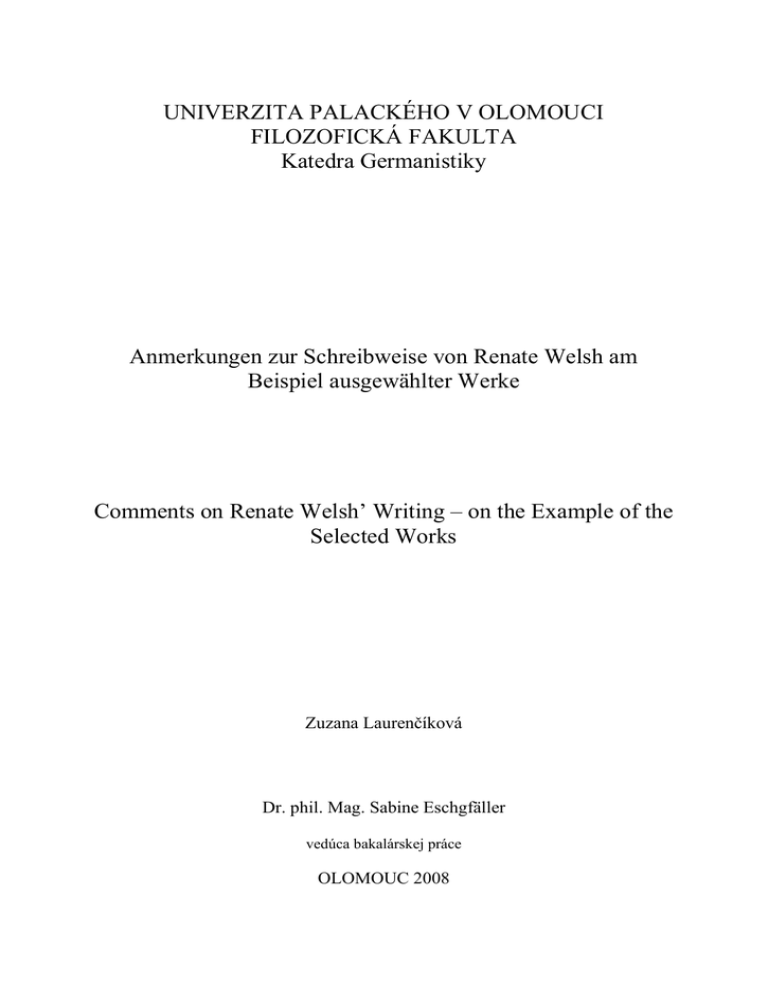 UNIVERZITA PALACKÉHO V OLOMOUCI FILOZOFICKÁ FAKULTA Katedra Germanistiky Anmerkungen zur Schreibweise von Renate Welsh am Beispiel ausgewählter Werke Comments on Renate Welsh’ Writing – on the Example of the Selected Works Zuzana Laurenčíková Dr. phil. Mag. Sabine Eschgfäller vedúca bakalárskej práce OLOMOUC 2008 Prehlasujem, že som bakalársku prácu vypracovala samostatne a že som použila len uvedené pramene a literatúru. V Olomouci dňa 12.7.2008 Zuzana Laurenčíková Moja vrelá a úprimná vďaka patrí Dr. phil. Mag. Sabine Eschgfäller, za odborné vedenie práce a mnoho cenných rád a podnetov. Zároveň ďakujem svojej rodine a priateľom, ktorí mi pomáhali a podporovali ma. V Olomouci dňa 12.7.2008 Zuzana Laurenčíková Inhaltsverzeichnis Inhaltsverzeichnis ....................................................................................................................... 1 1. Einleitung ............................................................................................................................... 2 2. Renate Welsh.......................................................................................................................... 3 3. Die ausgewählten Bücher ....................................................................................................... 7 3.1 Allgemein ................................................................................................................... 7 3.2 Hauptprotagonistinnen ............................................................................................. 10 4. Themen ................................................................................................................................. 23 4.1 Patriarchat ................................................................................................................ 23 4.2 Mutter ....................................................................................................................... 25 4.3 Der Zweite Weltkrieg ............................................................................................... 27 4.4 Humor, Ironie, sarkastisches Nachdenken ............................................................... 34 5. Literaturtheoretische Grundlagen ......................................................................................... 36 5.1 Stoffe ........................................................................................................................ 36 5.2 Motive ...................................................................................................................... 37 5.3 Leitmotive ................................................................................................................ 39 5.4 Symbolik .................................................................................................................. 42 5.5 Die Erzähler ............................................................................................................. 43 6. Zusammenfassung ................................................................................................................ 45 7. Resumé ................................................................................................................................. 46 Abkürzungsverzeichnis ............................................................................................................ 47 Literaturverzeichnis .................................................................................................................. 48 1 1. Einleitung Der hier vorliegende Text ist vor allem als Analyse der drei Werke – Die schöne Aussicht; Besuch aus der Vergangenheit; Dieda oder Das fremde Kind von Renate Welsh beabsichtigt. Der erste Impuls für das Niederschreiben dieser Arbeit ausgerechnet auf dieses Thema wurde die Autorenlesung, wo Renate Welsh unter anderem auch aus dem Kinderbuch Dieda oder Das fremde Kind vorgelesen hat. Da wurde ihr offensichtliches Streben nach Erörterung der Thematik – Wirklichkeit und Vergangenheit in Verknüpfung des persönlichen Lebens der Figuren mit den gesellschaftlichen Zuständen – zum ersten Mal deutlich. Da es sich um drei Werke handelt, rechnet man mit der Voraussetzung, dass auf so wenigen Seiten nur einige ihre Aspekte dargeboten werden. Konkret sind das R.Welshs literarisches Schaffen in Zusammenfassung; Versuch die analysierten Werke in bestimmte Kategorien der Kinder- und Jugendliteratur, bzw. auch der allgemeinen Literatur einzuordnen. Später kommt es zur Besprechung der Hauptprotagonistinnen und der prägnantesten Themen. Mit allen diesen Aspekten sind auch einige literaturtheoretische Grundlagen verbunden. Aus diesem Grund wird auch ihnen Raum gewidmet. Um jedes dieser Aspekte am treffendsten zu spezifizieren, verwendete die Autorin dieser Bakkalaureatsarbeit viele unterstützende Zitate bzw. Zitatenparaphrasen aus der Sekundärliteratur. Es ist nicht die Absicht dieser Arbeit, den ganzen Inhalt der Werke zu besprechen. Ziel ist es eher, eine Anregung zur näheren Beschäftigung sowohl mit Kriegs- als auch Nachkriegsverhältnissen und Umständen in Österreich zu geben. Die ausgewählten Themenbereiche und Charakteristiken der drei Hauptfiguren sollten dabei hilfsreich sein. Des Weiteren ist es die Absicht auch aufzuzeigen, auf welche nüchterne und tief gehende Weise sich Kinder- und Jugendliteratur mit vielschichtigen Themen auseinandersetzen kann und somit Renate Welsh als Schriftstellerin zu präsentieren. 2 2. Renate Welsh Die fast einundsiebzig Jahre alte Schriftstellerin befasst sich mit dem professionellen Schreiben, vorzüglich für Kinder und Jugendliche, schon seit den Siebzigerjahren. Ihr erstes Buch erschien 1969.1 Anhand dessen ist festzustellen, dass sie in diesem Bereich Bescheid weiß. Ihre „Arbeiten umfassen sowohl vom Alter der Zielgruppe her als auch bezüglich der Themenbereiche ein äußerst breites Spektrum.“2 Ihre neue
