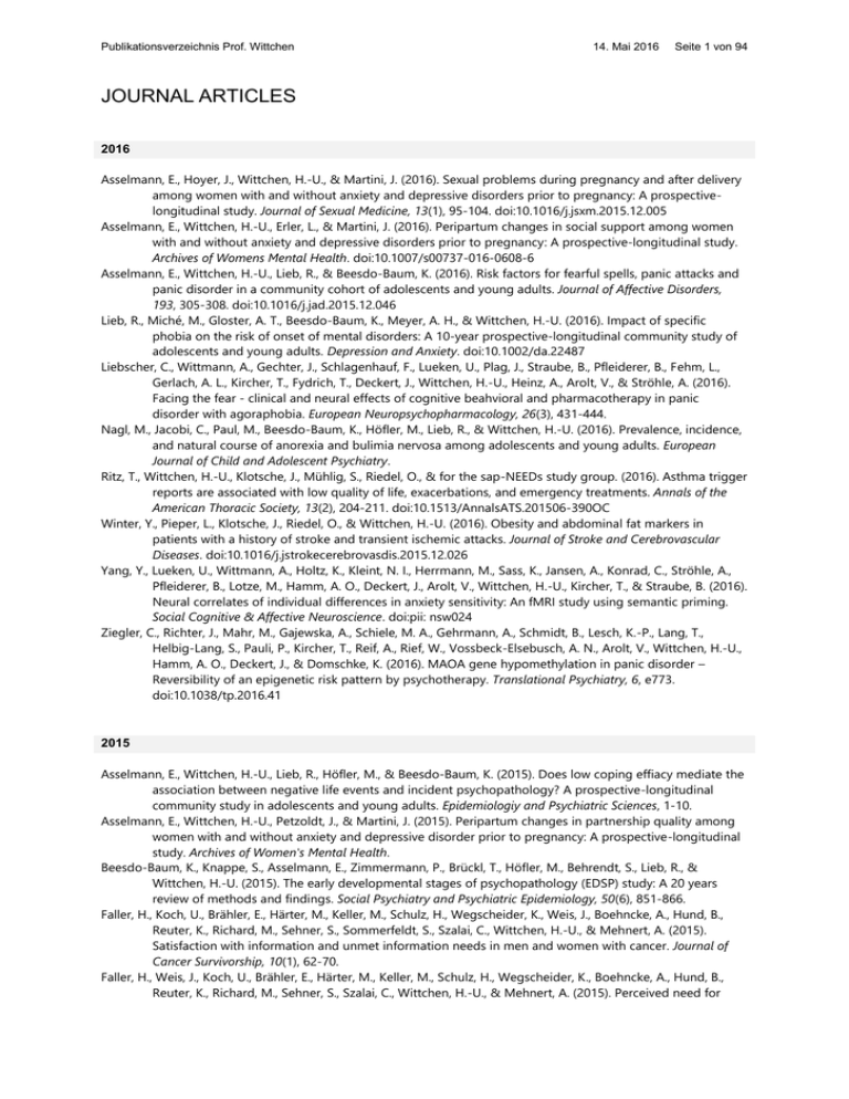 Publikationsverzeichnis Prof. Wittchen 14. Mai 2016 Seite 1 von 94 JOURNAL ARTICLES 2016 Asselmann, E., Hoyer, J., Wittchen, H.-U., & Martini, J. (2016). Sexual problems during pregnancy and after delivery among women with and without anxiety and depressive disorders prior to pregnancy: A prospectivelongitudinal study. Journal of Sexual Medicine, 13(1), 95-104. doi:10.1016/j.jsxm.2015.12.005 Asselmann, E., Wittchen, H.-U., Erler, L., & Martini, J. (2016). Peripartum changes in social support among women with and without anxiety and depressive disorders prior to pregnancy: A prospective-longitudinal study. Archives of Womens Mental Health. doi:10.1007/s00737-016-0608-6 Asselmann, E., Wittchen, H.-U., Lieb, R., & Beesdo-Baum, K. (2016). Risk factors for fearful spells, panic attacks and panic disorder in a community cohort of adolescents and young adults. Journal of Affective Disorders, 193, 305-308. doi:10.1016/j.jad.2015.12.046 Lieb, R., Miché, M., Gloster, A. T., Beesdo-Baum, K., Meyer, A. H., & Wittchen, H.-U. (2016). Impact of specific phobia on the risk of onset of mental disorders: A 10-year prospective-longitudinal community study of adolescents and young adults. Depression and Anxiety. doi:10.1002/da.22487 Liebscher, C., Wittmann, A., Gechter, J., Schlagenhauf, F., Lueken, U., Plag, J., Straube, B., Pfleiderer, B., Fehm, L., Gerlach, A. L., Kircher, T., Fydrich, T., Deckert, J., Wittchen, H.-U., Heinz, A., Arolt, V., & Ströhle, A. (2016). Facing the fear - clinical and neural effects of cognitive beahvioral and pharmacotherapy in panic disorder with agoraphobia. European Neuropsychopharmacology, 26(3), 431-444. Nagl, M., Jacobi, C., Paul, M., Beesdo-Baum, K., Höfler, M., Lieb, R., & Wittchen, H.-U. (2016). Prevalence, incidence, and natural course of anorexia and bulimia nervosa among adolescents and young adults. European Journal of Child and Adolescent Psychiatry. Ritz, T., Wittchen, H.-U., Klotsche, J., Mühlig, S., Riedel, O., & for the sap-NEEDs study group. (2016). Asthma trigger reports are associated with low quality of life, exacerbations, and emergency treatments. Annals of the American Thoracic Society, 13(2), 204-211. doi:10.1513/AnnalsATS.201506-390OC Winter, Y., Pieper, L., Klotsche, J., Riedel, O., & Wittchen, H.-U. (2016). Obesity and abdominal fat markers in patients with a history of stroke and transient ischemic attacks. Journal of Stroke and Cerebrovascular Diseases. doi:10.1016/j.jstrokecerebrovasdis.2015.12.026 Yang, Y., Lueken, U., Wittmann, A., Holtz, K., Kleint, N. I., Herrmann, M., Sass, K., Jansen, A., Konrad, C., Ströhle, A., Pfleiderer, B., Lotze, M., Hamm, A. O., Deckert, J., Arolt, V., Wittchen, H.-U., Kircher, T., & Straube, B. (2016). Neural correlates of individual differences in anxiety sensitivity: An fMRI study using semantic priming. Social Cognitive & Affective Neuroscience. doi:pii: nsw024 Ziegler, C., Richter, J., Mahr, M., Gajewska, A., Schiele, M. A., Gehrmann, A., Schmidt, B., Lesch, K.-P., Lang, T., Helbig-Lang, S., Pauli, P., Kircher, T., Reif, A., Rief, W., Vossbeck-Elsebusch, A. N., Arolt, V., Wittchen, H.-U., Hamm, A. O., Deckert, J., & Domschke, K. (2016). MAOA gene hypomethylation in panic disorder – Reversibility of an epigenetic risk pattern by psychotherapy. Translational Psychiatry, 6, e773. doi:10.1038/tp.2016.41 2015 Asselmann, E., Wittchen, H.-U., Lieb, R., Höfler, M., & Beesdo-Baum, K. (2015). Does low coping effiacy mediate the association between negative life events and incident psychopathology? A prospective-longitudinal community study in adolescents and young adults. Epidemiologiy and Psychiatric Sciences, 1-10. Asselmann, E., Wittchen, H.-U., Petzoldt, J., & Martini, J. (2015). Peripartum changes in partnership quality among women with and without anxiety and depressive disorder prior to pregnancy: A prospective-longitudinal study. Archives of Women's Mental Health. Beesdo-Baum, K., Knappe, S., Asselmann, E., Zimmermann, P., Brückl, T., Höfler, M., Behrendt, S., Lieb, R., & Wittchen, H.-U. (2015). The early developmental stages of psychopathology (EDSP) study: A 20 years review of methods and findings. Social Psychiatry and Psychiatric Epidemiology, 50(6), 851-866. Faller, H., Koch, U., Brähler, E., Härter, M., Keller, M., Schulz, H., Wegscheider, K., Weis, J., Boehncke, A., Hund, B., Reuter, K., Richard, M., Sehner, S., Sommerfeldt, S., Szalai, C., Wittchen, H.-U., & Mehnert, A. (2015). Satisfaction with information and unmet information needs in men and women with cancer. Journal of Cancer Survivorship, 10(1), 62-70. Faller, H., Weis, J., Koch, U., Brähler, E., Härter, M., Keller, M., Schulz, H., Wegscheider, K., Boehncke, A., Hund, B., Reuter, K., Richard, M., Sehner, S., Szalai, C., Wittchen, H.-U., & Mehnert, A. (2015). Perceived need for Publikationsverzeichnis Prof. Wittchen 14. Mai 2016 Seite 2 von 94 professional psychosocial support depending on emotional distress and mental comorbidity in men and women with cancer Journal of Psychosomatic Research, 81, 24-30. Garbusow, M., Schad, D., Sebold, M., Friedel, E., Bernhardt, N., Koch, S., Steinacher, B., Kathmann, N., Geurts, D., Sommer, C., Müller, D., Nebe, S., Paul, S., Wittchen, H.-U., Zimmermann, U., Walter, H., Smolka, M., Sterzer, P., Rapp, M., Huys, Q., Schlagenhauf, F., & Heinz, A. (2015). Pavlovian to instrumental transfer effects in the nucleus accumbens relate to relapse in alcohol dependence. Addiction Biology. Gloster, A. T., Sonntag, R. F., Hoyer, J., Meyer, A., Heinze, S., Ströhle, A., Eifert, G., & Wittchen, H.-U. (2015). Treating treatment-resistant patients with panic disorder and agoraphobia using psychotherapy: A randomized controlled switching trial. Psychotherapie and Psychosomatics 84(2), 100-109. Gloster, A. T., Wittchen, H.-U., Höfler, M., Deckert, J., & Reif, A. (2015). 5HTT is associated with the phenotype psychological flexibility: Results from a randomized clinical trial. European Archives of Psychiatry and Clinical