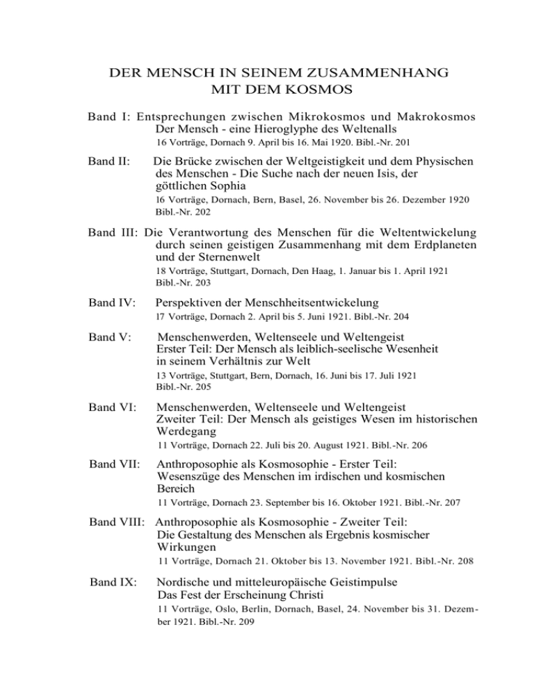 DER MENSCH IN SEINEM ZUSAMMENHANG MIT DEM KOSMOS Band I: Entsprechungen zwischen Mikrokosmos und Makrokosmos Der Mensch - eine Hieroglyphe des Weltenalls 16 Vorträge, Dornach 9. April bis 16. Mai 1920. Bibl.-Nr. 201 Band II: Die Brücke zwischen der Weltgeistigkeit und dem Physischen des Menschen - Die Suche nach der neuen Isis, der göttlichen Sophia 16 Vorträge, Dornach, Bern, Basel, 26. November bis 26. Dezember 1920 Bibl.-Nr. 202 Band III: Die Verantwortung des Menschen für die Weltentwickelung durch seinen geistigen Zusammenhang mit dem Erdplaneten und der Sternenwelt 18 Vorträge, Stuttgart, Dornach, Den Haag, 1. Januar bis 1. April 1921 Bibl.-Nr. 203 Band IV: Perspektiven der Menschheitsentwickelung 17 Vorträge, Dornach 2. April bis 5. Juni 1921. Bibl.-Nr. 204 Band V: Menschenwerden, Weltenseele und Weltengeist Erster Teil: Der Mensch als leiblich-seelische Wesenheit in seinem Verhältnis zur Welt 13 Vorträge, Stuttgart, Bern, Dornach, 16. Juni bis 17. Juli 1921 Bibl.-Nr. 205 Band VI: Menschenwerden, Weltenseele und Weltengeist Zweiter Teil: Der Mensch als geistiges Wesen im historischen Werdegang 11 Vorträge, Dornach 22. Juli bis 20. August 1921. Bibl.-Nr. 206 Band VII: Anthroposophie als Kosmosophie - Erster Teil: Wesenszüge des Menschen im irdischen und kosmischen Bereich 11 Vorträge, Dornach 23. September bis 16. Oktober 1921. Bibl.-Nr. 207 Band VIII: Anthroposophie als Kosmosophie - Zweiter Teil: Die Gestaltung des Menschen als Ergebnis kosmischer Wirkungen 11 Vorträge, Dornach 21. Oktober bis 13. November 1921. Bibl.-Nr. 208 Band IX: Nordische und mitteleuropäische Geistimpulse Das Fest der Erscheinung Christi 11 Vorträge, Oslo, Berlin, Dornach, Basel, 24. November bis 31. Dezem ber 1921. Bibl.-Nr. 209 DER MENSCH IN SEINEM ZUSAMMENHANG MIT DEM KOSMOS Vierter Band RUDOLF STEINER Perspektiven der Menschheitsentwickelung Der materialistische Erkenntnisimpuls und die Aufgabe der Anthroposophie Siebzehn Vorträge, gehalten in Dornach zwischen dem 2. April und 5. Juni 1921 1979 RUDOLF STEINER VERLAG DORNACH/ SCHWEIZ Nach vom Vortragenden nicht durchgesehenen Nachschriften herausgegeben von der Rudolf Steiner-Nachlaßverwaltung Die Herausgabe besorgten auf Grund der früheren Bearbeitung durch C. S. Picht ( ): Hans Huber, Caroline Wispler und Robert Friedenthal l. Auflage in dieser Zusammenstellung Gesamtausgabe Dornach 1979 Frühere Ausgaben: Dornach, 2., 3., 15., 16. und 17. April 1921: «Der materialistische Erkenntnisimpuls und seine Bedeutung für die ganze Menschheitsentwickelung», Basel 1953 Dornach, 9. April 1921 in «Ansprachen und Vorträge Rudolf Steiners im Zweiten anthroposophischen Hochschulkurs», Bern 1948 Dornach, 22., 23., 24., 29. und 30. April, 1. Mai 1921: «Die materialistische Weltanschauung des neunzehnten Jahrhunderts», Basel 1955 Dornach, 2., 3., und 5. Juni 1921: III. bis V. Vortrag in «Perspektiven der Menschheitsentwickelung», Basel 1958 Dornach, 5. Mai 1921: «Das Ich und die Sonne. Der Mensch innerhalb der Sternenkonstellation», Dornach 1934; I. Vortrag in «Perspektiven der Menschheitsentwickelung», Basel 1958 Dornach, 13, Mai 1921: «Vom Mondenaustritt bis zur Mondenzurückkunft», Dornach 1934; II. Vortrag in «Perspektiven der Menschheitsentwickelung», Basel 1958 Veröffentlichungen in Zeitschriften siehe S. 313 Bibliographie-Nr. 204 Einbandzeichen von Rudolf Steiner. Schrift von B. Marzahn Zeichnungen im Text nach Tafelzeichnungen Rudolf Steiners, ausgeführt von Assia Turgenieff ( ) und Leonore Uhlig Alle Rechte bei der Rudolf Steiner-Nachlaßverwaltung, Dornach/Schweiz Copyright 1979 by Rudolf Steiner-Nachlaßverwaltung, Dornach/Schweiz Printed in Switzerland by Zbinden Druck und Verlag AG, Basel ISBN 3-7274-2040-5 Zu den Veröffentlichungen aus dem Vortragswerk von Rudolf Steiner Die Grundlage der anthroposophisch orientierten Geisteswissenschaft bilden die von Rudolf Steiner (1861-1925) geschriebenen und veröffentlichten Werke. Daneben hielt er in den Jahren 1900 bis 1924 zahlreiche Vorträge und Kurse, sowohl öffentlich wie auch für die Mitglieder der Theosophischen, später Anthroposophischen Gesellschaft. Er selbst wollte ursprünglich, daß seine durchwegs frei gehaltenenen Vorträge nicht schriftlich festgehalten würden, da sie als «mündliche, nicht zum Druck bestimmte Mitteilungen» gedacht waren. Nachdem aber zunehmend unvollständige und fehlerhafte Hörernachschriften angefertigt und verbreitet wurden, sah er sich veranlaßt, das Nachschreiben zu regeln. Mit dieser Aufgabe betraute er Marie Steiner-von Sivers. Ihr oblag die Bestimmung der Stenographierenden, die Verwaltung der Nachschriften und die für die Herausgabe notwendige Durchsicht der Texte. Da Rudolf Steiner aus Zeitmangel nur in ganz wenigen Fällen die Nachschriften selbst korrigieren konnte, muß gegenüber allen Vortragsveröffentlichungen sein Vorbehalt berücksichtigt werden: «Es wird eben nur hingenommen werden müssen, daß in den von mir nicht nachgesehenen Vorlagen sich Fehlerhaftes findet.» Über das Verhältnis der Mitgliedervorträge, welche zunächst nur als interne Manuskriptdrucke zugänglich waren, zu seinen öffentlichen Schriften äußert sich Rudolf Steiner in seiner Selbstbiographie «Mein Lebensgang» (35. Kapitel). Der entsprechende Wortlaut ist am Schluß dieses Bandes wiedergegeben. Das dort Gesagte gilt gleichermaßen auch für die Kurse zu einzelnen Fachgebieten, welche sich an einen begrenzten, mit den Grundlagen der Geisteswissenschaft vertrauten Teilnehmerkreis richteten. Nach dem Tode von Marie Steiner (1867-1948) wurde gemäß ihren Richtlinien mit der Herausgabe einer Rudolf Steiner Gesamtausgabe begonnen. Der vorliegende Band bildet einen Bestandteil dieser Gesamtausgabe. Soweit erforderlich, finden sich nähere Angaben zu den Textunterlagen am Beginn der Hinweise. INHALT ERSTER VORTRAG, Dornach, 2. April 1921 ............................................ 15 Der Materialismus bestand im 19. Jahrhundert zu Recht; nur