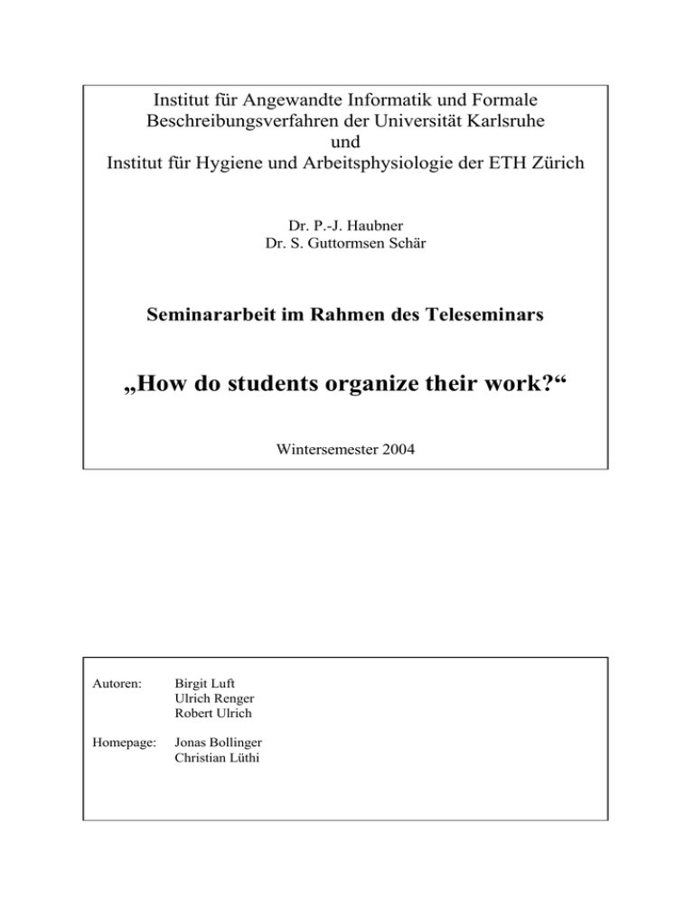 Institut für Angewandte Informatik und Formale Beschreibungsverfahren der Universität Karlsruhe und Institut für Hygiene und Arbeitsphysiologie der ETH Zürich Dr. P.-J. Haubner Dr. S. Guttormsen Schär Seminararbeit im Rahmen des Teleseminars „How do students organize their work?“ Wintersemester 2004 Autoren: Birgit Luft Ulrich Renger Robert Ulrich Homepage: Jonas Bollinger Christian Lüthi „How do students organize their work?“ Teleseminar TH Karlsruhe, ETH Zürich Inhaltsverzeichnis 1 Einleitung .......................................................................................................................... 3 2 Teamwork .......................................................................................................................... 4 3 2.1 Einleitung .............................................................................................................................. 4 2.2 Definitionen .......................................................................................................................... 4 2.3 Anforderung ......................................................................................................................... 5 2.4 Grundlegende Merkmale der Zusammenarbeit ............................................................... 6 Computer Supported Cooperative Work ........................................................................... 7 3.1 Einleitung .............................................................................................................................. 7 3.2 Klassifikationen .................................................................................................................... 8 3.2.1 3.2.2 3.2.3 4 Systemvorstellungen ........................................................................................................ 15 4.1 Einleitung ............................................................................................................................ 15 4.2 Groupware .......................................................................................................................... 15 4.2.1 4.2.2 4.2.3 4.2.4 4.2.5 4.3 4.3.1 4.3.2 5 Workflow-Management-Systeme ................................................................................................... 9 Groupware-Systeme ...................................................................................................................... 12 Videokonferenz-Systeme .............................................................................................................. 13 BSCW ........................................................................................................................................... 15 Groove ........................................................................................................................................... 16 Teamspace ..................................................................................................................................... 16 phpGroupware ............................................................................................................................... 16 Grouwaregegenüberstellung .......................................................................................................... 17 Videokonferenzsysteme ..................................................................................................... 21 Einführung .................................................................................................................................... 21 Gerätevorstellung .......................................................................................................................... 24 Evaluation........................................................................................................................ 28 5.1 Fragebogen ......................................................................................................................... 28 5.2 Systemanforderungen ........................................................................................................ 31 5.3 Systembewertung ............................................................................................................... 32 5.4 Handlungsleitfaden ............................................................................................................ 34 6 Fazit ................................................................................................................................. 37 7 Quellen ............................................................................................................................. 38 Luft, Renger, Ulrich Seite 2 von 38 „How do students organize their work?“ 1 Teleseminar TH Karlsruhe, ETH Zürich Einleitung Auf unserer Homepage möchten wir Studenten eine Anleitung zum verteilten Arbeiten bieten. Im ersten Teil der Seminararbeit wird auf den Begriff Gruppenarbeit eingegangen. Es wird erklärt, was eine Gruppe ist und welche Vorteile Gruppenarbeit bietet. Anschließend werden Vorraussetzungen sowie die wichtigsten Merkmale für eine effektive Zusammenarbeit genannt. Im zweiten Teil wird erläutert, wie verteilte Gruppenarbeit technisch unterstützt werden kann. Hierbei wird zunächst der Begriff Computer Supported Cooperative Work (CSCW) erklärt und CSCW-Applikationen nach der Raum-Zeit-Matrix sowie nach Unterstützungsfunktionen klassifiziert. Anschließend werden im dritten Teil verschiedene bestehende Groupware- und Videokonferenz-Systeme vorgestellt. Im letzten Teil stellen wir notwendige Systemanforderungen für CSCW-Appliaktionen dar. Als Basis hierfür dient zum einen die Auswertung eines von uns erstellten Fragebogens und zum andern die im ersten Teil der Seminararbeit gewonnenen Erkenntnisse über Gruppenarbeit. Abschließend überprüfen wir, in wie weit das uns zur Verfügung stehende CSCW-System (Teamspace, Polycom ViaVideo) diese Systemanfor