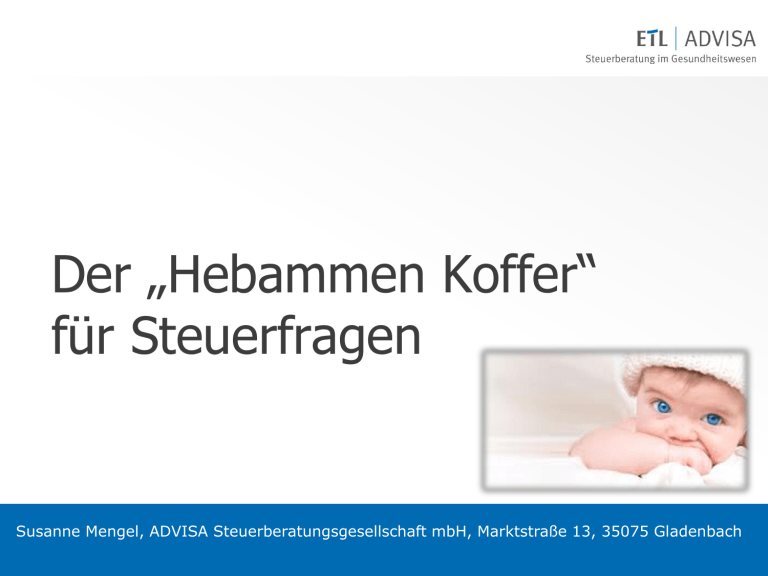 Der „Hebammen Koffer“ für Steuerfragen Susanne Mengel, ADVISA Steuerberatungsgesellschaft mbH, Marktstraße 13, 35075 Gladenbach 1 Zu meiner Person: Susanne Mengel Diplom-Betriebswirtin ADVISA Steuerberatungsgesellschaft mbH Marktstraße 13 35075 Gladenbach Telefon 06462 917245 Telefax 06462 917229 E-Mail: [email protected] 2 Was haben Kofferpacken und die Steuererklärung gemeinsam? 3 … es wird einem nicht abgenommen, aber leichter, wenn man einen roten Faden hat. 4 Der rote Faden… Wie ermittel ich meinen Gewinn? Was sind Betriebseinnahmen? Was sind Betriebsausgaben? Belegsortierung Außergewöhnliche Belastungen Sonderausgaben Aufbewahrungsfristen f. Belege 5 ENTSCHEIDUNG Viele gute Gründe für die Selbständigkeit Selbstverwirklichung Eigenverantwortung Unternehmerische „Freiheit“ Spaß Entwicklungschancen Unabhängigkeit Stolz potenzielle Möglichkeit des höheren Einkommens Flexibilität keine staatliche Vorsorge mehr 6 ENTSCHEIDUNG Einige negative Begleiterscheinungen Buchhaltung Mehr Belastung Belegsortierung Finanzieller Druck Höhere Arbeitszeit Nicht genau wissen wie viel Geld man verdient keine staatliche Vorsorge mehr 7 To-Do-Listen Man baut auch kein Haus ohne Bauplan! Belegsortierung! Wie oft sollte ich mir dafür Zeit nehmen? Wer kann helfen? Probleme werden erkennbar, Alternativen müssen überlegt werden Ggf. Outsourcen Kontrollieren Sie Ihren Erfolg! Läuft alles nach Plan? 8 Was muss ich im Blick haben? Liquiditätsbeobachtung Hohe Anzahl von Schwangeren bedeutet noch lange keine hohe Liquidität Anstreben von schnellen Zahlungseingängen (z. B. durch zeitnahe Abrechnung) Kapitalbedarfsplanung Einschätzung der notwendigen Investitionen Berücksichtigung der Kosten der privaten Lebensführung 9 Was muss ich im Blick haben? Finanzierung Eigenkapital Kredite von Banken Rating der Kreditinstitute (Beurteilung der voraussichtlichen wirtschaftlichen Fähigkeit eines Kreditnehmers, den Zahlungsverpflichtungen termingerecht nachzukommen) Entscheidung über Kreditwürdigkeit Ausfallrisiko bestimmt Kreditzins 10 Was eine Hebamme alles wissen muss Einleitung Was sind Steuern? Steuerpflicht Einkommensteuer Was sind Sonderausgaben, außergewöhnliche Belastungen, Werbungskosten? Betriebsausgaben Wie wird der Gewinn ermittelt? Auswertungsarten Umsatzsteuer Steuerpflichtig/steuerfrei Soll-/Ist-Besteuerung Kleinunternehmer 11 Was eine Hebamme alles wissen muss Ggf. Gewerbesteuer (bei Verkauf von Produkten) Lohnsteuer Geringfügig Beschäftigte Verträge mit nahen Angehörigen Pflichten des Unternehmers Aufzeichnungspflichten Aufbewahrungspflichten Elektronische Datenübermittlung 12 Das deutsche Steuerrecht: “Das komplizierteste Steuerrecht der Welt” Was Sie brauchen und heute bekommen: Die Sensibilität für die Frage: “Worauf muss ich achten?” 13 EINLEITUNG Was sind Steuern? „Steuern sind Geldleistungen, die nicht eine Gegenleistung für eine besondere Leistung darstellen …“ Die Steuerpflicht? Beginnt mit der Geburt und endet mit dem Tod 14 EINKOMMENSTEUER Die 7 Einkunftsarten Einkünfte aus Land- und Forstwirtschaft Einkünfte aus Gewerbebetrieb Einkünfte aus selbständiger Arbeit Einkünfte aus nichtselbständiger Arbeit Einkünfte aus Kapitalvermögen Einkünfte aus Vermietung und Verpachtung Sonstige Einkünfte 15 EINKOMMENSTEUER Sonderausgaben Das geht nicht! Zu den wichtigsten Sonderausgaben zählen... Kranken-, Unfall- und Haftpflichtversicherungen, soweit nicht Berufshaftpflicht Beiträge für die Rentenversicherungen Beiträge für die Bundesagentur für Arbeit Liebes Finanzamt! Mein Mann ist eine außergewöhnliche Belastung, und Sonderausgaben macht er auch! Ich möchte ihn gerne absetzen, bitte sagen Sie mir WIE und WO! Beiträge für bestimmte Lebensversicherungen 16 EINKOMMENSTEUER Außergewöhnliche Belastungen ... wenn dem Steuerpflichtigen zwangsläufig größere Aufwendungen als der überwiegenden Mehrheit vergleichbarer Steuerzahler entstehen “zwangsläufig”: der Steuerzahler kann sich den Aufwendungen aus rechtlichen, tatsächlichen oder sittlichen Gründen nicht entziehen. Beispiele: Ehescheidungs-, Begräbnis- oder Krankheitskosten Einen zumutbaren Teil solcher Belastungen muss der Steuerpflichtige selbst übernehmen Daneben gibt es pauschalierte Abzüge für bestimmte außergewöhnliche Belastungen z.B. bei Fahrtkosten 17 EINKOMMENSTEUER Einnahmen-Überschuss-Rechnung = Gegenüberstellung von Einnahmen und Ausgaben nach Geldfluss Gewinn Einnahmen Ausgaben 18 EINKOMMENSTEUER „Auswertungsarten“ Bilanz ≠ EÜR (Einnahmen-ÜberschussRechnung) ≠ ≠ BWA (Betriebswirtschaftliche Auswertung) 19 EINKOMMENSTEUER Betriebseinnahmen Abrechnungen der Leistungen gegenüber den Krankenkassen Wegegelder Babymassagen Babyschwimmen Geburtsvorbereitungskurse Akupunktur Ggf. Verkauf von Produkten (ACHTUNG: Umsatz- und ggf. Gewerbesteuerpflicht) 20 EINKOMMENSTEUER Betriebsausgaben betrieblich veranlasst voll abzugsfähig im Übrigen beschränkt abzugsfähig privat veranlasst nicht abzugsfähig Geschenke Spenden Bewirtung ESt, GewSt Verpflegung Geldstrafen Arbeitszimmer 21 EINKOMMENSTEUER Betriebsvermögen oder Privatvermögen? Betriebsvermögen sind alle Wirtschaftsgüter, die ausschließlich und unmittelbar für betriebliche Zwecke genutzt werden notwendiges BV bei betrieblicher Nutzung > 50 % gewillkürtes BV bei betrieblicher Nutzung 10 - 50 % (hier entscheiden Sie, ob zum Privat- oder Betriebsvermögen zugehörig) Privatvermögen sind Wirtschaftsgüter, die eine betriebliche Nutzung < 10 % aufweisen 22 EINKOMMENSTEUER Private Sacheinlagen 23 EINKOMMENSTEUER Absetzung für Abnutzung (AfA) - Abschreibungen Fiktiver Werteverzehr an Wirtschaftsgütern, die > 1 Jahr betrieblich genutzt werden linear gleichmäßige Jahresbeträge auf die Nutzungsdauer verteilt (Nutzungsdauer aus AfA-Tabellen) 120.000 100.000 80.000 60.000 40.000 20.000 0 0 1 2 3 4 5 6 7 8 9 10 24 EINKOMMENSTEUER Geringwertige Wirtschaftsgüter (GWG‘s) Beweglich Abnutzbar un