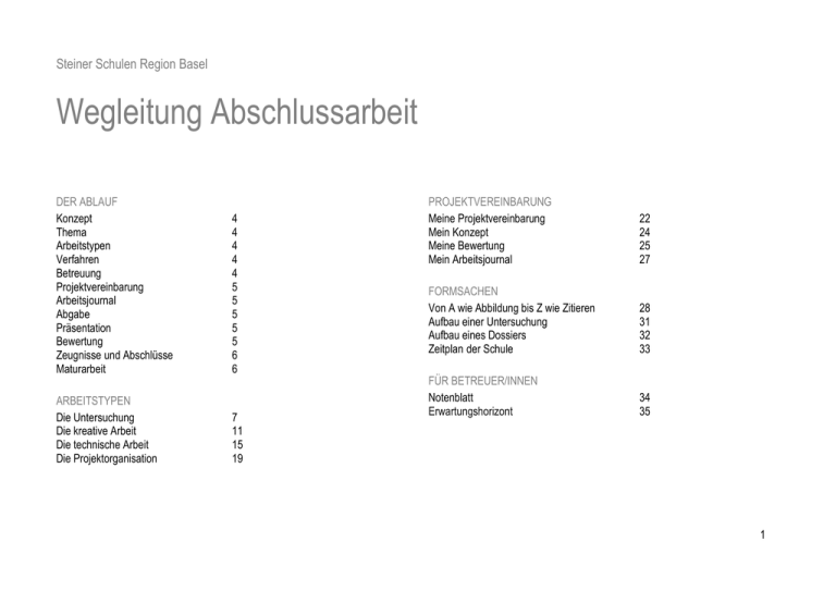Steiner Schulen Region Basel Wegleitung Abschlussarbeit DER ABLAUF Konzept Thema Arbeitstypen Verfahren Betreuung Projektvereinbarung Arbeitsjournal Abgabe Präsentation Bewertung Zeugnisse und Abschlüsse Maturarbeit ARBEITSTYPEN Die Untersuchung Die kreative Arbeit Die technische Arbeit Die Projektorganisation 4 4 4 4 4 5 5 5 5 5 6 6 7 11 15 19 PROJEKTVEREINBARUNG Meine Projektvereinbarung Mein Konzept Meine Bewertung Mein Arbeitsjournal 22 24 25 27 FORMSACHEN Von A wie Abbildung bis Z wie Zitieren Aufbau einer Untersuchung Aufbau eines Dossiers Zeitplan der Schule 28 31 32 33 FÜR BETREUER/INNEN Notenblatt Erwartungshorizont 34 35 1 GEMEINSAME WEGLEITUNG DER STEINER SCHULEN REGION BASEL Rudolf Steiner Schule Birseck Apfelseestrasse 1 | 4147 Aesch [email protected] www.steinerschule-birseck.ch Rudolf Steiner Schule Basel Jakobsbergerholzweg 54 | 4059 Basel [email protected] www.steinerschule-basel.ch FOS Freie Mittelschule Gründenstrasse 95 | 4132 Muttenz [email protected] www.fosmittelschule.ch Kontakt: Immanuel Büttner Telefon 061 756 90 70 [email protected] Kontakt: Daniel Hering Telefon 061 535 40 41 [email protected] Kontakt: Andreas Spalinger Telefon 061 463 97 60 [email protected] GYMNASIEN BASEL-STADT UND BASELLAND Die Wegleitung ist in Zusammenarbeit mit den Gymnasien Basel-Stadt und Baselland entstanden. Sie berücksichtigt die basellandschaftlichen „Weisungen der Schulleitungskonferenz zu den Maturaarbeiten“ vom 3. Juni 2008 und das „Reglement für die Maturaarbeit an den Gymnasien im Kanton Basel-Stadt (Reglement für die Maturaarbeit)“ vom 11. Juli 2008. UNSER DANK Wir danken Peter Bonati und Rudolf Hadorn für ihr anregendes Handbuch „Matura- und andere selbständige Arbeiten betreuen“, den Gymnasien Basel-Stadt für die Bereitschaft zu einer engen Zusammenarbeit und den Gymnasien Baselland für die regional einheitliche Regelung, die sie unkompliziert und schnell möglich gemacht haben. 2 Liebe Schülerinnen und Schüler NEULAND BETRETEN Wagen Sie mit Ihrer Abschlussarbeit Neuland zu betreten. Stellen Sie Untersuchungen oder Experimente an. Verfassen Sie Dramen oder Poesie. Wagen Sie eigenwillige Interpretationen eines musikalischen oder schriftlichen Werkes. Befragen Sie Menschen, die von Ihrem Thema betroffen sind. Entwerfen Sie eine Choreografie, die ihre Inspirationen zeigt. Erforschen Sie neue Sachverhalte. Vermeiden Sie hingegen Arbeiten, die fünf Bücher auf 20 Seiten zusammenfassen oder eine E-Gitarre gemäss Bausatz herstellen. Überlegen Sie von Anfang an, wie Sie den Schwerpunkt auf eine eigene Leistung legen können. SELBSTÄNDIGKEIT In einer Abschlussarbeit stellen Sie sich eine Aufgabe, die Sie über einen längeren Zeitraum bearbeiten. Es sind aufwendig Bücher oder Materialien zu suchen. Fachleute oder Betroffene werden einbezogen. Reisen, Ausflüge oder Besichtigungen müssen organisiert werden. Krisen, Frustrationen oder Fehlplanungen sind zu überwinden. Für die Präsentation braucht es ein Konzert, eine Aufführung oder eine Demonstration. Kurz: Sie werden neuen Herausforderungen begegnen, die Selbständigkeit und Durchhaltewillen beanspruchen. SACHLICHKEIT Abschlussarbeiten erfordern einen sachlichen Blick. Es ist wichtig, dass Ihre Ergebnisse klar, begründet und nachvollziehbar sind, dass Sie Ihre eigene Meinung von Tatsachenaussagen unterscheiden können, dass Sie einen bestimmten Lösungsweg verfolgen oder dass Sie sich am Ende darüber Rechenschaft ablegen, welchen Wert Ihre Ergebnisse haben. IHRE MÖGLICHKEITEN In dieser Wegleitung finden Sie beschrieben, welche Möglichkeiten Ihnen eine Abschlussarbeit bietet. Beachten Sie aber auch, dass sie Anforderungen formuliert, die verbindlich gelten. Damit Sie die Vorlagen digital verwenden können, steht Ihnen die Wegleitung auf unserer Webseite zur Verfügung. Viel Erfolg wünscht Ihnen Ihr Lehrerkollegium 3 Der Ablauf BIS MI, 13. APRIL 2011 KONZEPT Als erstes fertigen Sie ein Konzept an, das Ihre Abschlussarbeit umschreibt, vor allem welches Thema Sie bearbeiten möchten, worin Ihre Fragestellung besteht, welche Vorabklärungen nötig sind und mit welchem Mentor oder welcher Mentorin Sie zusammenarbeiten möchten. Ihr Konzept sollte überzeugend zeigen, dass Ihr Thema realisierbar ist. THEMA Ein Thema können Sie nach Interesse frei wählen. Entscheidend ist, dass Sie es eingrenzen und konkretisieren, damit es in einem Schuljahr bearbeitbar ist. Wählen Sie beispielsweise „Sonnenenergie“, dann wäre eine mögliche Konkretisierung „Installation einer Solaranlage auf dem Schuldach“. Empfehlenswert sind Themen, die Sie im Unterricht interessieren oder für Ihre künftige Ausbildungs- und Studienrichtung relevant sind. Der Mentor oder die Mentorin muss mit Ihrer Themenwahl einverstanden sein. ARBEITSTYPEN In der Wegleitung stellen wir Ihnen vier verschiedene Arbeitstypen vor: die Untersuchung, bei der Sie vor allem forschend tätig sind; die technische Arbeit, die zu einem technisch-handwerklichen Produkt führt; die kreative Arbeit, bei der Sie vor allem künstlerisch tätig sind; und die Projektorganisation, die Ihre organisatorischen Fähigkeiten herausfordert. VERFAHREN Ein Thema ist anhand verschiedener Verfahren bearbeitbar. Für den „Kroatienkrieg“ können beispielsweise historische Quellen ausgewertet (Verfahren: Quellenanalyse) oder Zeitzeugen befragt werden (Verfahren: Zeitzeugenbefragung). Entscheiden Sie sich zuerst für ein Thema, dann für einen Arbeitstyp und schliesslich für ein Verfahren, auf dem Sie Ihre Arbeit aufbauen können. BETREUUNG Für die Betreuung wählen Sie einen Mentor oder eine Mentorin Ihrer Schule. Ausserdem erhalten Sie einen Experten oder eine Expertin zugeteilt, der/die nur an besonderen Stationen anwesend ist. Gemeinsam mit dem Mentor oder der Mentorin bespricht und unterschreibt der Experte oder die Expertin die Projektvereinbarung, nimmt an dem Fachgespräch teil und bewertet Ihre Arbeit. Zusätzlich können Sie eine externe Fachperson