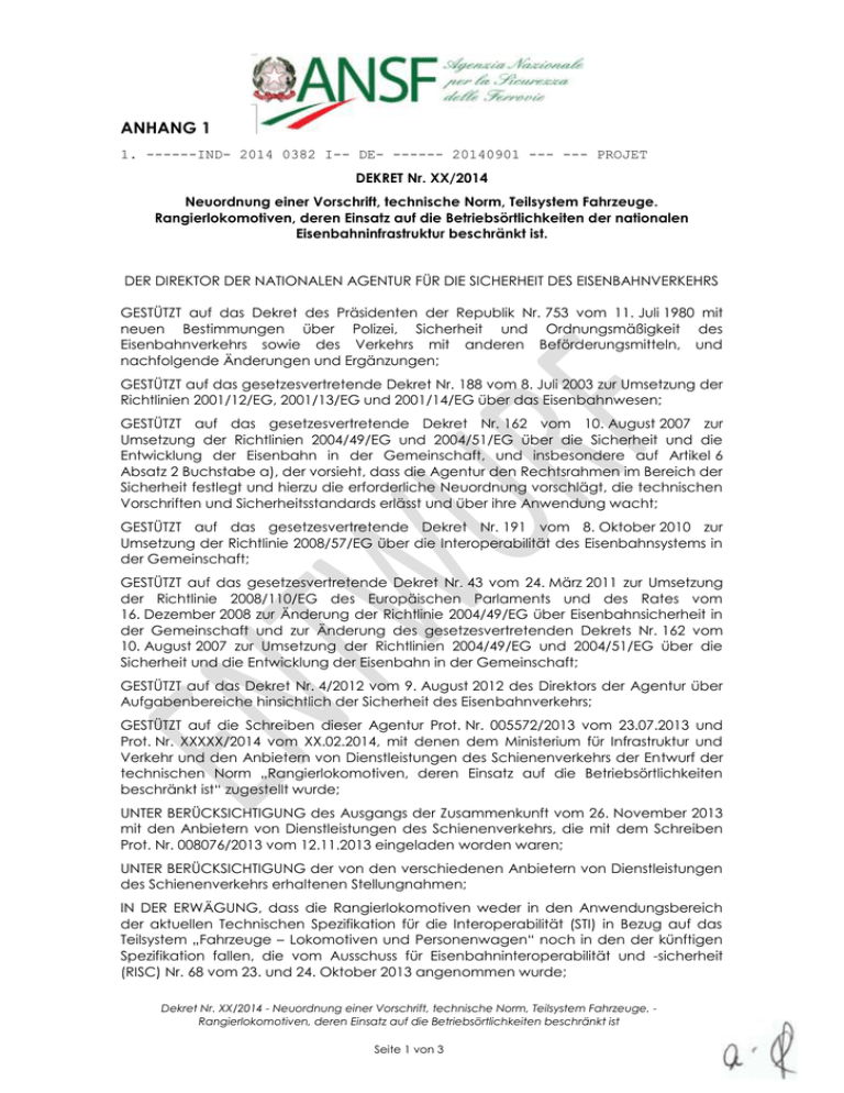 ANHANG 1 1. ------IND- 2014 0382 I-- DE- ------ 20140901 --- --- PROJET DEKRET Nr. XX/2014 Neuordnung einer Vorschrift, technische Norm, Teilsystem Fahrzeuge. Rangierlokomotiven, deren Einsatz auf die Betriebsörtlichkeiten der nationalen Eisenbahninfrastruktur beschränkt ist. DER DIREKTOR DER NATIONALEN AGENTUR FÜR DIE SICHERHEIT DES EISENBAHNVERKEHRS GESTÜTZT auf das Dekret des Präsidenten der Republik Nr. 753 vom 11. Juli 1980 mit neuen Bestimmungen über Polizei, Sicherheit und Ordnungsmäßigkeit des Eisenbahnverkehrs sowie des Verkehrs mit anderen Beförderungsmitteln, und nachfolgende Änderungen und Ergänzungen; GESTÜTZT auf das gesetzesvertretende Dekret Nr. 188 vom 8. Juli 2003 zur Umsetzung der Richtlinien 2001/12/EG, 2001/13/EG und 2001/14/EG über das Eisenbahnwesen; GESTÜTZT auf das gesetzesvertretende Dekret Nr. 162 vom 10. August 2007 zur Umsetzung der Richtlinien 2004/49/EG und 2004/51/EG über die Sicherheit und die Entwicklung der Eisenbahn in der Gemeinschaft, und insbesondere auf Artikel 6 Absatz 2 Buchstabe a), der vorsieht, dass die Agentur den Rechtsrahmen im Bereich der Sicherheit festlegt und hierzu die erforderliche Neuordnung vorschlägt, die technischen Vorschriften und Sicherheitsstandards erlässt und über ihre Anwendung wacht; GESTÜTZT auf das gesetzesvertretende Dekret Nr. 191 vom 8. Oktober 2010 zur Umsetzung der Richtlinie 2008/57/EG über die Interoperabilität des Eisenbahnsystems in der Gemeinschaft; GESTÜTZT auf das gesetzesvertretende Dekret Nr. 43 vom 24. März 2011 zur Umsetzung der Richtlinie 2008/110/EG des Europäischen Parlaments und des Rates vom 16. Dezember 2008 zur Änderung der Richtlinie 2004/49/EG über Eisenbahnsicherheit in der Gemeinschaft und zur Änderung des gesetzesvertretenden Dekrets Nr. 162 vom 10. August 2007 zur Umsetzung der Richtlinien 2004/49/EG und 2004/51/EG über die Sicherheit und die Entwicklung der Eisenbahn in der Gemeinschaft; GESTÜTZT auf das Dekret Nr. 4/2012 vom 9. August 2012 des Direktors der Agentur über Aufgabenbereiche hinsichtlich der Sicherheit des Eisenbahnverkehrs; GESTÜTZT auf die Schreiben dieser Agentur Prot. Nr. 005572/2013 vom 23.07.2013 und Prot. Nr. XXXXX/2014 vom XX.02.2014, mit denen dem Ministerium für Infrastruktur und Verkehr und den Anbietern von Dienstleistungen des Schienenverkehrs der Entwurf der technischen Norm „Rangierlokomotiven, deren Einsatz auf die Betriebsörtlichkeiten beschränkt ist“ zugestellt wurde; UNTER BERÜCKSICHTIGUNG des Ausgangs der Zusammenkunft vom 26. November 2013 mit den Anbietern von Dienstleistungen des Schienenverkehrs, die mit dem Schreiben Prot. Nr. 008076/2013 vom 12.11.2013 eingeladen worden waren; UNTER BERÜCKSICHTIGUNG der von den verschiedenen Anbietern von Dienstleistungen des Schienenverkehrs erhaltenen Stellungnahmen; IN DER ERWÄGUNG, dass die Rangierlokomotiven weder in den Anwendungsbereich der aktuellen Technischen Spezifikation für die Interoperabilität (STI) in Bezug auf das Teilsystem „Fahrzeuge – Lokomotiven und Personenwagen“ noch in den der künftigen Spezifikation fallen, die vom Ausschuss für Eisenbahninteroperabilität und -sicherheit (RISC) Nr. 68 vom 23. und 24. Oktober 2013 angenommen wurde; Dekret Nr. XX/2014 - Neuordnung einer Vorschrift, technische Norm, Teilsystem Fahrzeuge. Rangierlokomotiven, deren Einsatz auf die Betriebsörtlichkeiten beschränkt ist Seite 1 von 3 IN DER ERWÄGUNG der Notwendigkeit, die technischen Anforderungen festzulegen, welche die Lokomotiven erfüllen müssen, die ausschließlich Rangiertätigkeiten in den Betriebsörtlichkeiten der nationalen Eisenbahninfrastruktur durchführen, da es bislang keine solchen Vorgaben gibt; IN DER ERWÄGUNG von Artikel 24 Absatz 3-bis des Gesetzesdekrets Nr. 69 vom 21. Juni 2013 zur Änderung von Absatz 3 des Artikels 12 des gesetzesvertretenden Dekrets Nr. 162 vom 10. August 2007; UNTER BEACHTUNG des Informationsverfahrens gemäß den von der Richtlinie 98/34/EG in ihrer durch die Richtlinie 98/48/EG geänderten Fassung festgelegten Verpflichtungen; ZU DEM ZWECK, die Verfahren für die Inbetriebnahmegenehmigung für die Rangierlokomotiven, deren Einsatz auf die Betriebsörtlichkeiten der nationalen Eisenbahninfrastruktur beschränkt ist, zu regeln; erlässt das folgende DEKRET Artikel 1 Erlass einer neuen technischen Norm für das Teilsystem Fahrzeuge Es wird die technische Norm „Rangierlokomotiven, deren Einsatz auf die Betriebsörtlichkeiten der nationalen Eisenbahninfrastruktur beschränkt ist“ erlassen, die im Anhang zum vorliegenden Dekret aufgeführt ist. Artikel 2 Anwendung der technischen Norm 1. Ab dem Datum des Inkrafttretens des vorliegenden Dekrets müssen die Verfahren für die Inbetriebnahmegenehmigung für die Rangierlokomotiven, deren Einsatz auf die Betriebsörtlichkeiten der nationalen Eisenbahninfrastruktur beschränkt ist, in Einklang mit der beigefügten technischen Norm ablaufen. 2. Die technische Norm gilt für alle Rangierlokomotiven unter Berücksichtigung der Typen A und B, wie sie in Kapitel 1 des Anhangs bestimmt sind. 3. Die Norm für Typ A gilt für neu gebaute Lokomotiven und die Norm für Typ B gilt, in Einklang mit den Bestimmungen von Artikel 12 Absatz 3-bis des gesetzesvertretenden Dekrets Nr. 162/2007, für die bestehenden Lokomotiven (Typ B) und ist als eine Gesamtheit von technischen Mindestanforderungen zu verstehen, die erfüllt sein müssen, damit die zu diesem Typ gehörenden Lokomotiven die Genehmigung erhalten können. 4. Die technische Norm findet ferner nach den Modalitäten und dem Zeitrahmen, die in Kapitel 19 des Anhangs festgelegt sind, für die Rangierlokomotiven Anwendung, die zum Zeitpunkt des Inkrafttretens des vorliegenden Dekrets schon im Nationalen Einstellungsregister registriert waren. Für diese Lokomotiven ist in Einklang mit den im Kapitel 19 des Anhangs festgelegten Fristen innerhalb von 6 Monaten nach Inkrafttreten des vorliegenden Dekrets ein Plan für die Anpassung an die v
