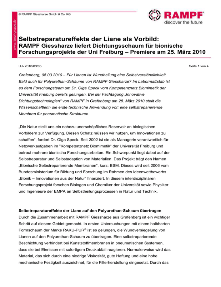 © RAMPF Giessharze GmbH & Co. KG Selbstreparatureffekte der Liane als Vorbild: RAMPF Giessharze liefert Dichtungsschaum für bionische Forschungsprojekte der Uni Freiburg – Premiere am 25. März 2010 UJ- 2010/03/05 Grafenberg, 05.03.2010 – Für Lianen ist Wundheilung eine Selbstverständlichkeit. Bald auch für Polyurethan-Schäume von RAMPF Giessharze? Im Labormaßstab ist es dem Forschungsteam um Dr. Olga Speck vom Kompetenznetz Biomimetik der Universität Freiburg bereits gelungen. Bei der Fachtagung „Innovative Dichtungstechnologien“ von RAMPF in Grafenberg am 25. März 2010 stellt die Wissenschaftlerin die erste technische Anwendung vor: eine selbstreparierende Membran für pneumatische Strukturen. „Die Natur stellt uns ein nahezu unerschöpfliches Reservoir an biologischen Vorbildern zur Verfügung. Diesen Schatz müssen wir nutzen, um Innovationen zu schaffen“, fordert Dr. Olga Speck. Seit 2002 ist sie als Managerin verantwortlich für Netzwerkaufgaben im "Kompetenznetz Biomimetik“ der Universität Freiburg und betreut mehrere bionische Forschungsarbeiten. Ein Schwerpunkt liegt dabei auf der Selbstreparatur und Selbstadaption von Materialien. Das Projekt trägt den Namen „Bionische Selbstreparierende Membranen“, kurz: BSM. Dieses wird seit 2006 vom Bundesministerium für Bildung und Forschung im Rahmen des Ideenwettbewerbs „Bionik – Innovationen aus der Natur“ finanziert. In diesem interdisziplinären Forschungsprojekt forschen Biologen und Chemiker der Universität sowie Physiker und Ingenieure der EMPA an Selbstheilungsprozessen in Natur und Technik. Selbstreparatureffekte der Liane auf den Polyurethan-Schaum übertragen Durch die Zusammenarbeit mit RAMPF Giessharze aus Grafenberg ist ein wichtiger Schritt auf diesem Gebiet gemacht. In ersten Untersuchungen mit einem halbharten Formschaum der Marke RAKU-PUR® ist es gelungen, die Wundversiegelung von Lianen auf den Polyurethan-Schaum zu übertragen. Eine selbstreparierende Beschichtung verhindert bei Kunststoffmembranen in pneumatischen Systemen, dass sie bei Einrissen mit sofortigem Druckabfall reagieren. Normalerweise wird das Material, das sich durch eine niedrige Viskosität, gute Haftung und eine hohe mechanische Festigkeit auszeichnet, für die Filterherstellung eingesetzt. Durch das Seite 1 von 4 © RAMPF Giessharze GmbH & Co. KG Selbstreparatureffekte der Liane als Vorbild: RAMPF Giessharze liefert Dichtungsschaum für bionische Forschungsprojekte der Uni Freiburg – Premiere am 25. März 2010 Seite 2 von 4 BSM-Projekt wäre in Zukunft ein ganz anderer Einsatz von RAKU-PUR® denkbar etwa beim Bau von Veranstaltungshallen oder Behelfsbrücken mit der aufblasbaren Leichtbautragstruktur Tensairity®, welche an der EMPA in der Schweiz untersucht wird. Erste Versuche sprechen für sich. „Bei Verletzungen mit Nägeln bis zu einem Durchmesser von fünf Millimetern konnte die Geschwindigkeit des Druckabfalls im Vergleich zu unbeschichteten Membranen um zwei bis drei Größenordnungen verringert werden und somit ein hervorragender Selbstreparatureffekt erzielt werden. Selbst Luftmatratzen oder Schlauchboote könnten vielleicht eines Tages von den luftigen Konstruktionen profitieren“, ergänzt Speck. Beim Fachsymposium „Innovative Dichtungstechnologien der Firma RAMPF Giessharze am 25. März 2010 in Grafenberg präsentiert die Wissenschaftlerin ihre Arbeit. Im nächsten Schritt soll die Umsetzung auf einer automatisierten Dosierzelle DC-CNC von Partnerunternehmen RAMPF Dosiertechnik erprobt werden. Verschmelzung von Wissenschaft und Wirtschaft „Die Firma RAMPF ist mit Innovationen groß geworden. Und die Entwicklung geht weiter. Unsere Partner von der Universität Freiburg sind ein eindrücklicher Beweis dafür“, freut sich Dr. Klaus Schamel, Geschäftsführer RAMPF Giessharze. Im erst kürzlich erbauten Innovationszentrum will er seine Gäste in die Marke RAKU-PUR® eintauchen lassen. Dabei verschmelzen Wissenschaft und Wirtschaft. In Zusammenarbeit mit der Fachhochschule Bern wird das Schlagwort Innovation auf wissenschaftlichem Niveau geschult und im Workshop umgesetzt. Neben praktischen Vorführungen der neuesten Technologien von RAMPF stehen Vorträge von weiteren namhaften Partnern und Kunden auf dem Programm. Dazu zählen die Bayer Material Science AG und die Kuka Roboter GmbH. Zur Zielgruppe des eintägigen Seminars gehören Anwender aus sämtlichen Schlüsselindustrien. Die Dichtsysteme der Marke RAKU-PUR® kommen in Schaltschränken, Leuchten, Haushaltsgeräten, aber auch im Automobil zum Einsatz. „Den Anwendungsmöglichkeiten sind keine Grenzen gesetzt“, betont Schamel. i Fachtagung „Innovative Dichtungstechnologien“, Grafenberg, 25.03.2010 Die eintägige Fachtagung „Innovative Dichtungstechnologien“ findet am 25.03.2010 in Grafenberg statt. Es wird ein Unkostenbeitrag von 80 Euro erhoben. Weitere Informationen © RAMPF Giessharze GmbH & Co. KG Selbstreparatureffekte der Liane als Vorbild: RAMPF Giessharze liefert Dichtungsschaum für bionische Forschungsprojekte der Uni Freiburg – Premiere am 25. März 2010 Seite 3 von 4 erhalten Sie per Mail an [email protected] oder unter Telefon +49 (0) 7123 93420. BU: Die aufblasbare Leichtbautragstruktur Tensairity® könnte bald mit einer selbstreparierenden Beschichtung aus Formschaum von RAMPF ausgerüstet sein. Das Bild zeigt das Dach eines Parkhauses in Montreux in der Schweiz, das die Firmen Airlight und Luscher Architectes mit Tensairity Balken 2004 gebaut haben. © RAMPF Giessharze GmbH & Co. KG Selbstreparatureffekte der Liane als Vorbild: RAMPF Giessharze liefert Dichtungsschaum für bionische Forschungsprojekte der Uni Freiburg – Premiere am 25. März 2010 Seite 4 von 4 BU: Lianen sind nicht nur Kletterkünstler, ihre Selbstreparatureffekte sind vorbildlich. © Gerd Reiber Fotolia.com www.kompetenznetz-biomimetik.de – Universität Freiburg Die Plant Biomechanics Group Freiburg deckt mit ihren Kompetenzen die gesamte 