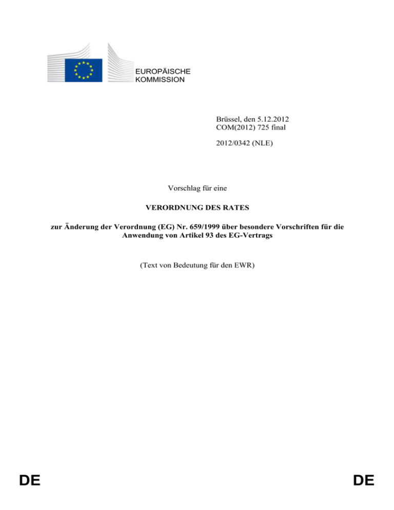 EUROPÄISCHE KOMMISSION Brüssel, den 5.12.2012 COM(2012) 725 final 2012/0342 (NLE) Vorschlag für eine VERORDNUNG DES RATES zur Änderung der Verordnung (EG) Nr. 659/1999 über besondere Vorschriften für die Anwendung von Artikel 93 des EG-Vertrags (Text von Bedeutung für den EWR) DE DE BEGRÜNDUNG 1. HINTERGRUND DES VORSCHLAGS Die europäischen Vorschriften für staatliche Beihilfen wurden zunächst in die Verträge zur Gründung der Europäischen Gemeinschaft für Kohle und Stahl (1952) und der Europäischen Wirtschaftsgemeinschaft (1957) aufgenommen und sind nun im Vertrag über die Arbeitsweise der Europäischen Union (im Folgenden „AEUV“ oder „Vertrag“) verankert. In Artikel 107 AEUV ist der Begriff „staatliche Beihilfe“ definiert und dargelegt, unter welchen Voraussetzungen eine solche Beihilfe als mit dem Binnenmarkt vereinbar erachtet werden kann. Artikel 108 AEUV enthält die wichtigsten Verfahrensgrundsätze für das Handeln der Kommission, die dafür Sorge trägt, dass die Mitgliedstaaten die materiellrechtlichen Vorschriften für staatliche Beihilfen einhalten. Nach Artikel 109 AEUV kann der Rat auf Vorschlag der Kommission und nach Anhörung des Europäischen Parlaments alle zweckdienlichen Durchführungsverordnungen zu den Artikeln 107 und 108 erlassen. 1999 erließ der Rat die Verordnung (EG) Nr. 659/19991 (im Folgenden „Verfahrensverordnung“), in der die Verfahrensvorschriften für die Durchsetzung der Artikel 107 und 108 AEUV präzisiert wurden. Diese Vorschriften werden bis heute ohne nennenswerte Änderungen angewandt. Beihilfeverfahren verlaufen nach Artikel 108 AEUV und den weiteren Ausführungen der Verfahrensverordnung im Grunde über drei Hauptachsen: 1 DE – Die Mitgliedstaaten müssen alle geplanten Beihilfemaßnahmen, sofern sie nicht unter eine Gruppenfreistellungsverordnung oder einen Freistellungsbeschluss fallen, bei der Kommission anmelden und dürfen die Beihilfemaßnahmen erst durchführen, nachdem die Kommission einen Genehmigungsbeschluss erlassen hat. Nach einer im Wesentlichen zwischen Kommission und Mitgliedstaat bilateral erfolgenden vorläufigen Prüfung („Phase I“), die höchstens zwei Monate dauern sollte, kann die Kommission die Beihilfe entweder genehmigen oder aber ein förmliches Prüfverfahren („Phase II“) einleiten, das sie möglichst nach 18 Monaten abschließen sollte, um dann die Beihilfe (falls erforderlich unter Bedingungen) zu genehmigen oder zu untersagen. – Die Kommission muss alle Beschwerden von Beteiligten sorgfältig und unvoreingenommen prüfen und ohne ungebührliche Verzögerung über deren Stichhaltigkeit entscheiden. Kommt sie nach Prüfung der Beschwerde zu dem Schluss, dass es sich bei der Maßnahme nicht um eine staatliche Beihilfe handelt, so muss die Kommission dem Beschwerdeführer zumindest in hinreichender Weise die Gründe darlegen, aus denen die in der Beschwerde angeführten sachlichen und rechtlichen Gesichtspunkte nicht zum Nachweis des Vorliegens einer staatlichen Beihilfe genügt haben. Verordnung (EG) Nr. 659/1999 des Rates vom 22. März 1999 über besondere Vorschriften für die Anwendung von Artikel 93 des EG-Vertrags (ABl. L 83 vom 27.3.1999, S. 1). 2 DE – Ferner überprüft die Kommission fortlaufend alle in den Mitgliedstaaten bestehenden Beihilferegelungen und schlägt ihnen zweckdienliche Maßnahmen vor, falls sie dies aufgrund der fortschreitenden Entwicklung des Binnenmarkts für erforderlich erachtet. Diese Eckpunkte des Beihilfeverfahrens leiten sich unmittelbar aus dem im Vertrag vorgesehenen System der Beihilfenkontrolle ab, nach dem ausschließlich die Kommission zur Prüfung der Vereinbarkeit einer staatlichen Beihilfe mit dem Binnenmarkt befugt ist. Mehr als 13 Jahre nach ihrem Inkrafttreten ist eine Modernisierung der Verfahrensverordnung erforderlich, um das Beihilfeverfahren in einer Europäischen Union, die heute 27 Mitgliedstaaten, 500 Millionen Menschen und 23 Amtssprachen umfasst, an die neuen Gegebenheiten anzupassen. Die Wirtschafts- und Finanzkrise hat an der Integrität des Binnenmarkts gerüttelt und gezeigt, dass eine straffe und effiziente Beihilfenkontrolle und Durchsetzung des Beihilferechts von höchster Bedeutung sind. Gleichzeitig wurde deutlich, dass die Kommission über bessere Instrumente verfügen muss, damit sie in einem für Unternehmen annehmbaren Zeitrahmen handeln und den nachhaltigen Einsatz öffentlicher Mittel für wachstumsorientierte Maßnahmen fördern kann. Am 8. Mai 2012 gab die Kommmission mit ihrer Mitteilung zur „Modernisierung des EUBeihilfenrechts“2 den Startschuss für eine umfassende Reform des beihilferechtlichen Regelwerks der Europäischen Union. Die Reform soll Gewähr dafür bieten, dass die Beihilfepolitik der Union sowohl zur Umsetzung der für dieses Jahrzehnt formulierten EUWachstumsstrategie „Europa 2020“3 als auch zur haushaltspolitischen Konsolidierung beiträgt. Die Überarbeitung der Verfahrensverordnung soll dazu beitragen, dass die Kommission die mit dieser Reform angestrebten Ziele erreichen kann. Durch die Modernisierung der Beihilfeverfahren soll in erster Linie die Wirksamkeit der Beihilfenkontrolle erhöht werden.4 Auch der Rechnungshof hat in seinem Sonderbericht Nr. 15/2011 mit dem Titel „Ist durch die Verfahren der Kommission eine wirksame Verwaltung der Kontrolle staatlicher Beihilfen gewährleistet?“5 nachdrücklich darauf hingewiesen, dass eine Reform der Beihilfeverfahren erforderlich ist. Mit der vorgeschlagenen Verfahrensreform für Beihilfesachen berücksichtigt die Kommission insbesondere folgende Empfehlungen des Rechnungshofs: – 2 3 4 5 DE Beschränkung der Auskunftsersuchen an Mitgliedstaaten auf ein Minimum Mitteilung der Kommission an das Europäische Parlament, den Rat, den Europäischen Wirtschafts- und Sozialausschuss und den Ausschuss der Regionen: Modernisierung des EU-Beihilfenrechts (COM(2012) 209 final vom 8.5.2012). Mitteilung der Kommission an das Europäisc