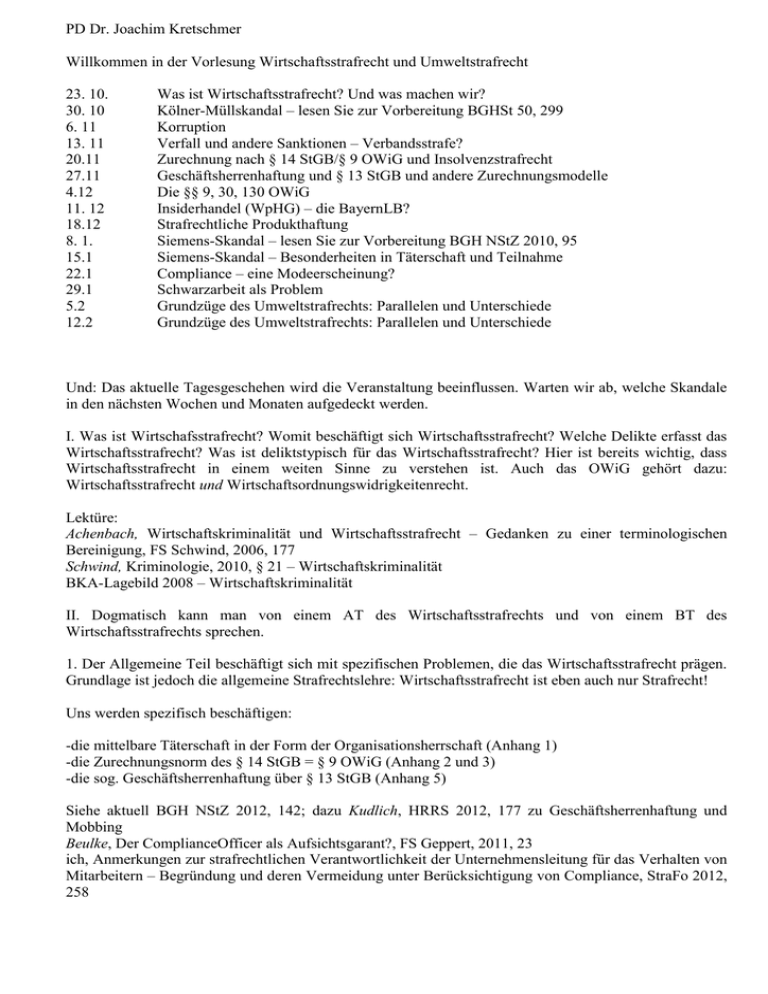 PD Dr. Joachim Kretschmer Willkommen in der Vorlesung Wirtschaftsstrafrecht und Umweltstrafrecht 23. 10. 30. 10 6. 11 13. 11 20.11 27.11 4.12 11. 12 18.12 8. 1. 15.1 22.1 29.1 5.2 12.2 Was ist Wirtschaftsstrafrecht? Und was machen wir? Kölner-Müllskandal – lesen Sie zur Vorbereitung BGHSt 50, 299 Korruption Verfall und andere Sanktionen – Verbandsstrafe? Zurechnung nach § 14 StGB/§ 9 OWiG und Insolvenzstrafrecht Geschäftsherrenhaftung und § 13 StGB und andere Zurechnungsmodelle Die §§ 9, 30, 130 OWiG Insiderhandel (WpHG) – die BayernLB? Strafrechtliche Produkthaftung Siemens-Skandal – lesen Sie zur Vorbereitung BGH NStZ 2010, 95 Siemens-Skandal – Besonderheiten in Täterschaft und Teilnahme Compliance – eine Modeerscheinung? Schwarzarbeit als Problem Grundzüge des Umweltstrafrechts: Parallelen und Unterschiede Grundzüge des Umweltstrafrechts: Parallelen und Unterschiede Und: Das aktuelle Tagesgeschehen wird die Veranstaltung beeinflussen. Warten wir ab, welche Skandale in den nächsten Wochen und Monaten aufgedeckt werden. I. Was ist Wirtschafsstrafrecht? Womit beschäftigt sich Wirtschaftsstrafrecht? Welche Delikte erfasst das Wirtschaftsstrafrecht? Was ist deliktstypisch für das Wirtschaftsstrafrecht? Hier ist bereits wichtig, dass Wirtschaftsstrafrecht in einem weiten Sinne zu verstehen ist. Auch das OWiG gehört dazu: Wirtschaftsstrafrecht und Wirtschaftsordnungswidrigkeitenrecht. Lektüre: Achenbach, Wirtschaftskriminalität und Wirtschaftsstrafrecht – Gedanken zu einer terminologischen Bereinigung, FS Schwind, 2006, 177 Schwind, Kriminologie, 2010, § 21 – Wirtschaftskriminalität BKA-Lagebild 2008 – Wirtschaftskriminalität II. Dogmatisch kann man von einem AT des Wirtschaftsstrafrechts und von einem BT des Wirtschaftsstrafrechts sprechen. 1. Der Allgemeine Teil beschäftigt sich mit spezifischen Problemen, die das Wirtschaftsstrafrecht prägen. Grundlage ist jedoch die allgemeine Strafrechtslehre: Wirtschaftsstrafrecht ist eben auch nur Strafrecht! Uns werden spezifisch beschäftigen: -die mittelbare Täterschaft in der Form der Organisationsherrschaft (Anhang 1) -die Zurechnungsnorm des § 14 StGB = § 9 OWiG (Anhang 2 und 3) -die sog. Geschäftsherrenhaftung über § 13 StGB (Anhang 5) Siehe aktuell BGH NStZ 2012, 142; dazu Kudlich, HRRS 2012, 177 zu Geschäftsherrenhaftung und Mobbing Beulke, Der ComplianceOfficer als Aufsichtsgarant?, FS Geppert, 2011, 23 ich, Anmerkungen zur strafrechtlichen Verantwortlichkeit der Unternehmensleitung für das Verhalten von Mitarbeitern – Begründung und deren Vermeidung unter Berücksichtigung von Compliance, StraFo 2012, 258 -neutrale oder berufsadäquate Handlung als Beihilfe Hinzuweisen ist auch auf besondere Rechtsfolgen im Wirtschaftsstrafrecht: -Verbandsstrafbarkeit? -die Verbandsgeldbuße (§ 30 OWiG – Anhang 2) -Verfall (Anhang 2) 2. Der Besondere Teil des Wirtschaftsstrafrechts beschäftigt sich mit besonderen Delikten des Wirtschaftsstrafrechts. Neben dem StGB finden sich viele Tatbestände im sog. Nebenstrafrecht und viele Delikte haben den Charakter von Ordnungswidrigkeiten. Alles Weitere in der Vorlesung, in der wir auch stets den Blick auf das aktuelle Tagesgeschehen haben werden. So wird heute – September 2012 – aktuell über einen Schmiergeldprozess gegen einen ehemaligen MAN-Vorstand berichtet – der Vorwurf lautet auf Beihilfe zur Bestechung durch Unterlassen. III. In fallorientierter Weise werden wir uns mit zwei typischen –berühmten und noch aktuellen- Fällen intensiv beschäftigen. 1. Der „Kölner-Müllskandal in BGHSt 50, 299 = NStZ 2006, 210 (unbedingt lesen!) Es sind drei Themengebiete, die uns an diesem Fall beschäftigen werden: -Bestechungsdelikte und hier besonders der Amtsträgerbegriff (Einleitungsfälle: BGH NJW 2008, 3580 = Satzger JK StGB § 333/Nr.2 (WM-Tickets) und BGH JR 2010, 122 mit Anm. Kretschmer (Fall Emig) – Anhang 4 aktuell: BGH NStZ 2012, 505 - Kassenärzte -Untreue nach § 266 StGB (Einleitungsfall: BGH JR 2008, 344 mit Anm. Kretschmer (Kautions-Fall) – Anhang 7 und 8 -der Verfall als Methode der Gewinnabschöpfung (Anhang 2) aktuell BGH v. 29.6.2010 – 1 StR 245/09 (Fall „Falk“) ebenso BGH NStZ 2012, 265 mit Anm. Wagner NStZ 2012, 381 2. Der Fall „Siemens“ in BGH NStZ 2009, 95 (unbedingt lesen!) Es sind drei Themengebiete, die uns an diesem Fall beschäftigen werden: -nochmals die Untreue nach § 266 StGB: eben das typische Delikt im Wirtschaftsstrafrecht – Anhang 7 und 8 -Auslandsbestechung mit den EUBestG und dem IntBestG -mittelbare Täterschaft als Organisationsherrschaft (war nicht fallrelevant, Anhang 1) Lektüre: Satzger, Schwarze Kassen zwischen Untreue und Korruption, NStZ 2009, 297 Saliger/Gaede, HRRS 2008, 57 zu „Siemens“ B. Heinrich, Anmerkung zu Emig, JZ 2010, 525 (stimmt dem BGH zu) IV. Die Geschäftsherrenhaftung mit § 13 StGB und compliance (Anhang 5) -siehe BGH JR 2009, 471 mit Anm. von J. Kretschmer -siehe auch BGH StV 2012, 413: Mobbing, dazu Mansdörfer, StV 2012, 432 -Geschäftsherrenhaftung: Haftet das Leitungsorgan eines Unternehmens über § 13 StGB strafrechtlich für betriebsbezogene Rechtsverstöße, die einzelne Mitarbeiter eigenverantwortlich begehen? Wenn ja, in welchem Umfang gilt diese sog. Geschäftsherrenhaftung? -Stichwort: compliance: BGH JR 2009, 471 = StV 2009, 687 (als obiter dictum) mit Anm. Berndt, StV 2009, 689: dieses obiter dictum verursachte eine heftige Diskussion um den compliance officer, siehe auch Mosbacher/Dierlamm, NStZ 2010, 268 -zum Stichwort Compliance gehen Sie doch mal auf die website von Siemens und gegen Sie das Stichwort compliance ein. V. Die Zurechnungsnorm des § 14 StGB/§ 9 OWiG (Anhang 2 und 3) -faktischer Geschäftsführer -Ende der Interessentheorie – was nun? -Insolvenzstrafrecht – die §§ 283 ff StGB -§ 266a StGB 1. § 266a StGB -Beispiel: Täter des § 266a StGB ist der Arbeitgeber. Hier wirkt § 14 StGB. § 14 erweitert den Kreis der Normadressaten. Wie und