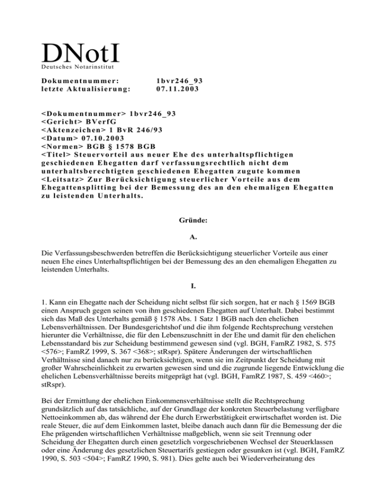 DNotI Deu t s ch es No t ar i n s t i t u t Dok u me n tn u m me r : l e t zt e Ak tu a l i si e ru n g: 1b v r2 46_ 93 07. 11 .20 03 <Do k u men tn u mme r> 1b vr 24 6_9 3 < Ge ri ch t> B Ve rf G <Ak t en z ei ch en > 1 B vR 24 6/ 9 3 <Da tu m> 0 7.1 0. 20 0 3 <No r me n > B GB § 1 578 B GB <T i t el > S t eu er vo r t ei l au s n eu er E h e d e s u n t e rh a l t sp f l i ch ti g en ge s ch i ed en en E h eg at t en d arf v e rf assu n gs re ch tl i ch n i ch t d e m u n t erh al ts b e r ech ti gt en g es ch i ed en en E h eg a tt en zu gu te k o mme n <L e i t s a t z> Z u r B er ü ck si ch ti gu n g s teu e rl i ch er Vo rt ei l e a u s d e m E h eg a tt en sp l i tt i n g b ei d e r B e me s su n g d es an d en eh e ma l i gen E h ega t t en zu l ei s ten d en Un t e rh al t s. Gründe: A. Die Verfassungsbeschwerden betreffen die Berücksichtigung steuerlicher Vorteile aus einer neuen Ehe eines Unterhaltspflichtigen bei der Bemessung des an den ehemaligen Ehegatten zu leistenden Unterhalts. I. 1. Kann ein Ehegatte nach der Scheidung nicht selbst für sich sorgen, hat er nach § 1569 BGB einen Anspruch gegen seinen von ihm geschiedenen Ehegatten auf Unterhalt. Dabei bestimmt sich das Maß des Unterhalts gemäß § 1578 Abs. 1 Satz 1 BGB nach den ehelichen Lebensverhältnissen. Der Bundesgerichtshof und die ihm folgende Rechtsprechung verstehen hierunter die Verhältnisse, die für den Lebenszuschnitt in der Ehe und damit für den ehelichen Lebensstandard bis zur Scheidung bestimmend gewesen sind (vgl. BGH, FamRZ 1982, S. 575 <576>; FamRZ 1999, S. 367 <368>; stRspr). Spätere Änderungen der wirtschaftlichen Verhältnisse sind danach nur zu berücksichtigen, wenn sie im Zeitpunkt der Scheidung mit großer Wahrscheinlichkeit zu erwarten gewesen sind und die zugrunde liegende Entwicklung die ehelichen Lebensverhältnisse bereits mitgeprägt hat (vgl. BGH, FamRZ 1987, S. 459 <460>; stRspr). Bei der Ermittlung der ehelichen Einkommensverhältnisse stellt die Rechtsprechung grundsätzlich auf das tatsächliche, auf der Grundlage der konkreten Steuerbelastung verfügbare Nettoeinkommen ab, das während der Ehe durch Erwerbstätigkeit erwirtschaftet worden ist. Die reale Steuer, die auf dem Einkommen lastet, bleibe danach auch dann für die Bemessung der die Ehe prägenden wirtschaftlichen Verhältnisse maßgeblich, wenn sie seit Trennung oder Scheidung der Ehegatten durch einen gesetzlich vorgeschriebenen Wechsel der Steuerklassen oder eine Änderung des gesetzlichen Steuertarifs gestiegen oder gesunken ist (vgl. BGH, FamRZ 1990, S. 503 <504>; FamRZ 1990, S. 981). Dies gelte auch bei Wiederverheiratung des unterhaltspflichtigen Ehegatten. Ein damit eintretender Splittingvorteil müsse nicht bei ihm und seiner neuen Familie verbleiben, vielmehr seien auch in diesem Fall bei der Unterhaltsberechnung die tatsächlich entrichteten Steuern vom Bruttoeinkommen abzusetzen. Habe sich allerdings der unterhaltspflichtige Ehegatte in die Steuerklasse V einstufen lassen, sei die tatsächlich einbehaltene Lohnsteuer durch einen Abschlag zu korrigieren, durch den die mit dieser Einstufung verbundene Verschiebung der Steuerlast auf den unterhaltspflichtigen Ehegatten möglichst behoben wird (vgl. BGH, FamRZ 1980, S. 984). Etwas anderes müsse allerdings für den Fall gelten, dass dem Unterhaltspflichtigen nicht genügend Mittel für den Unterhalt seines neuen Ehegatten verblieben. Hier wäre es grob unbillig, wenn der Unterhaltspflichtige den um der neuen Ehe willen gewährten Splittingvorteil für den früheren Ehegatten einzusetzen hätte. Deshalb sei es gerechtfertigt, den Unterhaltsanspruch nach § 1579 Nr. 7 BGB auf den Betrag zu kürzen, der sich ohne Berücksichtigung des Splittingvorteils ergebe (vgl. BGH, FamRZ 1985, S. 911 f.). Allerdings sei vom tatsächlichen Steuerabzug dann nicht auszugehen, wenn die Steuerersparnis Folge tatsächlicher Aufwendungen sei, die zur Vermögensbildung erbracht und unterhaltsrechtlich nicht einkommensmindernd berücksichtigt würden. 2. a) Gemäß § 26 EStG in der Fassung der Bekanntmachung vom 7. September 1990 (BGBl I S. 1898); können Ehegatten, sofern sie nicht dauerhaft getrennt leben, zwischen zwei verschiedenen steuerlichen Veranlagungsarten wählen: der getrennten Veranlagung sowie der Zusammenveranlagung unter Anwendung des Splittingtarifs (§§ 26 b, 32 a Abs. 5 EStG). Bei der Zusammenveranlagung wird zur Berechnung der Steuerlast zunächst das zu versteuernde Jahreseinkommen beider Ehegatten halbiert und hiernach die Einkommensteuer aus der Einkommensteuergrundtabelle ermittelt, die dann wieder verdoppelt wird. Der so gemäß § 32 a Abs. 5 EStG errechnete Betrag bildet die Gesamtsteuer für das Ehepaar. Der Steuervorteil, der sich für ein Ehepaar aus der Zusammenveranlagung ergibt, ist wegen der Abmilderung der Steuerprogression durch das Splitting am höchsten, wenn nur ein Ehegatte Einkommen erzielt, und nimmt umso mehr ab, je mehr der andere Ehegatte ebenfalls zum Haushaltseinkommen beiträgt. Bei gleich hohem Einkommen der Ehegatten entsteht kein Splittingvorteil. Die Einkommensteuer wird zunächst gemäß den §§ 38 ff. EStG durch Quellenabzug vom Arbeitslohn als Lohnsteuer erhoben. Für die Durchführung des monatlichen Lohnsteuerabzugs werden unbeschränkt einkommensteuerpflichtige Arbeitnehmer in Steuerklassen eingereiht (§ 38 b EStG). Beziehen beide nicht getrennt lebenden Ehegatten Einkommen, werden sie jeweils der Steuerklasse IV zugeordnet. Auf ihren Antrag kann jedoch von ihnen auch die Kombination von Steuerklasse III (niedrigerer Steuersatz für einen der Ehegatten) mit der Steuerklasse V (höherer Steuersatz für den anderen Ehegatten) gewählt werden. Bezieht nur ein Ehegatte Arbeitslohn, wird er in die Steuerklasse III eingereiht. Nach Ablauf des Kalenderjahres wird für Ehegatten, die beide Arbeitslohn bezogen haben, die Einkommensteuer gemäß § 25 Abs. 1 EStG auf der Basis einer von beiden Ehegatten abzugebenden gemeinsame