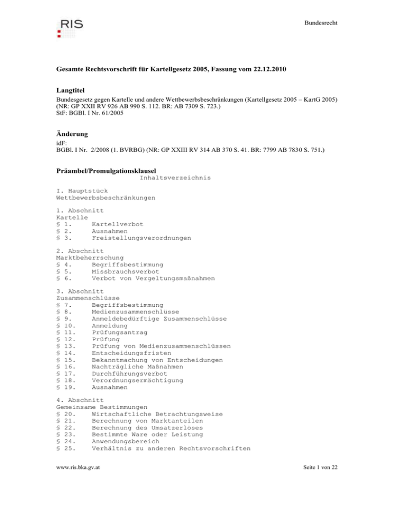 Bundesrecht Gesamte Rechtsvorschrift für Kartellgesetz 2005, Fassung vom 22.12.2010 Langtitel Bundesgesetz gegen Kartelle und andere Wettbewerbsbeschränkungen (Kartellgesetz 2005 – KartG 2005) (NR: GP XXII RV 926 AB 990 S. 112. BR: AB 7309 S. 723.) StF: BGBl. I Nr. 61/2005 Änderung idF: BGBl. I Nr. 2/2008 (1. BVRBG) (NR: GP XXIII RV 314 AB 370 S. 41. BR: 7799 AB 7830 S. 751.) Präambel/Promulgationsklausel Inhaltsverzeichnis I. Hauptstück Wettbewerbsbeschränkungen 1. Abschnitt Kartelle § 1. Kartellverbot § 2. Ausnahmen § 3. Freistellungsverordnungen 2. Abschnitt Marktbeherrschung § 4. Begriffsbestimmung § 5. Missbrauchsverbot § 6. Verbot von Vergeltungsmaßnahmen 3. Abschnitt Zusammenschlüsse § 7. Begriffsbestimmung § 8. Medienzusammenschlüsse § 9. Anmeldebedürftige Zusammenschlüsse § 10. Anmeldung § 11. Prüfungsantrag § 12. Prüfung § 13. Prüfung von Medienzusammenschlüssen § 14. Entscheidungsfristen § 15. Bekanntmachung von Entscheidungen § 16. Nachträgliche Maßnahmen § 17. Durchführungsverbot § 18. Verordnungsermächtigung § 19. Ausnahmen 4. Abschnitt Gemeinsame Bestimmungen § 20. Wirtschaftliche Betrachtungsweise § 21. Berechnung von Marktanteilen § 22. Berechnung des Umsatzerlöses § 23. Bestimmte Ware oder Leistung § 24. Anwendungsbereich § 25. Verhältnis zu anderen Rechtsvorschriften www.ris.bka.gv.at Seite 1 von 22 Bundesrecht II. Hauptstück Rechtsdurchsetzung 1. Abschnitt Abstellung von Zuwiderhandlungen und Feststellungen § 26. § 27. § 28. Abstellung Verpflichtungszusagen Feststellungen 2. Abschnitt Geldbußen § § § § § 29. 30. 31. 32. 33. Geldbußentatbestände Bemessung Unternehmervereinigungen Einbringung Verjährung 3. Abschnitt Exekution § 34. § 35. Exekution auf Grund kartellgerichtlicher Beschlüsse und Vergleiche Zwangsgelder 4. Abschnitt Gemeinsame Bestimmungen § 36. Antragsprinzip § 37. Entscheidungsveröffentlichung III. Hauptstück Verfahren vor dem Kartellgericht und dem Kartellobergericht § 38. Verfahrensart § 39. Schutz von Geschäftsgeheimnissen § 40. Amtsparteien § 41. Kostenersatz § 42. Schriftsätze § 43. Verbesserung von Zusammenschlussanmeldungen § 44. Fristen § 45. Stellungnahmen der Kammern § 46. Stellungnahmen der Regulatoren § 47. Verhandlungen § 48. Einstweilige Verfügungen § 49. Rechtsmittelverfahren IV. Hauptstück Gebühren § 50. Gerichtsgebühren § 51. Ausschluss von Gebühren § 52. Zahlungspflichtige Personen § 53. Haftung mehrerer Personen § 54. Festsetzung der Rahmengebühren § 55. Gerichtliche Kosten § 56. Gebührenfreiheit von Vergleichen § 57. Einbringung V. Hauptstück Institutionen 1. Abschnitt Kartellgericht und Kartellobergericht www.ris.bka.gv.at Seite 2 von 22 Bundesrecht § § § § § 58. 59. 60. 61. 62. § § § § § § § § § § § § 63. 64. 65. 66. 67. 68. 69. 70. 71. 72. 73. 74. Gerichtsorganisation Zusammensetzung der Senate Geschäftsverteilung Berichterstatter Entscheidung durch den Vorsitzenden des Kartellgerichts und durch den Dreiersenat des Kartellobergerichts Abstimmung Stellung der fachkundigen Laienrichter Ernennung Eignung Unvereinbarkeit Nominierung Amtsdauer Amtsenthebung Meldepflichten Ablehnung von fachkundigen Laienrichtern Sachverständige in Kartellangelegenheiten Tätigkeitsbericht des Kartellobergerichts 2. Abschnitt Bundeskartellanwalt § 75. Aufgaben § 76. Bestellung § 77. Bestellungsvoraussetzungen § 78. Funktionsdauer und Enthebung § 79. Dienst- und Besoldungsrecht § 80. Kanzleigeschäfte und Ausgaben § 81. Zusammenwirken mit der Bundeswettbewerbsbehörde § 82. Verzicht auf Prüfungsanträge VI. Hauptstück Anwendung des Gemeinschaftsrechts § 83. Zuständigkeit § 84. Zusammenarbeit § 85. Übermittlung von Urteilen VII. Hauptstück Schlussbestimmungen § 86. In-Kraft-Treten § 87. Außer-Kraft-Treten § 88. Kartellregister § 89. Genehmigte Kartelle § 90. Fortsetzung anhängiger Verfahren § 91. Gebühren für nicht fortgesetzte Verfahren § 92. Weitergeltung von Ernennungen und Eintragungen § 93. Sprachliche Gleichbehandlung § 94. Verweisungen § 95. Vollziehung Text I. Hauptstück Wettbewerbsbeschränkungen www.ris.bka.gv.at Seite 3 von 22 Bundesrecht 1. Abschnitt Kartelle Kartellverbot § 1. (1) Verboten sind alle Vereinbarungen zwischen Unternehmern, Beschlüsse von Unternehmervereinigungen und aufeinander abgestimmte Verhaltensweisen, die eine Verhinderung, Einschränkung oder Verfälschung des Wettbewerbs bezwecken oder bewirken (Kartelle). (2) Nach Abs. 1 sind insbesondere verboten 1. die unmittelbare oder mittelbare Festsetzung der An- oder Verkaufspreise oder sonstiger Geschäftsbedingungen; 2. die Einschränkung oder Kontrolle der Erzeugung, des Absatzes, der technischen Entwicklung oder der Investitionen; 3. die Aufteilung der Märkte oder Versorgungsquellen; 4. die Anwendung unterschiedlicher Bedingungen bei gleichwertigen Leistungen gegenüber Handelspartnern, wodurch diese im Wettbewerb benachteiligt werden; 5. die an den Abschluss von Verträgen geknüpfte Bedingung, dass die Vertragspartner zusätzliche Leistungen annehmen, die weder sachlich noch nach Handelsbrauch in Beziehung zum Vertragsgegenstand stehen. (3) Die nach Abs. 1 verbotenen Vereinbarungen und Beschlüsse sind nichtig. (4) Einem Kartell im Sinn des Abs. 1 stehen Empfehlungen zur Einhaltung bestimmter Preise, Preisgrenzen, Kalkulationsrichtlinien, Handelsspannen oder Rabatte gleich, durch die eine Beschränkung des Wettbewerbs bezweckt oder bewirkt wird (Empfehlungskartelle). Ausgenommen sind Empfehlungen, in denen ausdrücklich auf ihre Unverbindlichkeit hingewiesen wird und zu deren Durchsetzung wirtschaftlicher oder gesellschaftlicher Druck weder ausgeübt werden soll noch ausgeübt wird. Ausnahmen § 2. (1) Vom Verbot nach § 1 sind Kartelle ausgenommen, die unter angemessener Beteiligung der Verbraucher an dem entstehenden Gewinn zur Verbesserung der Warenerzeugung oder -verteilung oder zur Förderung des technischen oder wirtschaf