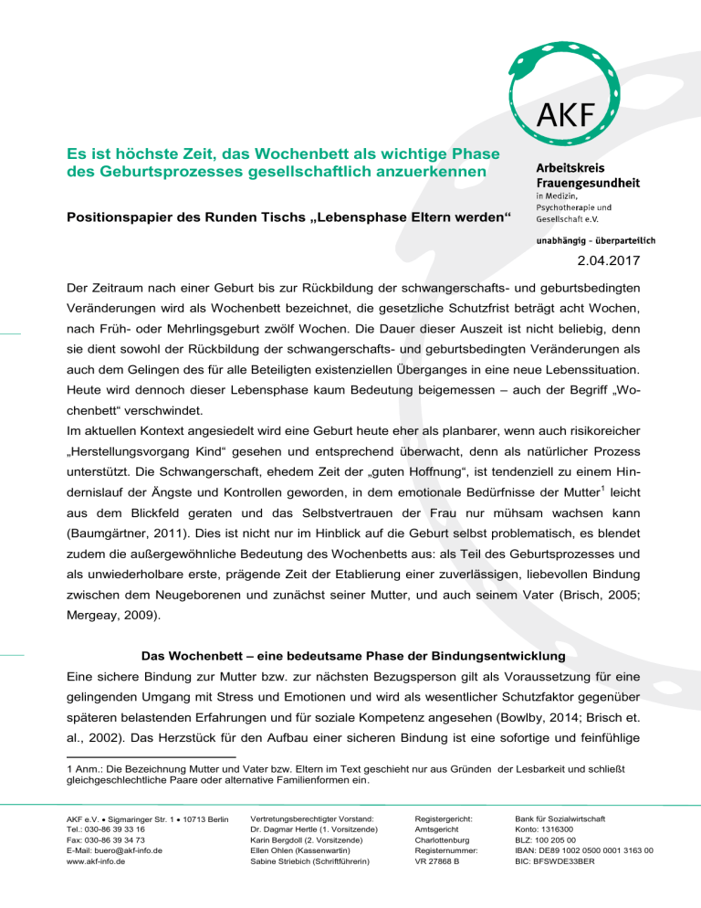 Es ist höchste Zeit, das Wochenbett als wichtige Phase des Geburtsprozesses gesellschaftlich anzuerkennen Positionspapier des Runden Tischs „Lebensphase Eltern werden“ 2.04.2017 Der Zeitraum nach einer Geburt bis zur Rückbildung der schwangerschafts- und geburtsbedingten Veränderungen wird als Wochenbett bezeichnet, die gesetzliche Schutzfrist beträgt acht Wochen, nach Früh- oder Mehrlingsgeburt zwölf Wochen. Die Dauer dieser Auszeit ist nicht beliebig, denn sie dient sowohl der Rückbildung der schwangerschafts- und geburtsbedingten Veränderungen als auch dem Gelingen des für alle Beteiligten existenziellen Überganges in eine neue Lebenssituation. Heute wird dennoch dieser Lebensphase kaum Bedeutung beigemessen – auch der Begriff „Wochenbett“ verschwindet. Im aktuellen Kontext angesiedelt wird eine Geburt heute eher als planbarer, wenn auch risikoreicher „Herstellungsvorgang Kind“ gesehen und entsprechend überwacht, denn als natürlicher Prozess unterstützt. Die Schwangerschaft, ehedem Zeit der „guten Hoffnung“, ist tendenziell zu einem Hindernislauf der Ängste und Kontrollen geworden, in dem emotionale Bedürfnisse der Mutter1 leicht aus dem Blickfeld geraten und das Selbstvertrauen der Frau nur mühsam wachsen kann (Baumgärtner, 2011). Dies ist nicht nur im Hinblick auf die Geburt selbst problematisch, es blendet zudem die außergewöhnliche Bedeutung des Wochenbetts aus: als Teil des Geburtsprozesses und als unwiederholbare erste, prägende Zeit der Etablierung einer zuverlässigen, liebevollen Bindung zwischen dem Neugeborenen und zunächst seiner Mutter, und auch seinem Vater (Brisch, 2005; Mergeay, 2009). Das Wochenbett – eine bedeutsame Phase der Bindungsentwicklung Eine sichere Bindung zur Mutter bzw. zur nächsten Bezugsperson gilt als Voraussetzung für eine gelingenden Umgang mit Stress und Emotionen und wird als wesentlicher Schutzfaktor gegenüber späteren belastenden Erfahrungen und für soziale Kompetenz angesehen (Bowlby, 2014; Brisch et. al., 2002). Das Herzstück für den Aufbau einer sicheren Bindung ist eine sofortige und feinfühlige 1 Anm.: Die Bezeichnung Mutter und Vater bzw. Eltern im Text geschieht nur aus Gründen der Lesbarkeit und schließt gleichgeschlechtliche Paare oder alternative Familienformen ein. AKF e.V. Sigmaringer Str. 1 10713 Berlin Tel.: 030-86 39 33 16 Fax: 030-86 39 34 73 E-Mail: [email protected] www.akf-info.de Vertretungsberechtigter Vorstand: Dr. Dagmar Hertle (1. Vorsitzende) Karin Bergdoll (2. Vorsitzende) Ellen Ohlen (Kassenwartin) Sabine Striebich (Schriftführerin) Registergericht: Amtsgericht Charlottenburg Registernummer: VR 27868 B Bank für Sozialwirtschaft Konto: 1316300 BLZ: 100 205 00 IBAN: DE89 1002 0500 0001 3163 00 BIC: BFSWDE33BER Reaktion der Eltern auf die Signale des Neugeborenen – und zwar von Beginn an und zu jeder Tageszeit. Das Wochenbett stellt einen geschützten Raum nicht nur für die Erholung von der Geburt sondern gerade auch für die „emotionale Geburt“ der Frau als Mutter, das gegenseitige Kennenlernen und für das Hineinwachsen der Eltern in ihre neue Lebenssituation dar. Das Wochenbett – heute kaum wahrgenommen Heutzutage scheint der Geburtsprozess gemäß dem medizinisch-technischen Verständnis der Geburt mit der „Entbindung“ abgeschlossen zu sein. Die Lebensphase Wochenbett wird meist nur noch als Zeit nach der Geburt beschrieben, deren Dauer beliebig erscheint. Die Errungenschaft der individuellen Handlungsfreiheit führt paradoxerweise dazu, dass meist allein die Anforderungen der Arbeitswelt die Gestaltung der Wochenbettzeit bestimmen. Diese ist heute allein der Frau und ihrem Partner überlassen: eine Aufgabe, die sich oft als mühsam und konfliktreich erweist. Der gesellschaftlichen Erwartung entsprechend ist die elterliche Zielsetzung eher auf die (Wieder-)Herstellung eines „normalen“ Alltags, nun „plus Kind“, denn auf die Erholung und das Einlassen auf die elementaren Bindungsbedürfnisse des Neugeborenen ausgerichtet. Die Wöchnerin, aber auch der Vater, stehen oft alleine da. Sie erfahren kaum Unterstützung bei dem Aufbau ihrer jeweiligen neuen familiären Identität und bleiben ohne Entlastung von den Aufgaben des weiterlaufenden und fordernden Alltags. Das verschärft sich in besonderer Weise durch die Rückkehr des Partners in den Berufsalltag, zumal diese meist lange vor dem Ende der Wochenbettzeit geschieht. Unter diesen Bedingungen können Wöchnerinnen leicht in eine Überforderung geraten. Dies wird jedoch selten von ihnen thematisiert und wenn, dann eher als Ergebnis einer eigenen Unzulänglichkeit gedeutet. Gesundheitliche Folgen einer frühen Überforderung Mütter beschreiben häufig, dass beim Aufbau der Stillbeziehung die Gefühle Achterbahn fahren und es Wochen dauert, bis sich Routine einstellt (Hinsliff-Smith et al., 2014). Stress und Überforderung können zum frühen Abstillen des Neugeborenen führen (Froehlich et al., 2015). Die meisten Wöchnerinnen in Deutschland beginnen zwar zu stillen, doch die von der Nationalen Stillkommission angeratene Stilldauer von 4 bis 6 Monaten ausschließlichen Stillens (BfR, 2015) wird heute nur selten erreicht (Rubin, 2013). So kommen die bekannten, vielfältigen gesundheitlichen Vorteile des VollStillens nur wenigen Müttern und Kindern zugute. Außerdem können Ruhelosigkeit, Sorgen, Unsicherheit in der Beziehung zum Kind, Schlaflosigkeit oder familiäre Konflikte auftreten, die sich zu nachhaltigen Gesundheitsschäden bei Mutter und Kind entwickeln können. Angstzustände, tiefgreifende Erschöpfung, mangelnde Empathie für die Bedürfnisse des Kindes, Vernachlässigung der 2 Selbstsorge bis hin zur Depression oder Gefährdung der Bindungsbeziehung können die Folge sein (Beetz et. al., 2013; Fahey & Shenassa, 2013; McMahon et. al., 2005). Die Bedeutung des Wochenbetts: nun auch im Fokus von Politik und Gesundheitswesen Als Teilziel von „Gesundheit rund um die Geburt“ wurden jüngs