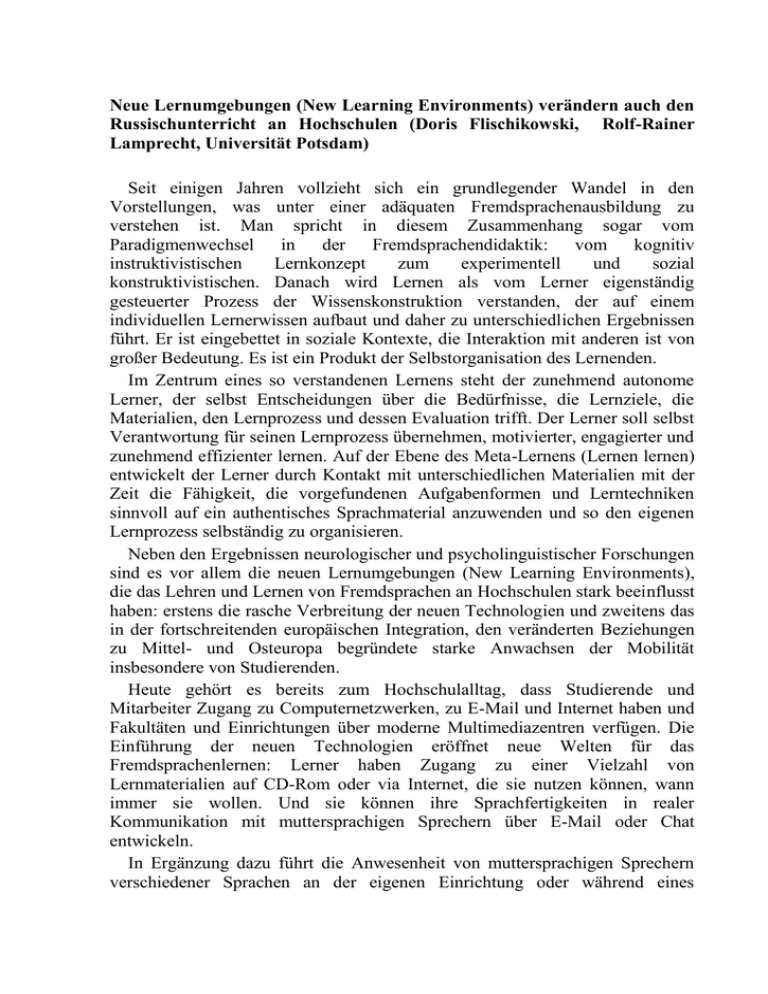 Neue Lernumgebungen (New Learning Environments) verändern auch den Russischunterricht an Hochschulen (Doris Flischikowski, Rolf-Rainer Lamprecht, Universität Potsdam) Seit einigen Jahren vollzieht sich ein grundlegender Wandel in den Vorstellungen, was unter einer adäquaten Fremdsprachenausbildung zu verstehen ist. Man spricht in diesem Zusammenhang sogar vom Paradigmenwechsel in der Fremdsprachendidaktik: vom kognitiv instruktivistischen Lernkonzept zum experimentell und sozial konstruktivistischen. Danach wird Lernen als vom Lerner eigenständig gesteuerter Prozess der Wissenskonstruktion verstanden, der auf einem individuellen Lernerwissen aufbaut und daher zu unterschiedlichen Ergebnissen führt. Er ist eingebettet in soziale Kontexte, die Interaktion mit anderen ist von großer Bedeutung. Es ist ein Produkt der Selbstorganisation des Lernenden. Im Zentrum eines so verstandenen Lernens steht der zunehmend autonome Lerner, der selbst Entscheidungen über die Bedürfnisse, die Lernziele, die Materialien, den Lernprozess und dessen Evaluation trifft. Der Lerner soll selbst Verantwortung für seinen Lernprozess übernehmen, motivierter, engagierter und zunehmend effizienter lernen. Auf der Ebene des Meta-Lernens (Lernen lernen) entwickelt der Lerner durch Kontakt mit unterschiedlichen Materialien mit der Zeit die Fähigkeit, die vorgefundenen Aufgabenformen und Lerntechniken sinnvoll auf ein authentisches Sprachmaterial anzuwenden und so den eigenen Lernprozess selbständig zu organisieren. Neben den Ergebnissen neurologischer und psycholinguistischer Forschungen sind es vor allem die neuen Lernumgebungen (New Learning Environments), die das Lehren und Lernen von Fremdsprachen an Hochschulen stark beeinflusst haben: erstens die rasche Verbreitung der neuen Technologien und zweitens das in der fortschreitenden europäischen Integration, den veränderten Beziehungen zu Mittel- und Osteuropa begründete starke Anwachsen der Mobilität insbesondere von Studierenden. Heute gehört es bereits zum Hochschulalltag, dass Studierende und Mitarbeiter Zugang zu Computernetzwerken, zu E-Mail und Internet haben und Fakultäten und Einrichtungen über moderne Multimediazentren verfügen. Die Einführung der neuen Technologien eröffnet neue Welten für das Fremdsprachenlernen: Lerner haben Zugang zu einer Vielzahl von Lernmaterialien auf CD-Rom oder via Internet, die sie nutzen können, wann immer sie wollen. Und sie können ihre Sprachfertigkeiten in realer Kommunikation mit muttersprachigen Sprechern über E-Mail oder Chat entwickeln. In Ergänzung dazu führt die Anwesenheit von muttersprachigen Sprechern verschiedener Sprachen an der eigenen Einrichtung oder während eines Studienaufenthaltes im Ausland zu neuen Möglichkeiten des Fremdsprachenlernens: Lerner sind in die Lage versetzt, direkt mit einem Sprecher der Zielsprache zu kommunizieren und dabei sofort ein Feedback zu erhalten. Ein solches Lernen in natürlicher Umgebung, d. h. außerhalb des Unterrichts, ist sicher kein völlig neues Phänomen, aber seine Rolle und Bedeutung hat sich im Ergebnis der bereits angesprochenen Internationalisierungsprozesse wesentlich verändert. Ein modernes universitäres Fremdsprachenangebot muss diesen neuen Möglichkeiten des Fremdsprachenlernens Rechnung tragen durch ein lernerzentriertes Herangehen bei der Fremdsprachenausbildung im Kurs, ergänzende Möglichkeiten selbst-gesteuerten Lernens außerhalb der Kurse, die Integration kooperativer Formen des Sprachenlernens mit native speakern verschiedener Sprachen und die Nutzung der modernen Informationsund Kommunikationstechnologien zur Förderung von Selbständigkeit, Individualität und Flexibilität beim Fremdsprachenlernen. Im Folgenden sollen zwei Kursprojekte vorgestellt werden, in denen versucht wurde, diesem Anspruch gerecht zu werden. Online-Kurs: Praktische Russische Phonetik – Grundlagen, Aufgaben, Übungen (Rolf-Rainer Lamprecht, Doris Flischikowski, Anneliese Dalchow) 1. Ziele Es handelt sich hierbei um ein Teilprojekt eines von der Universität Potsdam im Jahre 2000 geförderten Gesamtprojektes „Virtuelles Lernen über OnlineSysteme“, an dem neben der Slavistik und dem Sprachenzentrum auch die Bereiche Grundschulpädagogik, Wirtschaftswissenschaften, Informatik und das Rechenzentrum teilnahmen. Gesamtziel war die Bereitstellung eines den Bedürfnissen von Fakultäten entsprechenden, durch fachspezifische Kurse mit unterschiedlichen Szenarien approbierten webgestützten Online-Lern- und Lehrsystems an der Universität Potsdam. Mit diesem Ziel wurden unterschiedliche, auf dem Markt verfügbare Lernmanagementsysteme, u. a. WebCT, FirstClass, ets DLS, VIRTUS und Lotus Learning Space (LLS), hinsichtlich ihrer Kompabilität mit den Erfordernissen der Fächer überprüft. Unter Nutzung von Lotus Learning Space wurde in der Zusammenarbeit des Lehrstuhls Ostslavische Sprachwissenschaft, des Lektorats Russisch am Institut für Slavistik und des Sprachenzentrums ein Phonetikkurs entwickelt, dessen modularer Aufbau den Einsatz in sowohl theoriegeleiteten als auch praktischen Lehrveranstaltungen erlaubt. Dabei wird phonetisch-phonologisches Wissen von den Studierenden nicht als hierarchisches System, sondern als Beschreibungsund Erklärungsmittel für die Behebung typischer Aussprachedefizite ausländischer Russischlerner angeeignet. Theoriewissen und darauf bezogene Erkennungs-, Trainings- und Überprüfungsaufgaben verfolgen somit ein gemeinsames Ziel: Befähigung der Studierenden, vom Deutschen differente phonetische und intonatorische Erscheinungen des Russischen akustisch zu erkennen, normgerechte Artikulation und Intonation zu beschreiben und zielgerichtet zu üben. Gleichzeitig soll der Kurs zur Entwicklung einer (rezeptiven) linguistischen fachsprachlichen Kompetenz beitragen. 2. Vorteile des Online-Kurses gegenüber dem herkömmlichen Kontaktunterricht Als wichtigstes Moment ist die Individualisierung der Lernwege und des Lernaufwandes u