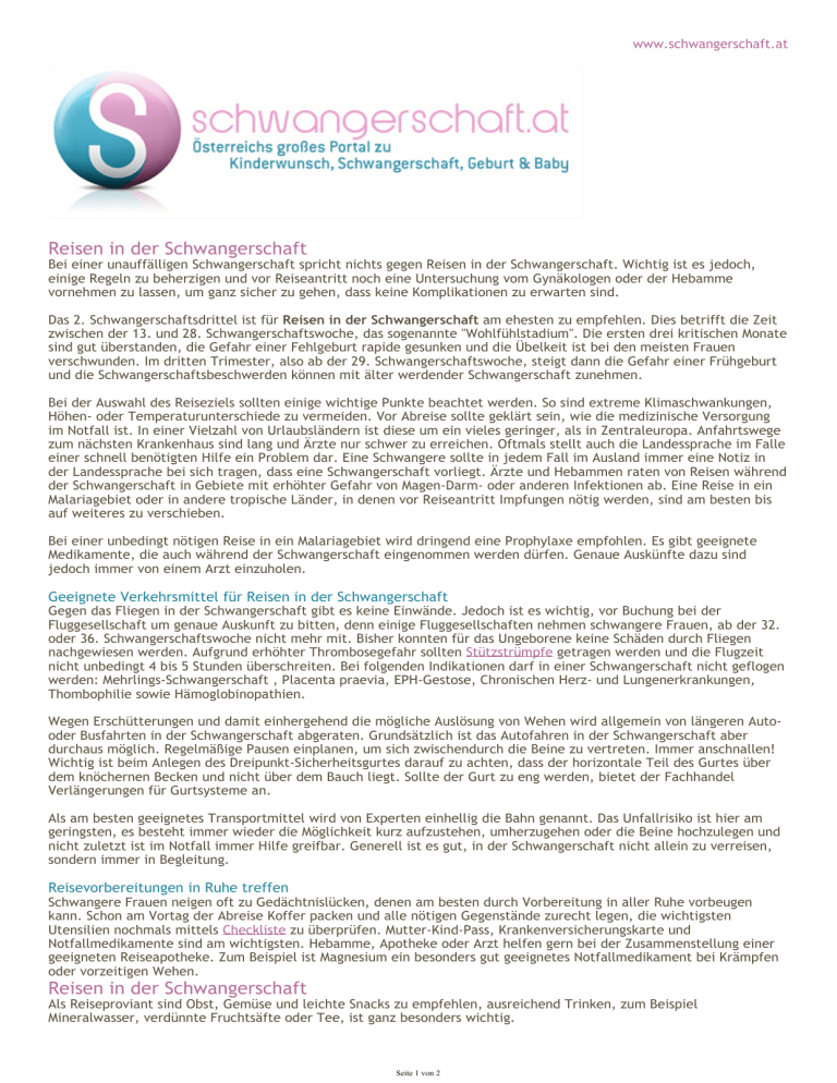 www.schwangerschaft.at Reisen in der Schwangerschaft Bei einer unauffälligen Schwangerschaft spricht nichts gegen Reisen in der Schwangerschaft. Wichtig ist es jedoch, einige Regeln zu beherzigen und vor Reiseantritt noch eine Untersuchung vom Gynäkologen oder der Hebamme vornehmen zu lassen, um ganz sicher zu gehen, dass keine Komplikationen zu erwarten sind. Das 2. Schwangerschaftsdrittel ist für Reisen in der Schwangerschaft am ehesten zu empfehlen. Dies betrifft die Zeit zwischen der 13. und 28. Schwangerschaftswoche, das sogenannte "Wohlfühlstadium". Die ersten drei kritischen Monate sind gut überstanden, die Gefahr einer Fehlgeburt rapide gesunken und die Übelkeit ist bei den meisten Frauen verschwunden. Im dritten Trimester, also ab der 29. Schwangerschaftswoche, steigt dann die Gefahr einer Frühgeburt und die Schwangerschaftsbeschwerden können mit älter werdender Schwangerschaft zunehmen. Bei der Auswahl des Reiseziels sollten einige wichtige Punkte beachtet werden. So sind extreme Klimaschwankungen, Höhen- oder Temperaturunterschiede zu vermeiden. Vor Abreise sollte geklärt sein, wie die medizinische Versorgung im Notfall ist. In einer Vielzahl von Urlaubsländern ist diese um ein vieles geringer, als in Zentraleuropa. Anfahrtswege zum nächsten Krankenhaus sind lang und Ärzte nur schwer zu erreichen. Oftmals stellt auch die Landessprache im Falle einer schnell benötigten Hilfe ein Problem dar. Eine Schwangere sollte in jedem Fall im Ausland immer eine Notiz in der Landessprache bei sich tragen, dass eine Schwangerschaft vorliegt. Ärzte und Hebammen raten von Reisen während der Schwangerschaft in Gebiete mit erhöhter Gefahr von Magen-Darm- oder anderen Infektionen ab. Eine Reise in ein Malariagebiet oder in andere tropische Länder, in denen vor Reiseantritt Impfungen nötig werden, sind am besten bis auf weiteres zu verschieben. Bei einer unbedingt nötigen Reise in ein Malariagebiet wird dringend eine Prophylaxe empfohlen. Es gibt geeignete Medikamente, die auch während der Schwangerschaft eingenommen werden dürfen. Genaue Auskünfte dazu sind jedoch immer von einem Arzt einzuholen. Geeignete Verkehrsmittel für Reisen in der Schwangerschaft Gegen das Fliegen in der Schwangerschaft gibt es keine Einwände. Jedoch ist es wichtig, vor Buchung bei der Fluggesellschaft um genaue Auskunft zu bitten, denn einige Fluggesellschaften nehmen schwangere Frauen, ab der 32. oder 36. Schwangerschaftswoche nicht mehr mit. Bisher konnten für das Ungeborene keine Schäden durch Fliegen nachgewiesen werden. Aufgrund erhöhter Thrombosegefahr sollten Stützstrümpfe getragen werden und die Flugzeit nicht unbedingt 4 bis 5 Stunden überschreiten. Bei folgenden Indikationen darf in einer Schwangerschaft nicht geflogen werden: Mehrlings-Schwangerschaft , Placenta praevia, EPH-Gestose, Chronischen Herz- und Lungenerkrankungen, Thombophilie sowie Hämoglobinopathien. Wegen Erschütterungen und damit einhergehend die mögliche Auslösung von Wehen wird allgemein von längeren Autooder Busfahrten in der Schwangerschaft abgeraten. Grundsätzlich ist das Autofahren in der Schwangerschaft aber durchaus möglich. Regelmäßige Pausen einplanen, um sich zwischendurch die Beine zu vertreten. Immer anschnallen! Wichtig ist beim Anlegen des Dreipunkt-Sicherheitsgurtes darauf zu achten, dass der horizontale Teil des Gurtes über dem knöchernen Becken und nicht über dem Bauch liegt. Sollte der Gurt zu eng werden, bietet der Fachhandel Verlängerungen für Gurtsysteme an. Als am besten geeignetes Transportmittel wird von Experten einhellig die Bahn genannt. Das Unfallrisiko ist hier am geringsten, es besteht immer wieder die Möglichkeit kurz aufzustehen, umherzugehen oder die Beine hochzulegen und nicht zuletzt ist im Notfall immer Hilfe greifbar. Generell ist es gut, in der Schwangerschaft nicht allein zu verreisen, sondern immer in Begleitung. Reisevorbereitungen in Ruhe treffen Schwangere Frauen neigen oft zu Gedächtnislücken, denen am besten durch Vorbereitung in aller Ruhe vorbeugen kann. Schon am Vortag der Abreise Koffer packen und alle nötigen Gegenstände zurecht legen, die wichtigsten Utensilien nochmals mittels Checkliste zu überprüfen. Mutter-Kind-Pass, Krankenversicherungskarte und Notfallmedikamente sind am wichtigsten. Hebamme, Apotheke oder Arzt helfen gern bei der Zusammenstellung einer geeigneten Reiseapotheke. Zum Beispiel ist Magnesium ein besonders gut geeignetes Notfallmedikament bei Krämpfen oder vorzeitigen Wehen. Reisen in der Schwangerschaft Als Reiseproviant sind Obst, Gemüse und leichte Snacks zu empfehlen, ausreichend Trinken, zum Beispiel Mineralwasser, verdünnte Fruchtsäfte oder Tee, ist ganz besonders wichtig. Seite 1 von 2 Anstrengungen vermeiden Auch während der Reise gilt: sportliche Betätigung mit gleichmäßiger geringer Belastung, z.B. Schwimmen, Wandern, Radfahren, Skilanglauf oder Jogging. All dies kann bei einem unauffälligen Schwangerschaftsverlauf ausgeübt werden, besonders, wenn diese Sportarten bereits vor der Schwangerschaft betrieben wurden. Von Leistungssport und Sportarten mit abrupten Bewegungen oder erhöhter Sturzgefahr sowie der Gefahr der Verletzung des Bauches wird unbedingt abgeraten. Dazu zählen z.B. Tennis, Squash, andere Ballspiele, alpiner Skilauf, Reiten sowie auch Tauchen, Rafting usw. Schwimmen und eine gezielte Gymnastik sind zur Vorbeugung, bzw. Linderung von Rückenschmerzen sowie zur Vorbereitung auf die Geburt sinnvoll. Eine Angst vor Infektionen durch das Schwimmen ist unbegründet, wenn man freie Gewässer oder Whirlpools mit hoher Keimbesiedlung meidet. Frauen, die zu Scheidenentzündungen neigen, können prophylaktisch vor dem Schwimmen einen mit Vaseline bestrichenen Tampon in die Scheide einführen. In Apotheken erhältlich sind auch sogenannte Schwimmtampons. Eine wundervolle Art der Entspannung sind Yoga, Reiki, für Schwangere geeignete Massagen oder Bäder. Jedoch bei der Auswahl von Badezusätzen, Ma