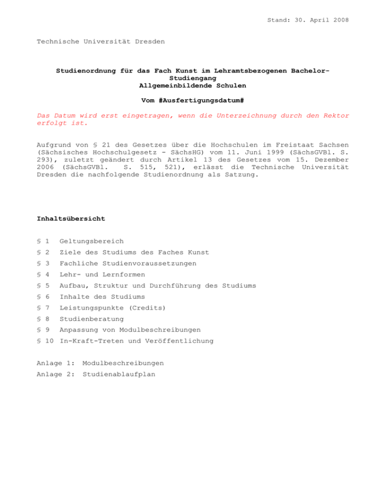 Stand: 30. April 2008 Technische Universität Dresden Studienordnung für das Fach Kunst im Lehramtsbezogenen BachelorStudiengang Allgemeinbildende Schulen Vom #Ausfertigungsdatum# Das Datum wird erst eingetragen, wenn die Unterzeichnung durch den Rektor erfolgt ist. Aufgrund von § 21 des Gesetzes über die Hochschulen im Freistaat Sachsen (Sächsisches Hochschulgesetz - SächsHG) vom 11. Juni 1999 (SächsGVBl. S. 293), zuletzt geändert durch Artikel 13 des Gesetzes vom 15. Dezember 2006 (SächsGVBl. S. 515, 521), erlässt die Technische Universität Dresden die nachfolgende Studienordnung als Satzung. Inhaltsübersicht § 1 Geltungsbereich § 2 Ziele des Studiums des Faches Kunst § 3 Fachliche Studienvoraussetzungen § 4 Lehr- und Lernformen § 5 Aufbau, Struktur und Durchführung des Studiums § 6 Inhalte des Studiums § 7 Leistungspunkte (Credits) § 8 Studienberatung § 9 Anpassung von Modulbeschreibungen § 10 In-Kraft-Treten und Veröffentlichung Anlage 1: Modulbeschreibungen Anlage 2: Studienablaufplan § 1 Geltungsbereich Diese Studienordnung regelt auf der Grundlage des Sächsischen Hochschulgesetzes und der Prüfungsordnung Ziel, Inhalt, Aufbau und Ablauf des Studiums des Faches Kunst im Lehramtsbezogenen Bachelor-Studiengang Allgemeinbildende Schulen an der Technischen Universität Dresden. Sie ergänzt die Studienordnung für den Lehramtsbezogenen Bachelor-Studiengang Lehramt Allgemeinbildende Schulen vom #Datum der Ausfertigung# in der jeweils geltenden Fassung. § 2 Ziele des Studiums des Faches Kunst Primäres und übergeordnetes Ziel des Studiums ist der Erwerb der Qualifikationen, die für die Fortsetzung der universitären Ausbildung in einem auf die Befähigung für ein Lehramt ausgerichteten konsekutiven Master-Studiengang zum Erwerb des Abschlusses Master of Education Voraussetzung sind. Die Studierenden sollen neben den fachlichen Zusammenhängen der Bildungswissenschaften die des Faches Kunst überblicken und über die Fähigkeit verfügen, künstlerische Techniken und Strategien sowie wissenschaftliche Methoden und Erkenntnisse anzuwenden. Das Studium stattet die Studierenden mit einer differenzierten Wissensgrundlage über die Phänomene des um die elektronischen Medien erweiterten Bild- und Kunstbegriffs aus. Die Studierenden entfalten eigene experimentelle Kunstpraxen. Sie sind mit Abschluss des Studiums zur begründeten Kommunikation über verschiedene Positionen historischer und gegenwärtiger Kunstund Medienpraxis sowie zur Konzeption kunstpädagogischer Vermittlungssituationen befähigt. Die Studierenden sollen über die für den Übergang in einen auf die Befähigung für ein Lehramt und den vorgeschriebenen Vorbereitungsdienst vorbereitenden Master-Studiengang notwendigen gründlichen fachlichen Kenntnisse, künstlerischen Fähigkeiten und berufsbefähigenden Schlüsselqualifikationen als Beschäftigungsbefähigung auch für eine Tätigkeit in anderen Berufsfeldern, vornehmlich einer solchen, die auf die Vermittlung und Aneignung von Wissen ausgerichtet sind, verfügen. § 3 Fachliche Studienvoraussetzungen Ergänzend zu den allgemeinen Zugangsvoraussetzungen ist Voraussetzung für die Aufnahme des Studiums des Faches Kunst im Lehramtsbezogenen BachelorStudiengang Allgemeinbildende Schulen der Nachweis von bildkünstlerischen und kunstreflektierenden Fähigkeiten. Der Nachweis erfolgt in einer Aufnahmeprüfung, deren Bestehen Bedingung für die Immatrikulation ist. Näheres regelt die Ordnung zur Feststellung der Eignung für das Studium des Faches Kunst. 2 § 4 Lehr- und Lernformen (1) Der Lehrstoff ist modular strukturiert. In den einzelnen Modulen werden die Lehrinhalte durch Vorlesungen, Seminare, Proseminare, Übungen, Tutorien, Praxis- und Projektseminare, Exkursionen und schulpraktische Übungen vermittelt, gefestigt und vertieft. (2) In Vorlesungen wird in die Stoffgebiete der Module eingeführt und der Forschungsstand in größeren Teilgebieten vorgeführt. Proseminare und Seminare ermöglichen den Studierenden auf unterschiedlichem Niveau, sich auf der Grundlage von vertiefter Auseinandersetzung mit Kunstwerken und Kunsttheorien, von Fachliteratur und anderen Materialien unter Anleitung selbst über einen ausgewählten Problembereich zu informieren, das Erarbeitete vorzutragen, in der Gruppe zu diskutieren und schriftlich darzustellen. Übungen ermöglichen die Aneignung künstlerischer, kunstrezeptiver und medialer Fähigkeiten, Techniken und Kenntnisse. In Tutorien werden vielfältige kunstrezeptive und kunstpraktische Methoden und Arbeitstechniken, Formen wissenschaftlichen Arbeitens und kunstpädagogisch-komplexen Denkens eingeübt. Praxisund Projektseminare ermöglichen den Studierenden in medienübergreifender Werkstattarbeit, in der sie eigene künstlerischkonzeptionelle Themenstellungen in Zusammenarbeit mit universitären und auswärtigen Institutionen umsetzen, den Erwerb und die unmittelbare Anwendung künstlerischer und kunstwissenschaftlicher Schlüsselkompetenzen und Fertigkeiten im Bereich der Präsentation und Vorstellung von eigenen künstlerischen Arbeiten. Exkursionen sichern die Begegnung mit kunstgeschichtlichen und zeitgenössischen Kunstwerken und Architektur im Original außerhalb der Universität. Schulpraktische Übungen sind durch Vor- und Nachbereitung universitär angeleitete unterrichtspraktische Tätigkeiten in semesterbegleitender Form. Sie finden in Kleingruppen statt. § 5 Aufbau, Struktur und Durchführung des Studiums (1) Das Studium des Faches Kunst ist modular aufgebaut. Das Lehrangebot ist auf sechs Semester verteilt. (2) Das Studium des Faches Kunst umfasst neun Pflichtmodule. (3) Wesentlicher Bestandteil des Studiums des Faches Kunst sind die Schulpraktischen Studien in Form der Schulpraktischen Übungen, die dem Modul KU-DID-AM9 zugeordnet sind. (4) Inhalte und Qualifikationsziele, umfasste Lehr- und Lernformen, Voraussetzungen, Verwendbarkeit, Häufigkeit, Arbeitsaufwand sowie Dauer der einzelnen Mod