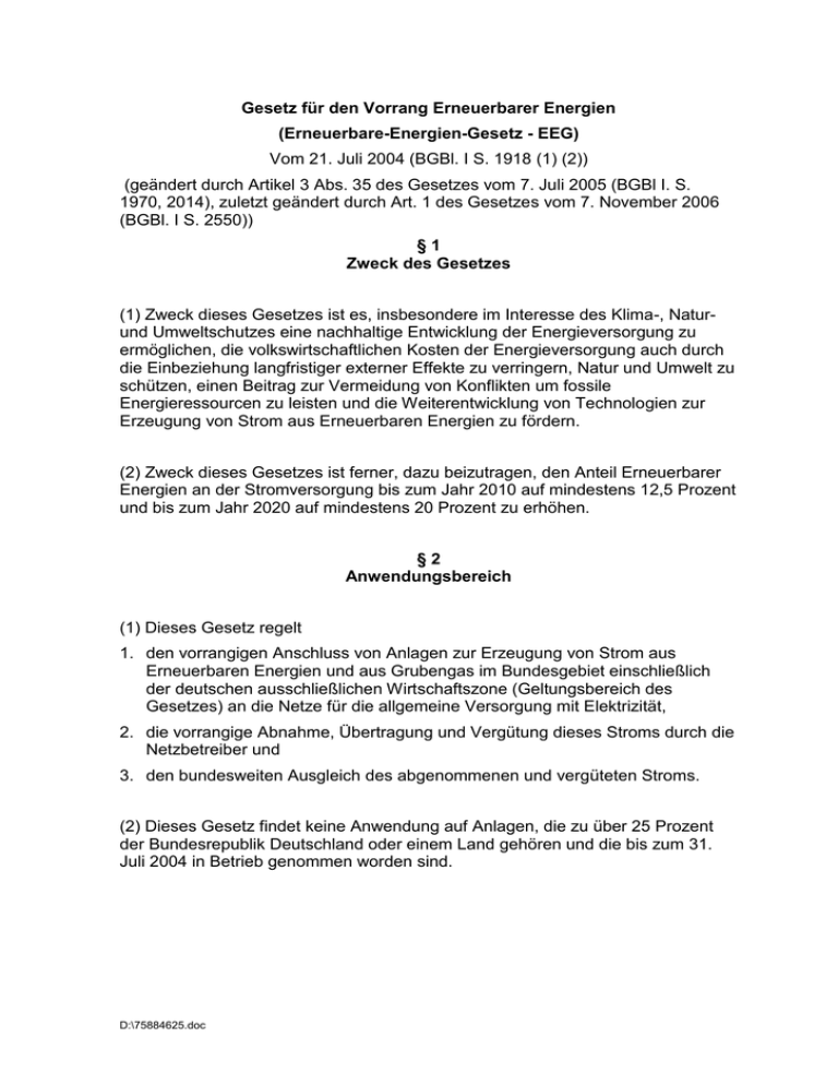 Gesetz für den Vorrang Erneuerbarer Energien (Erneuerbare-Energien-Gesetz - EEG) Vom 21. Juli 2004 (BGBl. I S. 1918 (1) (2)) (geändert durch Artikel 3 Abs. 35 des Gesetzes vom 7. Juli 2005 (BGBl I. S. 1970, 2014), zuletzt geändert durch Art. 1 des Gesetzes vom 7. November 2006 (BGBl. I S. 2550)) §1 Zweck des Gesetzes (1) Zweck dieses Gesetzes ist es, insbesondere im Interesse des Klima-, Naturund Umweltschutzes eine nachhaltige Entwicklung der Energieversorgung zu ermöglichen, die volkswirtschaftlichen Kosten der Energieversorgung auch durch die Einbeziehung langfristiger externer Effekte zu verringern, Natur und Umwelt zu schützen, einen Beitrag zur Vermeidung von Konflikten um fossile Energieressourcen zu leisten und die Weiterentwicklung von Technologien zur Erzeugung von Strom aus Erneuerbaren Energien zu fördern. (2) Zweck dieses Gesetzes ist ferner, dazu beizutragen, den Anteil Erneuerbarer Energien an der Stromversorgung bis zum Jahr 2010 auf mindestens 12,5 Prozent und bis zum Jahr 2020 auf mindestens 20 Prozent zu erhöhen. §2 Anwendungsbereich (1) Dieses Gesetz regelt 1. den vorrangigen Anschluss von Anlagen zur Erzeugung von Strom aus Erneuerbaren Energien und aus Grubengas im Bundesgebiet einschließlich der deutschen ausschließlichen Wirtschaftszone (Geltungsbereich des Gesetzes) an die Netze für die allgemeine Versorgung mit Elektrizität, 2. die vorrangige Abnahme, Übertragung und Vergütung dieses Stroms durch die Netzbetreiber und 3. den bundesweiten Ausgleich des abgenommenen und vergüteten Stroms. (2) Dieses Gesetz findet keine Anwendung auf Anlagen, die zu über 25 Prozent der Bundesrepublik Deutschland oder einem Land gehören und die bis zum 31. Juli 2004 in Betrieb genommen worden sind. D:\75884625.doc Seite 2 §3 Begriffsbestimmungen (1) Erneuerbare Energien sind Wasserkraft einschließlich der Wellen-, Gezeiten-, Salzgradienten- und Strömungsenergie, Windenergie, solare Strahlungsenergie, Geothermie, Energie aus Biomasse einschließlich Biogas, Deponiegas und Klärgas sowie aus dem biologisch abbaubaren Anteil von Abfällen aus Haushalten und Industrie. (2) Anlage ist jede selbständige technische Einrichtung zur Erzeugung von Strom aus Erneuerbaren Energien oder aus Grubengas. Mehrere Anlagen zur Erzeugung von Strom aus gleichartigen Erneuerbaren Energien oder aus Grubengas, die im Geltungsbereich des Gesetzes errichtet und mit gemeinsamen für den Betrieb technisch erforderlichen Einrichtungen oder baulichen Anlagen unmittelbar verbunden sind, gelten als eine Anlage, soweit sich nicht aus den §§ 6 bis 12 etwas anderes ergibt; nicht für den Betrieb technisch erforderlich sind insbesondere Wechselrichter, Wege, Netzanschlüsse, Mess-, Verwaltungs- und Überwachungseinrichtungen. (3) Anlagenbetreiber ist, wer unbeschadet des Eigentums die Anlage zum Zweck der Erzeugung von Strom aus Erneuerbaren Energien oder aus Grubengas nutzt. (4) Inbetriebnahme ist die erstmalige Inbetriebsetzung der Anlage nach Herstellung ihrer technischen Betriebsbereitschaft oder nach ihrer Erneuerung, sofern die Kosten der Erneuerung mindestens 50 Prozent der Kosten einer Neuherstellung der gesamten Anlage einschließlich sämtlicher technisch für den Betrieb erforderlicher Einrichtungen und baulicher Anlagen betragen. (5) Leistung einer Anlage ist die elektrische Wirkleistung, die die Anlage bei bestimmungsgemäßem Betrieb ungeachtet kurzfristiger geringfügiger Abweichungen ohne zeitliche Einschränkung technisch erbringen kann. Bei der Feststellung der für die Vergütungshöhe maßgebenden Leistung bleibt die nur zur Reserve genutzte Leistung unberücksichtigt. (6) Netz ist die Gesamtheit der miteinander verbundenen technischen Einrichtungen zur Übertragung und Verteilung von Elektrizität für die allgemeine Versorgung. (7) Netzbetreiber sind die Betreiber von Netzen aller Spannungsebenen für die allgemeine Versorgung mit Elektrizität. Übertragungsnetzbetreiber sind die regelverantwortlichen Netzbetreiber von Hoch- und Höchstspannungsnetzen, die der überregionalen Übertragung von Elektrizität zu nachgeordneten Netzen dienen. D:\75884625.doc Seite 3 §4 Abnahme- und Übertragungspflicht (1) Netzbetreiber sind verpflichtet, Anlagen zur Erzeugung von Strom aus Erneuerbaren Energien oder aus Grubengas unverzüglich vorrangig an ihr Netz anzuschließen und den gesamten aus diesen Anlagen angebotenen Strom aus Erneuerbaren Energien oder aus Grubengas vorrangig abzunehmen und zu übertragen. Die Verpflichtung zur Abnahme nach Satz 1 besteht nach Einrichtung des Anlagenregisters nach § 15 Abs. 3 nur, wenn der Anlagenbetreiber die Eintragung der Anlage in das Register beantragt hat. Unbeschadet des § 12 Abs. 1 können Anlagenbetreiber und Netzbetreiber vertraglich vereinbaren, vom Abnahmevorrang abzuweichen, wenn, dies der besseren Integration der Anlage in das Netz dient. Netzbetreiber können infolge der Vereinbarung nach Satz 3 entstehende Kosten im nachgewiesenen Umfang bei der Ermittlung des Netznutzungsentgelts in Ansatz bringen. (2) Die Verpflichtung nach Absatz 1 Satz 1 trifft den Netzbetreiber, zu dessen technisch für die Aufnahme geeignetem Netz die kürzeste Entfernung zum Standort der Anlage besteht, wenn nicht ein anderes Netz einen technisch und wirtschaftlich günstigeren Verknüpfungspunkt aufweist. Ein Netz gilt auch dann als technisch geeignet, wenn die Abnahme des Stroms unbeschadet des Vorrangs nach Absatz 1 Satz 1 erst durch einen wirtschaftlich zumutbaren Ausbau des Netzes möglich wird; in diesem Fall ist der Netzbetreiber auf Verlangen des Einspeisewilligen zum unverzüglichen Ausbau verpflichtet. Wenn die Anlage einer Genehmigung nach anderen Rechtsvorschriften bedarf, besteht die Verpflichtung zum Ausbau nach Satz 2 nur, wenn der Anlagenbetreiber eine Genehmigung, eine Teilgenehmigung oder einen Vorbescheid vorlegt. Die Pflicht zum Ausbau erstreckt sich auf sämtliche für den Betrieb des Netzes notwendigen technischen Einrichtungen sowie