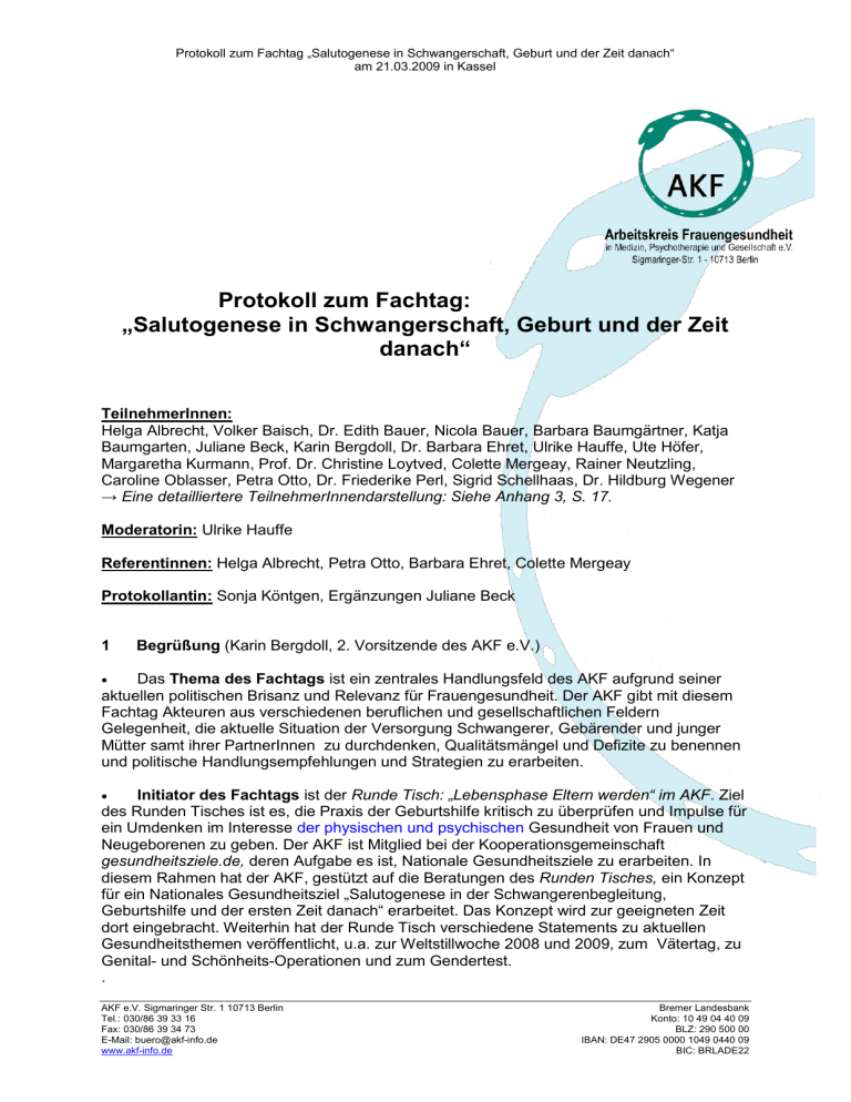 Protokoll zum Fachtag „Salutogenese in Schwangerschaft, Geburt und der Zeit danach“ am 21.03.2009 in Kassel Protokoll zum Fachtag: „Salutogenese in Schwangerschaft, Geburt und der Zeit danach“ TeilnehmerInnen: Helga Albrecht, Volker Baisch, Dr. Edith Bauer, Nicola Bauer, Barbara Baumgärtner, Katja Baumgarten, Juliane Beck, Karin Bergdoll, Dr. Barbara Ehret, Ulrike Hauffe, Ute Höfer, Margaretha Kurmann, Prof. Dr. Christine Loytved, Colette Mergeay, Rainer Neutzling, Caroline Oblasser, Petra Otto, Dr. Friederike Perl, Sigrid Schellhaas, Dr. Hildburg Wegener → Eine detailliertere TeilnehmerInnendarstellung: Siehe Anhang 3, S. 17. Moderatorin: Ulrike Hauffe Referentinnen: Helga Albrecht, Petra Otto, Barbara Ehret, Colette Mergeay Protokollantin: Sonja Köntgen, Ergänzungen Juliane Beck 1 Begrüßung (Karin Bergdoll, 2. Vorsitzende des AKF e.V.) Das Thema des Fachtags ist ein zentrales Handlungsfeld des AKF aufgrund seiner aktuellen politischen Brisanz und Relevanz für Frauengesundheit. Der AKF gibt mit diesem Fachtag Akteuren aus verschiedenen beruflichen und gesellschaftlichen Feldern Gelegenheit, die aktuelle Situation der Versorgung Schwangerer, Gebärender und junger Mütter samt ihrer PartnerInnen zu durchdenken, Qualitätsmängel und Defizite zu benennen und politische Handlungsempfehlungen und Strategien zu erarbeiten. Initiator des Fachtags ist der Runde Tisch: „Lebensphase Eltern werden“ im AKF. Ziel des Runden Tisches ist es, die Praxis der Geburtshilfe kritisch zu überprüfen und Impulse für ein Umdenken im Interesse der physischen und psychischen Gesundheit von Frauen und Neugeborenen zu geben. Der AKF ist Mitglied bei der Kooperationsgemeinschaft gesundheitsziele.de, deren Aufgabe es ist, Nationale Gesundheitsziele zu erarbeiten. In diesem Rahmen hat der AKF, gestützt auf die Beratungen des Runden Tisches, ein Konzept für ein Nationales Gesundheitsziel „Salutogenese in der Schwangerenbegleitung, Geburtshilfe und der ersten Zeit danach“ erarbeitet. Das Konzept wird zur geeigneten Zeit dort eingebracht. Weiterhin hat der Runde Tisch verschiedene Statements zu aktuellen Gesundheitsthemen veröffentlicht, u.a. zur Weltstillwoche 2008 und 2009, zum Vätertag, zu Genital- und Schönheits-Operationen und zum Gendertest. . AKF e.V. Sigmaringer Str. 1 10713 Berlin Tel.: 030/86 39 33 16 Fax: 030/86 39 34 73 E-Mail: [email protected] www.akf-info.de Bremer Landesbank Konto: 10 49 04 40 09 BLZ: 290 500 00 IBAN: DE47 2905 0000 1049 0440 09 BIC: BRLADE22 Protokoll zum Fachtag „Salutogenese in Schwangerschaft, Geburt und der Zeit danach“ am 21.03.2009 in Kassel Nachhaltigkeit: Einen Monat nach diesem Fachtag sind zwei Folgetreffen in kleinem ExpertInnenkreis zur Auswertung der Diskussionsergebnisse geplant. Über die Ergebnisse wird eine Dokumentation erstellt. Zusätzlich erscheint im Oktober 2009 ein AKF-INFOSonderheft zur Thematik„ „Humanisierung von Schwangerschaft, Geburt und der Zeit danach“. 2 Vorstellungsrunde Die anwesenden FachtagsteilnehmerInnen kommen aus allen Bereichen der Gesundheitsversorgung und -prävention: Hebammen und Ärztinnen, Psychologinnen, VertreterInnen der Eltern-Selbsthilfe einschließlich eines Vertreters des VäterExpertennetzes sowie Repräsentantinnen aus der Forschung, Verwaltung und Politik: Die Präsidentin des deutschen Hebammenbandes Expertinnen für „Väterfragen“, Mutter-Kind-Gruppen, alternative Schwangerenvorsorge, Pränataldiagnostik und Stillen (Buch-)Autoren und -autorinnen zu relevanten Themen wie: Geburtshilfe, Kaiserschnitt, Vaterschaft, Familienplanung Gynäkologinnen VertreterInnen der BZgA Vertreterinnen des Runden Tisches und Vorstands des AKF Vertreterinnen des informellen Kreises „Anderer Mutterpass“ Forum Frauengesundheit (ZGF Bremen) Das Netzwerk gegen Pränataldiagnostik Psychologinnen und Juristinnen Der Fachtag wird eröffnet mit 4 Impulsreferaten: 3 Impuls-Referat: „Arbeit und Ziele des Runden Tisches“ Petra Otto, Dipl. Pädagogin, Mitglied des Runden Tischs stellt den Runden Tisch vor und gibt einen Rückblick auf die Zeit der 70iger-Jahre, in der erstmals eine gemeinsame Bewegung von ÄrztInnen und Eltern grundlegende Änderungen im Gesundheitswesen und in der Geburtshilfe erreichten. → Das Skript des Vortrags: siehe Anhang 1. 4 Impuls-Referat: „Problemlage und Perspektive der Geburtshilfe“ Dr. Barbara Ehret, Gynäkologin Traditionell ging es Jahrhunderte lang um Leben und Gesundheit der werdenden Mutter. Mutter und Kind wurden als autonome Einheit betrachtet. Heute steht das perfekte Kind im Mittelpunkt. Mit der Einführung des Mutterpasses wurde eine ritualisierte Form der fetalen Überwachung, genannt Schwangeren-Vorsorge, eingesetzt. Die Begriffe Vorsorge, Früherkennung und Diagnostik verwischten sich. Es fand quasi eine Mutter-Kind-Dissoziation statt, die die natürliche Einheit von Mutter und Kind verletzte und zur Entmündigung der Frau führte in einem Geschehen, welches nun nicht mehr Geburtshilfe, sondern Geburtsmedizin hieß. → Das Skript des Vortrag: siehe Anhang 2. 5 Impuls-Vortrag: „Was braucht eigentlich die Frau?“ Helga Albrecht AKF e.V. Sigmaringer Str. 1 10713 Berlin Tel.: 030/86 39 33 16 Fax: 030/86 39 34 73 E-Mail: [email protected] www.akf-info.de Bremer Landesbank Konto: 10 49 04 40 09 BLZ: 290 500 00 IBAN: DE47 2905 0000 1049 0440 09 BIC: BRLADE22 2 / 22 Protokoll zum Fachtag „Salutogenese in Schwangerschaft, Geburt und der Zeit danach“ am 21.03.2009 in Kassel Die Präsidentin des Deutschen Hebammenverbandes skizziert die Verunsicherung und die Erwartungen der heutigen Generation werdender und junger Mütter, für die Gebären aus eigener Kraft kaum mehr vorstellbar ist. Sie sehen im Gegensatz zu den in den 70iger Jahren aktiv gewordenen Frauen kaum mehr einen eigenen Anteil an der Geburt. Der überwiegende Teil legt die Verantwortung für die Geburt in die Hände der MedizinerInnen. Normale Geburten werden entgegen zunehmender wissenschaftliche