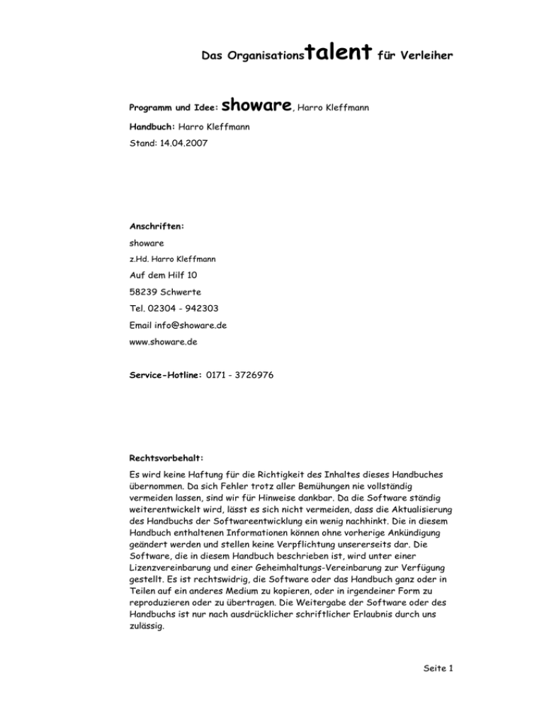 Das Organisations Programm und Idee: talent für Verleiher showare, Harro Kleffmann Handbuch: Harro Kleffmann Stand: 14.04.2007 Anschriften: showare z.Hd. Harro Kleffmann Auf dem Hilf 10 58239 Schwerte Tel. 02304 - 942303 Email [email protected] www.showare.de Service-Hotline: 0171 - 3726976 Rechtsvorbehalt: Es wird keine Haftung für die Richtigkeit des Inhaltes dieses Handbuches übernommen. Da sich Fehler trotz aller Bemühungen nie vollständig vermeiden lassen, sind wir für Hinweise dankbar. Da die Software ständig weiterentwickelt wird, lässt es sich nicht vermeiden, dass die Aktualisierung des Handbuchs der Softwareentwicklung ein wenig nachhinkt. Die in diesem Handbuch enthaltenen Informationen können ohne vorherige Ankündigung geändert werden und stellen keine Verpflichtung unsererseits dar. Die Software, die in diesem Handbuch beschrieben ist, wird unter einer Lizenzvereinbarung und einer Geheimhaltungs-Vereinbarung zur Verfügung gestellt. Es ist rechtswidrig, die Software oder das Handbuch ganz oder in Teilen auf ein anderes Medium zu kopieren, oder in irgendeiner Form zu reproduzieren oder zu übertragen. Die Weitergabe der Software oder des Handbuchs ist nur nach ausdrücklicher schriftlicher Erlaubnis durch uns zulässig. Seite 1 Das Organisations talent für Verleiher Inhaltsverzeichnis: Kapitel ....................................................................... Seite Inhaltsverzeichnis .............................................................................................................2 Einführung ...........................................................................................................................3 Allgemeine Bedienungshinweise.......................................................................................3 Grundstrukturen ................................................................................................................3 Installation ..........................................................................................................................5 Registrierung ......................................................................................................................5 Der erste Programmstart ................................................................................................5 Die Schaltzentrale.............................................................................................................7 Das Fenster "Einstellungen" ............................................................................................8 Das Fenster "Adressenerfassung" ............................................................................... 17 Das Fenster "Veranstaltungsorte" .............................................................................. 24 Das Fenster "Bestandserfassung".............................................. ................................. 26 Das Fenster "Fahrzeuge" .............................................................................................. 37 Das Fenster "Angebote für zugemietetes Equipment" ........................................... 38 Das Fenster "Kalender" ................................................................................................. 40 Das Fenster "Auftragserfassung"............................................................................... 43 Hilfsfunktionen der Auftragserfassung .................................................................... 50 Das Fenster "Auftragskalkulation" ............................................................................. 50 Das Fenster "Ladeliste Bearbeiten" ........................................................................... 55 Das Fenster "Urlaubstermine" ..................................................................................... 58 Das Fenster "Preisliste erstellen"............................................................................... 58 Das Fenster "Preisliste bearbeiten" ........................................................................... 59 Das Fenster "Links Erstellen" ...................................................................................... 59 Das Fenster "Links Anzeigen" ...................................................................................... 60 Das Fenster "Bestand an zugemieteten Geräten" .................................................... 61 Das Fenster "Container Bearbeiten" .......................................................................... 62 Das Fenster "Materialausgabe" ................................................................................... 68 Das Fenster "Materialrücknahme" .............................................................................. 80 Das Fenster "Drucke entwerfen" ................................................................................ 84 Das Fenster „Materialwartung“ ................................................................................... 90 Seite 2 Das Organisations talent für Verleiher Einführung: Die Software "Das Organisationstalent für Verleiher" soll die logistischen Abläufe in Ihrem Verleihgeschäft vereinfachen und organisieren. Dazu gibt es Funktionen, die den Einsatz und die Abrechnung des Materials, des Personals und der Termine erfassen und weiterverarbeiten. Weiterhin können Sie die Warenein- und Ausgänge erfassen und kontrollieren. Dieses Handbuch geht davon aus, dass Sie mit dem Umgang eines Rechners unter „Microsoft-Windows“ vertraut sind. Im Zweifelsfall informieren Sie sich im Handbuch zu Ihrem Betriebssystem oder in der Fachliteratur, die im Handel reichlich zur Verfügung steht. Die Grundstruktur der Software: Grundsätzlich arbeitet die Software auf 2 getrennten Ebenen: 1. Die Disposition 2. Die Ausführung Mit der Disposition wird die Durchführung der Aufträge geplant. Hier gibt es umfangreiche Hilfestellungen und Kontrollstrukturen, für die Materialeinsatzplanung, Kalkulation, Angebotserstellung,