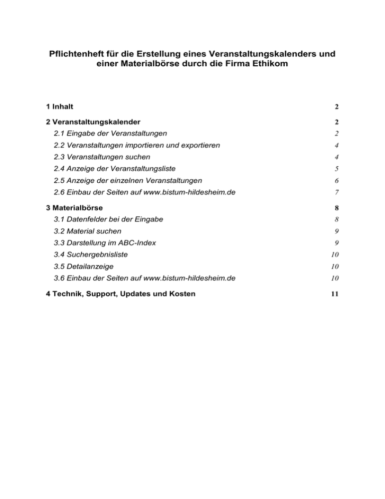 Pflichtenheft für die Erstellung eines Veranstaltungskalenders und einer Materialbörse durch die Firma Ethikom 1 Inhalt 2 2 Veranstaltungskalender 2 2.1 Eingabe der Veranstaltungen 2 2.2 Veranstaltungen importieren und exportieren 4 2.3 Veranstaltungen suchen 4 2.4 Anzeige der Veranstaltungsliste 5 2.5 Anzeige der einzelnen Veranstaltungen 6 2.6 Einbau der Seiten auf www.bistum-hildesheim.de 7 3 Materialbörse 8 3.1 Datenfelder bei der Eingabe 8 3.2 Material suchen 9 3.3 Darstellung im ABC-Index 9 3.4 Suchergebnisliste 10 3.5 Detailanzeige 10 3.6 Einbau der Seiten auf www.bistum-hildesheim.de 10 4 Technik, Support, Updates und Kosten 11 1 Inhalt Im Folgenden werden die Profile eines Veranstaltungskalenders sowie einer Materialbörse und die damit verbundenen Leistungen beschrieben, deren Erbringung durch die Firma Ethikom in Penzberg für den Auftraggeber, die Bernward Mediengesellschaft mbH in Hildesheim, zwischen den beiden Vertragspartnern vereinbart wurden. 2 Veranstaltungskalender 2.1 Eingabe der Veranstaltungen Der Veranstaltungskalender des Ethikom Sitemanagement soll folgende Datenfelder für die Eingabe enthalten (gefettete Schrift: Bezeichnung im Eingabetool, kursive Schrift: Erläuterungen): Titel Untertitel Autor (Name des Eingebenden trägt sich automatisch bei System-Anmeldung ein) Beginn (Datum/Uhrzeit) (wie in der Testversion, mit Kalender) Ende (Datum/Uhrzeit) (wie in der Testversion, mit Kalender) Anmeldeschluss Datum Bild Bildunterschrift Kurztext / Teaser: erscheint auch in der Kurzanzeige (max. 200 Zeichen) Ausschreibungstext (max. 2.000 Zeichen) Teilnehmer Veranstalter 1 o Text o Internet (Ziel: „Neues Fenster“ voreingestellt, _parent bei „Gleiches Fenster“) o E-Mail 2 Veranstalter 2 o Text o Internet (Ziel: „Neues Fenster“ voreingestellt, _parent bei „Gleiches Fenster“) o E-Mail Veranstaltungsort: Straße Veranstaltungsort: PLZ Veranstaltungsort: Stadt Leitung: Name Leitung: E-Mail Referent(-en): Name Referenten: E-Mail Anmeldung: Name Anmeldung: Straße Anmeldung: PLZ Anmeldung: Stadt Anmeldung: Telefon Anmeldung: FAX Anmeldung: E-Mail Weiterführende Links 1 o Text o URL (Ziel: „Neues Fenster“ voreingestellt, _parent bei „Gleiches Fenster“, keine E-Mail) Weiterführende Links 2 o Text o URL (Ziel: „Neues Fenster“ voreingestellt, _parent bei „Gleiches Fenster“, keine E-Mail) Veranstaltungsnummer Kosten (max. 200 Zeichen) Status (Auswahlliste mit „ausgebucht“ und „frei“) Import o Key: automatischer Eintrag o Name: automatischer Eintrag o Datum: automatischer Eintrag 3 Erstellt: o Name: automatischer Eintrag durch Login o Datum: automatischer Eintrag Aktualisiert: o Name: automatischer Eintrag durch Login o Datum: automatischer Eintrag Der Aufbau der Seite mit allen möglichen Einträgen ist in ansicht_einzelveranstaltung.doc (siehe 2.5) beschrieben. Felder ohne Einträge erscheinen nicht. Schlagworte können jederzeit neu angelegt und gelöscht werden. Lese- und Schreibrechte: Ethikom legt in dem Verwaltungstool mehrere „Träger“ an. Die Benutzer eines Trägers besitzen nur für ihren Bereich Lese- und Schreibrechte und können somit nur die von dieser Benutzergruppe eingegebenen Veranstaltungen sehen und bearbeiten. 2.2 Veranstaltungen importieren und exportieren Alle unter 2.1 aufgeführten Veranstaltungsdaten (ausgenommen Bild, Bildunterschrift, Status und Import) sollen in Form von csv-Dateien importiert werden können. Außerdem soll man alle eingegebene Veranstaltungsdaten als csv-Dateien aus der Veranstaltungsdatenbank exportieren können. 2.3 Veranstaltungen suchen Die Suche nach einzelnen Veranstaltungen soll möglich sein über folgende Suchvorgaben: Themenbereich Zielgruppe Veranstalter Veranstaltungsort: Postleitzahl und Ort Volltextsuche Suchzeitraum 4 Die Anordnung der Elemente auf der Suchanfrageseite soll folgendermaßen aussehen: suchseite.html Bei der Volltextsuche handelt es sich um eine UND-Suche. Wenn man auf „(mehrere möglich)“ klickt, öffnet sich direkt darüber ein Popup mit der Erläuterung: „Wenn man mit mehreren Begriffen sucht, werden nur Veranstaltungen gefunden, die alle Suchworte enthalten.“ Die Suchbegriffe können durch Leerzeichen oder Komma getrennt eingegeben werden. Ein eigener Suchzeitraum kann festgelegt werden. Dies kann wahlweise durch eine manuelle Eingabe oder durch die Kalenderblätter geschehen. Es kann auch bis zu einem Jahr in der Vergangenheit gesucht werden (Wie in der Testversion werden bei den festgelegten Suchzeiträumen abgelaufene Veranstaltungen nicht angezeigt.). Das Kalenderblatt für den Suchzeitraum soll folgendes Aussehen haben: kalenderblatt.html. Wird das Kalenderblatt angeklickt, ist automatisch der RadioButton vor „Eigener Zeitraum“ markiert. Mit den Pfeilen im Kalenderblatt kann man monatsweise vor- bzw. zurückblättern. Beim Anklicken des Monatsnamens wird der erste und letzte Tag des Monats in die entsprechenden Felder eingetragen, beim Anklicken des Jahres der erste und letzte Tag des Jahres. Beim Ankicken der einzelnen Tage wird jeweils das ausgewählte Datum in das gewünschte Feld eingetragen. Im Kalenderblatt verwandelt sich der Cursor bei Mouseover über den Links in das Hand-Symbol. Nach getroffener Auswahl schließt sich das Fenster automatisch. 2.4 Anzeige der Veranstaltungsliste Nach Starten der Suchanfrage öffnet sich im gleichen Browserfenster die Liste der gefundenen Veranstaltungen. Diese Seite soll folgende Aussehen haben: suchergebnisliste.doc Das Verwaltungstool bietet die Möglichkeit, die Veranstaltungsliste zu konfigurieren (Startdatum, Enddatum, Anzahl der Treffer pro Seite, Sortierung usw.). In der Kopfleiste werden maximal 10 weitere Seiten als Link angezeigt. Für die Druckversion („Seite drucken“) öffnet sich ein eigenes Fenster, in dem alle Treffer (nicht nur die der ersten Ergebnisseite) aufgeführt sind. Zu den Detailinformationen 5 über jede Veranstaltung (siehe 2.5) gelangt man über den Link im Titel, 