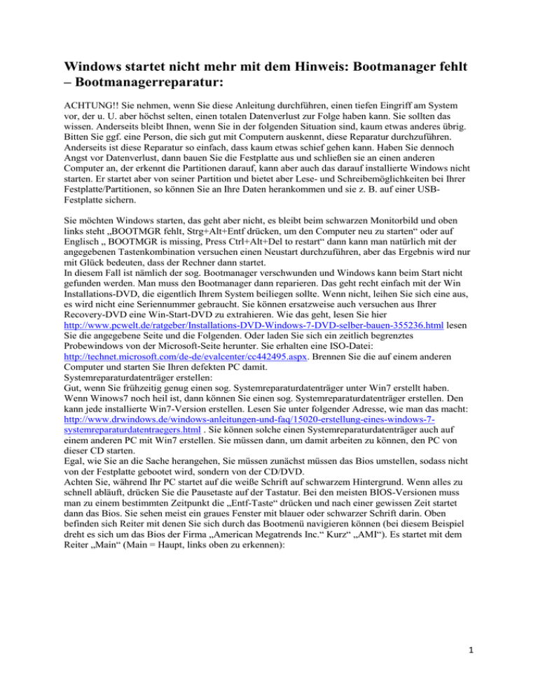 Windows startet nicht mehr mit dem Hinweis: Bootmanager fehlt – Bootmanagerreparatur: ACHTUNG!! Sie nehmen, wenn Sie diese Anleitung durchführen, einen tiefen Eingriff am System vor, der u. U. aber höchst selten, einen totalen Datenverlust zur Folge haben kann. Sie sollten das wissen. Anderseits bleibt Ihnen, wenn Sie in der folgenden Situation sind, kaum etwas anderes übrig. Bitten Sie ggf. eine Person, die sich gut mit Computern auskennt, diese Reparatur durchzuführen. Anderseits ist diese Reparatur so einfach, dass kaum etwas schief gehen kann. Haben Sie dennoch Angst vor Datenverlust, dann bauen Sie die Festplatte aus und schließen sie an einen anderen Computer an, der erkennt die Partitionen darauf, kann aber auch das darauf installierte Windows nicht starten. Er startet aber von seiner Partition und bietet aber Lese- und Schreibemöglichkeiten bei Ihrer Festplatte/Partitionen, so können Sie an Ihre Daten herankommen und sie z. B. auf einer USBFestplatte sichern. Sie möchten Windows starten, das geht aber nicht, es bleibt beim schwarzen Monitorbild und oben links steht „BOOTMGR fehlt, Strg+Alt+Entf drücken, um den Computer neu zu starten“ oder auf Englisch „ BOOTMGR is missing, Press Ctrl+Alt+Del to restart“ dann kann man natürlich mit der angegebenen Tastenkombination versuchen einen Neustart durchzuführen, aber das Ergebnis wird nur mit Glück bedeuten, dass der Rechner dann startet. In diesem Fall ist nämlich der sog. Bootmanager verschwunden und Windows kann beim Start nicht gefunden werden. Man muss den Bootmanager dann reparieren. Das geht recht einfach mit der Win Installations-DVD, die eigentlich Ihrem System beiliegen sollte. Wenn nicht, leihen Sie sich eine aus, es wird nicht eine Seriennummer gebraucht. Sie können ersatzweise auch versuchen aus Ihrer Recovery-DVD eine Win-Start-DVD zu extrahieren. Wie das geht, lesen Sie hier http://www.pcwelt.de/ratgeber/Installations-DVD-Windows-7-DVD-selber-bauen-355236.html lesen Sie die angegebene Seite und die Folgenden. Oder laden Sie sich ein zeitlich begrenztes Probewindows von der Microsoft-Seite herunter. Sie erhalten eine ISO-Datei: http://technet.microsoft.com/de-de/evalcenter/cc442495.aspx. Brennen Sie die auf einem anderen Computer und starten Sie Ihren defekten PC damit. Systemreparaturdatenträger erstellen: Gut, wenn Sie frühzeitig genug einen sog. Systemreparaturdatenträger unter Win7 erstellt haben. Wenn Winows7 noch heil ist, dann können Sie einen sog. Systemreparaturdatenträger erstellen. Den kann jede installierte Win7-Version erstellen. Lesen Sie unter folgender Adresse, wie man das macht: http://www.drwindows.de/windows-anleitungen-und-faq/15020-erstellung-eines-windows-7systemreparaturdatentraegers.html . Sie können solche einen Systemreparaturdatenträger auch auf einem anderen PC mit Win7 erstellen. Sie müssen dann, um damit arbeiten zu können, den PC von dieser CD starten. Egal, wie Sie an die Sache herangehen, Sie müssen zunächst müssen das Bios umstellen, sodass nicht von der Festplatte gebootet wird, sondern von der CD/DVD. Achten Sie, während Ihr PC startet auf die weiße Schrift auf schwarzem Hintergrund. Wenn alles zu schnell abläuft, drücken Sie die Pausetaste auf der Tastatur. Bei den meisten BIOS-Versionen muss man zu einem bestimmten Zeitpunkt die „Entf-Taste“ drücken und nach einer gewissen Zeit startet dann das Bios. Sie sehen meist ein graues Fenster mit blauer oder schwarzer Schrift darin. Oben befinden sich Reiter mit denen Sie sich durch das Bootmenü navigieren können (bei diesem Beispiel dreht es sich um das Bios der Firma „American Megatrends Inc.“ Kurz“ „AMI“). Es startet mit dem Reiter „Main“ (Main = Haupt, links oben zu erkennen): 1 Sie navigieren mit den Pfeiltasten rechts auf der Tastatur im Menü. Benutzen Sie die Pfeiltaste „Pfeil nach rechts“ um auf den Reiter „Boot“ zu kommen. Wenn der hell unterlegt ist, wie hier im Bild der Reiter „Main“ dann öffnen Sie das Menü durch einen kurzen Druck auf die „Enter-Taste“ und Sie sehen folgendes Menü: Durch das senkrechte Bootmenü navigiert man mit den „Pfeil-nach-oben-“ bzw. den „Pfeil-nachunten-Tasten“. Sie brauchen hier allerdings nicht zu navigieren, da der Menüpunkt „Boot Device Priority“ schon markiert ist, nämlich im Gegensatz zu den blau geschriebenen Menüpunkten, ist es weiß geschrieben. Drücken Sie kurz die „Enter-Taste“ und es öffnet sich das dazugehörige Menü: Navigieren Sie wieder mit den „Pfeilnach-oben-„ bzw. den „Pfeil-nach-unten-Tasten“. Wählen Sie Ihr DVD-Laufwerk aus, das, in dem die Win-Installations-DVD liegt. Drücken Sie kurz die Enter-Taste. Verlassen Sie dann dieses Menü, indem Sie auf die Taste „Esc“ ganz oben links drücken. Sie sind dann wieder im vorherigen „Bootmenü“. Navigieren Sie jetzt mit der „Pfeil-nach-rechts-Taste“ auf den Reiter „Exit“ und drücken kurz die „Enter-Taste“. Es erscheint ein Fenster: 2 Wählen Sie mit „Pfeil-links“ bzw. „Pfeil-rechts“ die Schaltfläche „OK“, sodass sie markiert ist, und drücken die Enter-Taste. Der PC startet neu und nach der üblichen Bootroutine erscheint irgendwann ein Fenster, dass Sie auffordert, irgendeine Taste zu drücken (Press any key to continue …“), tun Sie das dann: Jetzt startet die Win-Installations-DVD, was eine ganze Weile dauern kann. Dabei zeigt sich folgendes Fenster, indem sich langsam ein Fortschrittsbalken nach rechts bewegt: Schließlich startet ein Miniwindows von der DVD: es folgt dann ein Fenster, indem Sie mit der Maus die Sprache wählen können. Standardmäßig ist „Deutsch“ eingestellt. Wenn nicht, klicken Sie mit links auf das kleine schwarze Dreieck rechts neben dem Eintrag „Installationssprache“. unten rechts auf „Weiter“ und es öffnet sich ein weiteres Fenster: Klicken Sie dann mit links Klicken Sie mit links unten links auf „Computerreparaturoptionen“ und es öffnet sich folgendes