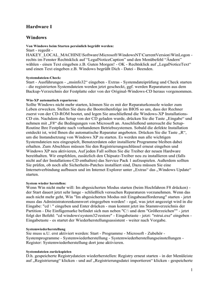Hardware I Windows Von Windows beim Starten persönlich begrüßt werden: Start - regedit HAKEY_LOCAL_MACHINE\Software\Microsoft\WindowsNT\CurrentVersion\WinLogon rechts im Fenster Rechtsklick auf “LegalNoticeCaption” und den Menübefehl “Ändern” wählen - einen Text eingeben z.B. Guten Morgen! - OK - Rechtsklick auf „LegalNoticeText“ und einen Text eingeben z.B. Windows begrüßt Dich - Datei - Beenden. Systemdateien-Check: Start - Ausführungen - „msinfo32“ eingeben - Extras - Systemdateiprüfung und Check starten - die registrierten Systemdateien werden jetzt gescheckt, ggf. werden Reparaturen aus dem Backup-Verzeichnis der Festplatte oder von der Original-Windows-CD heraus vorgenommen. Win-XP automatisch reparieren: Sollte Windows nicht mehr starten, können Sie es mit der Reparaturkonsole wieder zum Leben erwecken. Stellen Sie dazu die Bootreihenfolge im BIOS so um, dass der Rechner zuerst von der CD-ROM bootet, und legen Sie anschließend die Windows-XP InstallationsCD ein. Nachdem das Setup von der CD geladen wurde, drücken Sie die Taste „Eingabe“ und nehmen mit „F8“ die Bedingungen von Microsoft an. Anschließend untersucht die SetupRoutine Ihre Festplatte nach vorhandenen Betriebssystemen. Sobald die defekte Installation entdeckt ist, wird Ihnen die automatische Reparatur angeboten. Drücken Sie die Taste „R“, um die Instandsetzung von Windows XP zu starten. Es werden nun alle wichtigen Systemdateien neu eingespielt, Benutzerdaten oder installierte Programme bleiben dabei erhalten. Zum Abschluss müssen Sie den Registrierungsschlüssel erneut eingeben und Windows XP neu aktivieren, Auf jeden Fall sollten Sie die Treiber der neuen Hardware bereithalten. Wir empfehlen, zusätzlich den Chipsatz-Treiber neu zu installieren und (falls nicht auf der Installations-CD enthalten) das Service Pack 1 aufzuspielen. Außerdem sollten Sie prüfen, ob noch alle Sicherheits-Patches installiert sind, Dazu müssen Sie eine Internetverbindung aufbauen und im Internet Explorer unter „Extras“ das „Windows Update“ starten. System wieder herstellen: Wenn Win nicht mehr will: Im abgesicherten Modus starten (beim Hochfahren F8 drücken) der Start dauert jetzt sehr lange - schließlich versuchen Reparaturen vorzunehmen. Wenn das auch nicht mehr geht, Win "Im abgesicherten Modus mit Eingabeaufforderung" starten - jetzt muss das Administratorenkennwort eingegeben werden! - egal, was jetzt angezeigt wird in die Eingabe: "cd \ " eingeben und Enter drücken - man kommt jetzt ins Stammverzeichnis der Partition - Die Einfügemarke befindet sich nun neben "C:\ und dem "Größerzeichen"" - jetzt folgt der Befehl: "cd windows\system32\restore" - Eingabetaste - jetzt: "rstrui.exe" eingeben Eingabetaste - es startet der Wiederherstellungsassistent - weiter nach Vorgabe. Systemwiederherstellung Sie muss u.U. erst aktiviert werden: Start - Programme - Microsoft - Zubehör Systemprogramme - Systemwiederherstellung - Systemwiederherstellungseinstellungen Register: Systemwiederherstellung dort jene aktivieren. Systemdateien zurückspielen D.h. gespeicherte Registrydateien wiederherstellen: Registry erneut starten - in der Menüleiste auf „Registrierung“ klicken - und auf „Registrierungsdatei importieren“ klicken - gespeicherte 1 Datei markieren - öffnen - damit sind die alten Werte wieder hergestellt. Systemdateien wiederherstellen Bei großen Probleme die automatische Sicherung, die Windows anlegt hernehmen - Während des Bootens die Taste „F8“ drücken - Option „Nur Eingabeaufforderung“ wählen „scanreg/restore“ eingeben - Entertaste drücken , die Registrierungsüberprüfung startet - aus der Liste über die Pfeiltasten eine Sicherungsdatei auswählen - Entertaste drücken - Folgt die Meldung „Eine fehlerfreie Registrierung wurde wieder hergestellt“, den Rechner neu starten. Win XP Systemdateien erneuern Win Instal.-CD einlegen/ Ausführen/ sfc /scannow (zwischen c und / ist eine Leerstelle) OK; jetzt wird Win XP gescannt und es werden falsche oder fehlende Dateien ersetzt. Windows XP wiederherstellen, reparieren usw. Siehe “„Windows Intern - XP die größten Geheimnisse S. 36 unter: Wiederherstellungskonsole. Win im “abgesicherten” Modus starten: Rechner Neustarten und wenn Win startet die Taste Strg oder F8- Taste gedrückt halten. Laufwerksbuchstaben A und B verwenden: In Windows werden standardmäßig die Laufwerksbuchstaben „A“ und“B“ für Diskettenlaufwerke reserviert, die heute gar nicht mehr in Rechner eingebaut werden und schon gar nicht gleich zwei davon (das stammt noch aus Win-Urzeiten). Diese Buchstaben kann man frei geben, sodass sie in der Datenträgerverwaltung für andere Laufwerke zur Verfügung stehen: Start – Ausführen und dort folgende Zeile eingeben: net use a:\\Server\Freigabe – OK. Wobei „a“ für das Diskettenlaufwerk „A“ steht. Um „B“ freizugeben gibt man dieselbe Zeile noch mal ein, jetzt allerdings mit „b“ statt „a“ und wieder OK. DVDs lassen sich nicht starten: DVD einlegen und Shift für ca. 10 bis 15 sec halten - Arbeitsplatz öffnen - Rechtsklick und das DVD-Laufwerk - Öffnen - Ordner html öffnen - Datei „index.htm“ öffnen. Windows Dateisystem reparieren: Wenn es Fehler im Dateisystem gibt, kann Win bestimmte Bereiche der Festplatte nicht mehr beschreiben - Reparatur: Arbeitsplatz - Rechtsklick auf die zu prüfende Partition Eigenschaften - Extras - auf „Jetzt prüfen“ klicken; dazu die Option „Dateisystemfehler automatisch korrigieren“ aktivieren und „Fehlerhafte Sektoren suchen/Wiederherstellen“ aktivieren - Starten. Systemdatei-Check: Start - Ausführen - „msinfo32“ eingeben - OK - im Programm: Extras Systemdateiüberprüfung und Start; findet Win defekte Dateien, werden sie aus dem Backup ersetzt. Bildervorschau des Explorers drucken: In den Ordner mit den Bildern, deren Vorschauen gedruckt werden sollen navigieren - links auf „Bilder drucken“ klicken und