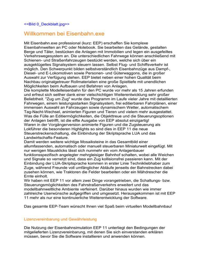 <<Bild 0_Deckblatt.jpg>> Willkommen bei Eisenbahn.exe Mit Eisenbahn.exe professional (kurz: EEP) erschaffen Sie komplexe Eisenbahnwelten an PC oder Notebook. Sie bearbeiten das Gelände, gestalten Berge und Täler, bestücken die Anlagen mit Immobilien und legen ein ausgefeiltes Verkehrswegesystem an. Die unterschiedlichen Fahrwege können anschließend mit Schienen- und Straßenfahrzeugen bestückt werden, welche sich über ein ausgeklügeltes Signalsystem steuern lassen. Selbst Flug- und Schiffsverkehr ist möglich. Den Schwerpunkt bilden selbstverständlich Eisenbahnzüge aus Dampf-, Diesel- und E-Lokomotiven sowie Personen- und Güterwaggons, die in großer Auswahl zur Verfügung stehen. EEP bietet neben einer hohen Qualität beim Nachbau originalgetreuer Rollmaterialien eine große Spieltiefe mit unendlichen Möglichkeiten beim Aufbauen und Befahren von Anlagen. Die komplette Modelleisenbahn für den PC wurde vor mehr als 15 Jahren erfunden und erfreut sich seither dank einer vielschichtigen Weiterentwicklung sehr großer Beliebtheit. "Zug um Zug" wurde das Programm im Laufe vieler Jahre mit detaillierten Fahrwegen, einem leistungsstarken Signalsystem, frei editierbaren Fahrplänen, einer immensen Auswahl an Fahrzeugen sowie dynamischem Wetter, automatischem Tag-Nacht-Wechsel, animierten Figuren und Tieren und vielem mehr ausgestattet. Was die Fülle an Editiermöglichkeiten, die Objekttreue und die Steuerungsoptionen der Anlagen betrifft, ist die elfte Ausgabe von EEP absolut einzigartig! Waren in der Vorgängerversion animierte Figuren und die Zugsteuerung als Lokführer die besonderen Highlights so sind dies in EEP 11 die neue Steuerstreckenschaltung, die Einbindung der Skriptsprache LUA und das Landwirtschafts-Feature. Damit werden weitere wichtige Mosaiksteine in das Gesamtbild einer allumfassenden, automatisch oder manuell steuerbaren Miniaturwelt eingefügt. Mit nur wenigen Mausklicks lässt sich nunmehr ein vom Anlagenbauer funktionsspezifisch angelegter mehrgleisiger Bahnhof schalten, wobei alle Weichen und Signale so vernetzt sind, dass ein Zug kollisionsfrei passieren kann. Mit der Einbindung der LUA-Skriptsprache kommen in erster Linie Technikliebhaber zum Zuge, während Freunde voll umfänglicher Abläufe jenseits der Bahnstrecken dabei zusehen können, wie Traktoren die Felder bearbeiten oder ein Mähdrescher die Ernte einholt. Wir haben mit EEP 11 vor allem zwei Dinge vorangetrieben, die Schaltungs- bzw. Steuerungsmöglichkeiten des Fahrstraßenverkehrs erweitert und das modellbahnweltliche Ambiente verfeinert. Darüber hinaus wurden wie immer zahlreiche Userwünsche aufgegriffen und umgesetzt. Herausgekommen ist mit EEP 11 mehr als nur eine kontinuierliche Weiterentwicklung der Software. Das gesamte EEP-Team wünscht Ihnen viel Spaß beim virtuellen Modellbahnbau! Lizenzvereinbarung und Gewährleistung Die Nutzung der Eisenbahnsimulation EEP 11 unterliegt den Bedingungen der mitgelieferten Lizenzvereinbarung, mit denen Sie sich einverstanden erklären müssen, bevor Sie die Software installieren und anwenden können. EEP 11 kann nur genutzt werden, wenn das Programm registriert wurde. Erst mit der Registrierung und dem Eintrag der dabei erworbenen persönlichen Seriennummer wird das Programm freigeschaltet. Nach der ersten Registrierung ist der Anwender berechtigt, das Programm bis zu fünf Mal pro Jahr für einen neuen, einen umgerüsteten oder für weitere Computer freizuschalten. Dieses personifizierte Nutzungsrecht gilt nicht nur für das Hauptprogramm EEP 11, sondern auch für zusätzliche erworbene Modelle, denn auch bei diesen wird die persönliche Kundennummer beim Kauf eingetragen. Damit ist gewährleistet, dass diese Modelle ausschließlich auf dem Computer funktionieren, der mit der gleichen EEP 11Seriennummer und Registriernummer freigeschaltet wurde. Alle Hard- und Softwarebezeichnungen, die in diesem Handbuch erwähnt werden, sind eingetragene Warenzeichen und sind als solche zu betrachten. Wir haben alle Sorgfalt walten lassen, um vollständige und präzise Informationen in diesem Handbuch wie im Programm und anderen Informationsblättern zu publizieren. Die Trend Redaktions- und Verlagsgesellschaft mbH Deutschland übernimmt weder Garantie noch juristische Verantwortung oder irgendeine Haftung für die Nutzung dieser Informationen. Für Schaden, die auf eine Fehlfunktion von Programmen, Schaltplänen u.a. zurückzuführen sind, kann Trend nicht haftbar gemacht werden, auch nicht für die Verletzung von Patent- und anderen Rechten Dritter, die daraus resultieren. Alle Rechte vorbehalten. Kein Teil dieses Werkes darf in irgendeiner Form (Druck, Fotokopie, Mikrofilm oder in einem anderen Verfahren) ohne vorherige schriftliche Genehmigung der Trend Redaktions- und Verlagsgesellschaft mbH reproduziert oder unter Verwendung elektronischer Systeme verarbeitet, vervielfältigt oder verbreitet werden. Eine kommerzielle Verwendung der Software bedarf ebenfalls der Zustimmung der Trend Redaktions- und Verlagsgesellschaft mbH. TREND Redaktions- und Verlagsgesellschaft mbH Germany · Copyright © seit 2003 Inhaltsverzeichnis << später bitte Seitenzahlen ergänzen!>> 1. Installation, Start und Registrierung von Eisenbahn X 1.1 Systemvoraussetzungen 1.2 Installation 1.3 Vorteil der Registrierung 1.4 De-Installation 2. Bildschirmaufbau 2.1 Das EEP-Fenster in der 2D und 3D-Ansicht 2.2 Die Funktionsleisten 2.2.1 Das Menü 2.2.2 Die Werkzeugleiste 2.2.3 Die Kontrollleisten 2.3. Der neue Gizmo (Manipulator) 2.4. Navigieren mit der Maus 3. Kameraführung 3.1 Bedienung und Steuerung 3.1.1 Kamera positionieren und ausrichten 3.1.2 Kamerapositionen speichern 3.1.3 Die mobile Kamera 3.2 Kameraführung im 3D-Fenster 3.2.1 Die frei bewegliche Kamera 3.2.2 Die gekoppelte Kamera 3.2.3 Der Verfolgungsmodus 3.2.4 Die Timer-Kamera 3.2.5 Kamerawechsel durch Kontaktpunkte 4. Anlagen bauen und gestalten 4.1 EEP entdecken und kennenlernen 4.2 Eine neue Anlage einrichten 4.3 Modellierun