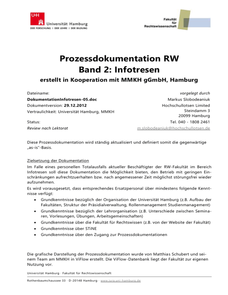Prozessdokumentation RW Band 2: Infotresen erstellt in Kooperation mit MMKH gGmbH, Hamburg Dateiname: vorgelegt durch DokumentationInfotresen-05.doc Markus Slobodeaniuk Dokumentversion: 29.12.2012 Hochschullotsen Limited Steindamm 3 20099 Hamburg Vertraulichkeit: Universität Hamburg, MMKH Status: Tel. 040 - 1808 2461 Review nach Lektorat [email protected] Diese Prozessdokumentation wird ständig aktualisiert und definiert somit die gegenwärtige „as-is“-Basis. Zielsetzung der Dokumentation Im Falle eines personellen Totalausfalls aktueller Beschäftigter der RW-Fakultät im Bereich Infotresen soll diese Dokumentation die Möglichkeit bieten, den Betrieb mit geringen Einschränkungen aufrechtzuerhalten bzw. nach angemessener Zeit möglichst störungsfrei wieder aufzunehmen. Es wird vorausgesetzt, dass entsprechendes Ersatzpersonal über mindestens folgende Kenntnisse verfügt: Grundkenntnisse bezüglich der Organisation der Universität Hamburg (z.B. Aufbau der Fakultäten, Struktur der Präsidialverwaltung, Rollenmanagement Studienmanagement) Grundkenntnisse bezüglich der Lehrorganisation (z.B. Unterschiede zwischen Seminaren, Vorlesungen, Übungen, Arbeitsgemeinschaften) Grundkenntnisse über die Fakultät für Rechtswissen (z.B. von der Website der Fakultät) Grundkenntnisse über STiNE Grundkenntnisse über den Zugang zur Prozessdokumentationen Die grafische Darstellung der Prozessdokumentation wurde von Matthia s Schubert und seinem Team am MMKH in ViFlow erstellt. Die ViFlow-Datenbank liegt der Fakultät zur eigenen Nutzung vor. Universität Hamburg · Fakultät für Rechtswissenschaft Rothenbaumchaussee 33 · D-20148 Hamburg · www.jura.uni-hamburg.de Studienmanagement Seite 2 / 67 Band 2: Infotresen Version 29.12.2012 Inhaltsverzeichnis Inhaltsverzeichnis .......................................................................................................................................... 2 Konventionen ................................................................................................................................................. 5 Grafische Prozessdokumentation und Textdokumentation ........................................................ 5 Dateien ..................................................................................................................................................... 5 Personen und Funktionen ................................................................................................................... 5 1 Übersicht ............................................................................................................................................... 12 1.1 Prozesslandkarte Infotresen ........................................................................................................ 12 1.2 Prozesse mit fester Zeittaktung im Tagesverlauf .................................................................... 14 1.3 Wöchentliche Aufgaben ............................................................................................................... 15 1.4 Monatliche Aufgaben ............................................................................................................... 15 1.5 Prozesse mit Semestertaktung .................................................................................................... 16 1.6 Ereignisgesteuerte Aufgaben .................................................................................................. 16 1.7 Weitere Aufgaben .......................................................................................................................... 17 2 Kernaufgabe: Information ................................................................................................................. 18 2.1 Einarbeitung .................................................................................................................................... 18 2.2 3 Weitergehende Informationen .......................................... Error! Bookmark not defined. Tagesgeschäft ...................................................................................................................................... 20 3.1 Öffnungszeiten ............................................................................................................................... 20 3.2 4 Postbearbeitung ......................................................................................................................... 20 3.2.1. Briefkästen............................................................................................................................... 21 3.2.2. Postausgang (intern) ......................................................................................................... 21 3.2.3. Postausgang (extern) ........................................................................................................ 23 3.2.4. Posteingang bearbeiten ............................................................................................... 24 3.3 Fristenbriefkasten ................................................................................................................... 24 3.4 Paketbearbeitung ....................................................................................................................... 25 3.4.1. Paketausgang ...................................................................................................................... 26 3.4.2. Paketeingang .................................................................................................................. 27 Wiederkehrende Aufgaben ............................................................................................................... 28 4.1 Infoscreen................................................................................................................................. 28 4.2 Druckaufträge Studienmanagement ...................................................................