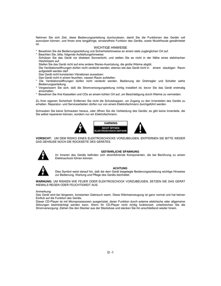 Nehmen Sie sich Zeit, diese Bedienungsanleitung durchzulesen, damit Sie die Funktionen des Geräts voll ausnutzen können, und Ihnen eine langjährige, einwandfreie Funktion des Geräts, sowie Musikfreude gewährleitet ist. WICHTIGE HINWEISE * Bewahren Sie die Bedienungsanleitung und Sicherheitshinweise an einem stets zugänglichen Ort auf. * Beachten Sie, bitte, folgende Aufstellungshinweise: Schützen Sie das Gerät vor direktem Sonnenlicht, und stellen Sie es nicht in der Nähe eines elektrischen Heizkörpers auf. Stellen Sie das Gerät nicht auf eine andere Stereo-Ausrüstung, die große Wärme abgibt. Die Ventilationsöffnungen dürfen nicht verdeckt werden, ebenso wie das Gerät nicht in einem staubigen Raum aufgestellt werden darf. Das Gerät nicht konstanten Vibrationen aussetzen. Das Gerät nicht in einem feuchten, nassen Raum aufstellen. * Die Ventilationsöffnungen dürfen nicht verdeckt werden. Bedienung der Drehregler und Schalter siehe Bedienungsanleitung. * Vergewissern Sie sich, daß die Stromversorgungsleitung richtig installiert ist, bevor Sie das Gerät erstmalig einschalten. * Bewahren Sie Ihre Kassetten und CDs an einem kühlen Ort auf, um Beschädigung durch Wärme zu vermeiden. Zu Ihrer eigenen Sicherheit: Entfernen Sie nicht die Schutzkappen, um Zugang zu den Innenteilen des Geräts zu erhalten. Reparatur- und Servicearbeiten dürfen nur von einem Elektrofachmann durchgeführt werden. Schrauben Sie keine Schrauben heraus, oder öffnen Sie die Verkleidung des Geräts; es gibt keine Innenteile, die Sie selbst reparieren können, sondern nur ein Elektrofachmann. VARNING NICHT ÖFFNEN ELEKTROSCHOCK-GEFAHR VORSICHT: UM DEM RISIKO EINES ELEKTROSCHOCKS VORZUBEUGEN, ENTFERNEN SIE BITTE WEDER DAS GEHÄUSE NOCH DIE RÜCKSEITE DES GERÄTES. GEFÄHRLICHE SPANNUNG Im Inneren des Geräts befinden sich stromführende Komponenten, die bei Berührung zu einem Elektroschock führen können. ACHTUNG Dies Symbol weist darauf hin, daß die dem Gerät beigelegte Bedienungsanleitung wichtige Hinweise zur Bedienung, Wartung und Pflege des Geräts beinhaltet. WARNUNG: UM RISIKEN WIE FEUER ODER ELEKTROSCHOCK VORZUBEUGEN, SETZEN SIE DAS GERÄT NIEMALS REGEN ODER FEUCHTIGKEIT AUS. Anmerkung: Das Gerät wird bei längerem, konstanten Gebrauch warm. Diese Wärmeerzeugung ist ganz normal und hat keinen Einfluß auf die Funktion des Geräts. Dieser CD-Player ist mit Microprozessoren ausgerüstet, deren Funktion durch externe elektrische oder allgemeine Störungen beeinträchtigt werden kann. Wenn Ihr CD-Player nicht richtig funktioniert, unterbrechen Sie die Stromversorgung: Ziehen Sie den Stecker aus der Steckdose und stecken Sie ihn anschließend wieder hinein. D -1 MERKMALE UND BEDIENUNGSTASTEN 1. 2. 3. 4. 5. 6. 7. 8. 9. 10. 11. 12. 13. 14. 15. 16. 17. 18. 19. 20. 21. 22. 23. 24. 25. 26. 27. 28. 29. 30. 31. 32. 33. 34. 35. CD-LADE ÖFFNEN EIN-/AUS-TASTE TUNER / BAND-TASTE LAUTSTÄRKE HÖHER WIEDERGABE / PAUSE LAUTSTÄRKE LEISER CD / NAME SUCHEN INFRAROT SENSOR DISPLAY / SPUR SUCHEN MODE TASTE MEMORY / C.ADJ TASTE KASSETTEN TASTE TUNING / SKIP / SUCHEN / ZURÜCKSPULEN STOPP TASTE VOREINSTELLUNG ENTZERRER WIEDERHOLUNG ZEITANGABE FM MODUS (STEREO / MONO) KOPFHÖRER KASSETTE AUFNAHME KASSETTE WIEDERGABE KASSETTE ZURÜCKSPULEN KASSETTE SCHNELLAUF FORWÄRTS KASSETTE STOPP / EJECT KASSETTE PAUSE TASTE BATTERIEFACH HILFSSPEICHER DUAL SPANNUNGS TASTE AC BETRIEBSTASTE AC ANSCHLUßKABEL BEAT-CUT TASTE LAUTSPRECHER ANSCHLÜSSE RESET AM ANTENNE FM ANTENNE SBB-EIN-ANZEIGE D -2 FERNBEDIENUNG 1. 2. 3. 4. 5. 6. 7. 8. 9. 10. 11. 12. 13. 14. 15. 16. 17. 18. 19. 20. 21. 22. 23. 24. 25. EIN-/AUS-TASTE DISPLAY MODUS TASTE TIMER TASTE WIEDERGABE / PAUSE TUNER / BAND-TASTE RANDOM TASTE SLEEP TASTE TASTE 1 TASTE 4 TASTE 7 TASTE 0 STUMMSCHALTEN TUNING / SKIP / SUCHEN (RÜCKWÄRTS & VORWÄRTS SPULEN) CD / NAME SUCHEN STOPP TASTE WIEDERHOLUNGS-TASTE TASTE 3 TASTE 2 TASTE 6 TASTE 5 TASTE 9 TASTE 8 VOREINSTELLUNG ENTZERRER TASTE FÜR >10 LAUTSTÄRKE (HÖHER/LEISER) 13 1 2 3 4 5 6 7 8 9 10 11 12 14 15 16 1 1 1 2 2 2 2 2 7 8 9 0 1 2 3 4 25 EINSETZEN DER BATTERIEN IN DIE FERNBEDIENUNG Den Batteriefachdeckel nach unten drücken und entfernen. Zwei (UM3), (AA), (R6) Batterien einsetzen. Achten Sie auf die richtige Polarität (”+” und ”-”). Deckel wieder vorsichtig schließen durch leichten Druck nach oben. ** BATTERIEN SIND IM LIEFERUMFANG NICHT BEINHALTET ** ANMERKUNG: Alle Batterien gleichzeitig auswechseln. Nehmen Sie die Batterien heraus, wenn die Fernbedienung für längere Zeit nicht benutzt wird. Keine normalen Batterien zusammen mit aufladbaren Batterien verwenden. Schwache Batterien führen Funktionsstörungen der Fernbedienung mit sich. Wechseln Sie in diesem Fall die Batterien aus. ANSCHLUß DES LAUTSPRECHERKABELS AN DIE LAUTSPRECHERANSCHLUßKLEMMEN 1 Lautsprecheranschluß Strecken Sie die LAUTSPRECHERKABEL aus, und verbinden Sie diese mit den LAUTSPRECHERANSCHLUßKLEMMEN. 2 Verbindung der Netzleitung Verbinden Sie zunächst die AC Netzleitung mit dem AC Ausgang; anschließend die Ein-/Aus-Taste auf dem Gerät einschalten. UBWOOFERANSCHLUSS Schließen Sie den Subwoofer mit dem RCA-Kabel (mitgeliefert) an die SBB-EINGANGSBUCHSE (37). Schließen Sie das SUBWOOFER-Netzkabel (3) an eine AC-Steckdose an. Überprüfen Sie, daß Ihre Stromversorgung 230V, 50Hz beträgt. D -3 BEDIENUNG DES GERÄTS Nach Anschluß des Geräts an den AC Ausgang, befindet sich das Gerät im Standby-Modus. Durch Betätigung der POWER Taste am Gerät oder auf der Fernbedienung können Sie nun das Gerät EIN- und AUSSCHALTEN. Ziehen Sie den Stecker aus der Wandsteckdose, um das Gerät völlig abzuschalten. STROMVERSORGUNG / STANDBY 1. Schalten Sie mit der POWER Taste auf dem Gerät (oder auf der Fernbedienung) das Gerät ein. 2. Wählen Sie mit der entsprechenden Funktionstaste die Tonquelle (CD/MP3, Radio oder Kassette). 3. Stellen Sie die Lautstärke mit der VOLUME Taste (UP/DOWN – auf/ab) ein. 4. Stellen Sie mit der PRESET EQ Taste au