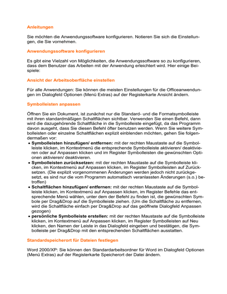 Anleitungen Sie möchten die Anwendungssoftware konfigurieren. Notieren Sie sich die Einstellungen, die Sie vornehmen. Anwendungssoftware konfigurieren Es gibt eine Vielzahl von Möglichkeiten, die Anwendungssoftware so zu konfigurieren, dass dem Benutzer das Arbeiten mit der Anwendung erleichtert wird. Hier einige Beispiele: Ansicht der Arbeitsoberfläche einstellen Für alle Anwendungen: Sie können die meisten Einstellungen für die Officeanwendungen im Dialogfeld Optionen (Menü Extras) auf der Registerkarte Ansicht ändern. Symbolleisten anpassen Öffnen Sie ein Dokument, ist zunächst nur die Standard- und die Formatsymbolleiste mit ihren standardmäßigen Schaltflächen sichtbar. Verwenden Sie einen Befehl, dann wird die dazugehörende Schaltfläche in die Symbolleiste eingefügt, da das Programm davon ausgeht, dass Sie diesen Befehl öfter benutzen werden. Wenn Sie weitere Symbolleisten oder einzelne Schaltflächen explizit einblenden möchten, gehen Sie folgendermaßen vor: Symbolleisten hinzufügen/ entfernen: mit der rechten Maustaste auf die Symbolleiste klicken, im Kontextmenü die entsprechende Symbolleiste aktivieren/ deaktivieren oder auf Anpassen klicken und im Register Symbolleisten die gewünschten Optionen aktivieren/ deaktivieren. Symbolleisten zurücksetzen: mit der rechten Maustaste auf die Symbolleiste klicken, im Kontextmenü auf Anpassen klicken, im Register Symbolleisten auf Zurücksetzen. (Die explizit vorgenommenen Änderungen werden jedoch nicht zurückgesetzt, es sind nur die vom Programm automatisch veranlassten Änderungen (s.o.) betroffen) Schaltflächen hinzufügen/ entfernen: mit der rechten Maustaste auf die Symbolleiste klicken, im Kontextmenü auf Anpassen klicken, im Register Befehle das entsprechende Menü wählen, unter dem der Befehl zu finden ist, die gewünschten Symbole per Drag&Drop auf die Symbolleiste ziehen. (Um die Schaltfläche zu entfernen, wird die Schaltfläche einfach per Drag&Drop auf das geöffnete Dialogfeld Anpassen gezogen) persönliche Symbolleiste erstellen: mit der rechten Maustaste auf die Symbolleiste klicken, im Kontextmenü auf Anpassen klicken, im Register Symbolleisten auf Neu klicken, den Namen der Leiste in das Dialogfeld eingeben und bestätigen, die Symbolleiste per Drag&Drop mit den entsprechenden Schaltflächen ausstatten. Standardspeicherort für Dateien festlegen Word 2000/XP: Sie können den Standardarbeitsordner für Word im Dialogfeld Optionen (Menü Extras) auf der Registerkarte Speicherort der Datei ändern. Excel 2000/XP: Sie können den Standardarbeitsordner für Excel im Dialogfeld Optionen (Menü Extras) auf der Registerkarte Allgemein ändern. Powerpoint 2000/XP: Sie können den Standardarbeitsordner für Powerpoint im Dialogfeld Optionen (Menü Extras) auf der Registerkarte Speichern ändern. Standardformat für Dokumente einstellen Für alle Anwendungen: In vielen Dialogfeldern gibt es die Standardschaltflächen (z. B. bei Schriftart, Seitenrand....). Wählen Sie Ihre Schriftart beispielsweise Arial 12 aus und betätigen Sie dann die Standardschaltfläche. Die Schriftart ist nun Standardschriftart und wird in die Vorlage NORMAL.DOT übertragen, d.h. dass beim Öffnen eines leeren Dokuments wird nun automatisch die Standardschriftart Arial 12 formatiert. Vorlagen für Dokumente einstellen Für alle Anwendungen: Öffnen Sie ein neues Dokument. Nehmen Sie alle Formatierungen vor, die Sie standardmäßig beim Öffnen eines leeren Dokuments benötigen. Speichern Sie die Datei als Vorlage ab: SPEICHERN UNTER wählen – den DATEITYP VORLAGE auswählen (DOT, XLT oder POT) – einen Namen vergeben – OK Makros Die Gesamtheit mehrere aufeinanderfolgenden Befehle, die sich während einer Anwendung häufig wiederholen, können in einem Makro aufgezeichnet werden. Makros dienen der Zeitersparnis und der Arbeitserleichterung. Mit einem Makro können Sie eine Anwendung (z.B. Excel) um diese Funktion bereichern. Im Internet gibt es ein große Anzahl an vorgefertigten Makros. Siehe »Links«. Beim Klicken der Tasten »Alt« und »F11« öffnet sich das Makrofenster. Um den Visual Basic Editor zu öffnen, müssen sie die Schaltfläche »Erstellen« anklicken. Der vorprogrammierte Quellcode wird einfach kopiert und im Editorfenster eingefügt. Beachten Sie bitte, dass die im Editorfenster bereits existierende Befehle (»Sub ..()« und »End Sub«) überschrieben werden müssen. Um ein Makro auszuführen, müssen Sie im »Makro« Fenster das entsprechende Makro auswählen und anschließend auf die Schaltfläche »Ausführen« klicken. Softwarekonfiguration Outlook E-Mail-Konten einrichten Wenn Sie die Variante NUR VIA INTERNET gewählt haben: Wenn Sie das EMailkonto einrichten, sollten Sie folgende Informationen zur Verfügung haben: IP-Adresse oder Servername des Mail-Servers E-Mail-Adresse Benutzername und Kennwort für den Mail-Server Wenn Sie alle Informationen parat haben, gehen Sie folgendermaßen vor: Outlook starten – Menü EXTRAS – KONTEN es werden alle bisher eingerichteten Konten angezeigt Schaltfläche HINZUFÜGEN – E-MAIL auswählen der Assistent für den Internet-Zugang wird gestartet Vor- und Nachname eingeben E-MAIL Adresse, die Sie von Ihrem Internetanbieter erhalten haben eintragen – in das Feld POSTEINGANG den POP3-Servernamen oder IP desselben eintragen in das Feld POSTAUSGANG den SMTP-Servernamen oder IP desselben eintragen (bei den meisten Anbietern ist der Name von POP3 und SMTP-Server identisch) in Feldern Benutzername und Kennwort die entsprechenden Eingaben machen (hier geht es um Benutzername und Kennwort, mit denen Sie sich beim Mailserver anmelden) wählen Sie, ob Sie via Modem, via LAN oder DFÜ die Verbindung aufnehmen haben Sie die Option Modem gewählt erscheint im nächsten Fenster das Modem oder die ISDN-Karte, die Sie verwenden Vorwahl sowie Rufnummer des Internet-Anbieters eintragen Benutzername und Kennwort eintragen (hier geht es um Benutzername und Kennwort, mit denen S