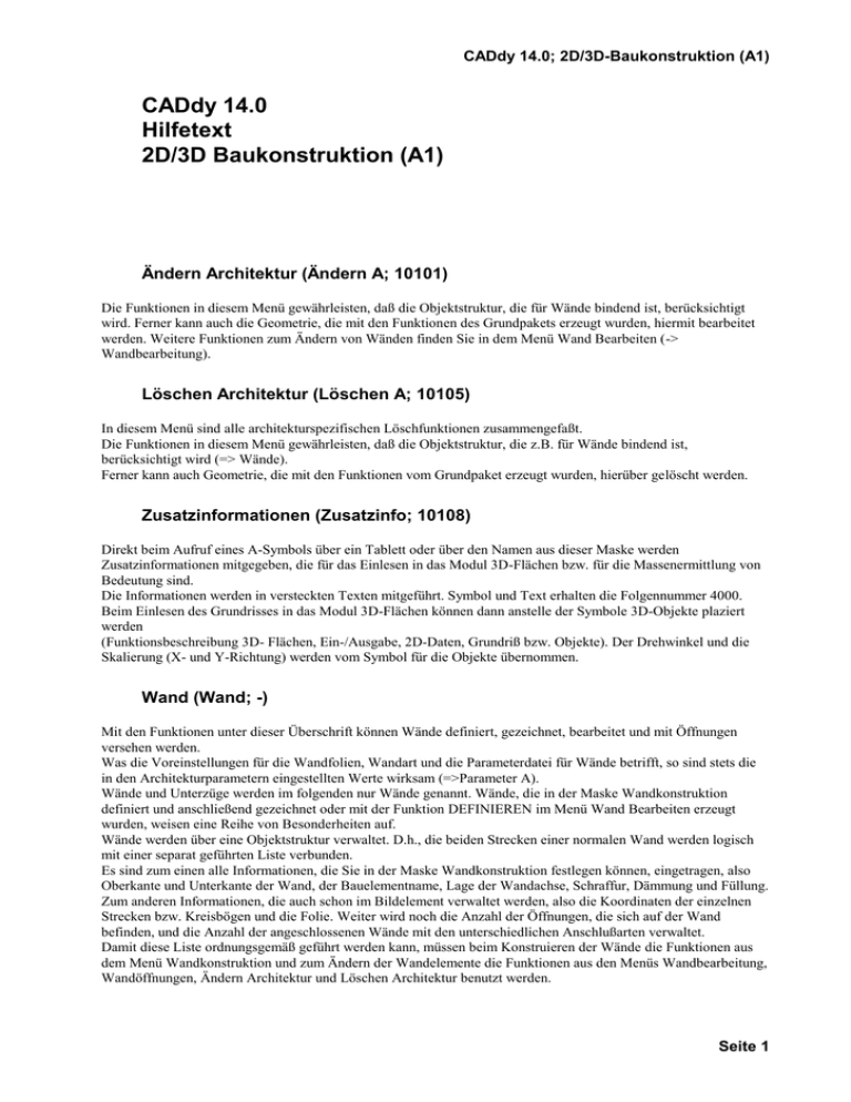 CADdy 14.0; 2D/3D-Baukonstruktion (A1) CADdy 14.0 Hilfetext 2D/3D Baukonstruktion (A1) Ändern Architektur (Ändern A; 10101) Die Funktionen in diesem Menü gewährleisten, daß die Objektstruktur, die für Wände bindend ist, berücksichtigt wird. Ferner kann auch die Geometrie, die mit den Funktionen des Grundpakets erzeugt wurden, hiermit bearbeitet werden. Weitere Funktionen zum Ändern von Wänden finden Sie in dem Menü Wand Bearbeiten (-> Wandbearbeitung). Löschen Architektur (Löschen A; 10105) In diesem Menü sind alle architekturspezifischen Löschfunktionen zusammengefaßt. Die Funktionen in diesem Menü gewährleisten, daß die Objektstruktur, die z.B. für Wände bindend ist, berücksichtigt wird (=> Wände). Ferner kann auch Geometrie, die mit den Funktionen vom Grundpaket erzeugt wurden, hierüber gelöscht werden. Zusatzinformationen (Zusatzinfo; 10108) Direkt beim Aufruf eines A-Symbols über ein Tablett oder über den Namen aus dieser Maske werden Zusatzinformationen mitgegeben, die für das Einlesen in das Modul 3D-Flächen bzw. für die Massenermittlung von Bedeutung sind. Die Informationen werden in versteckten Texten mitgeführt. Symbol und Text erhalten die Folgennummer 4000. Beim Einlesen des Grundrisses in das Modul 3D-Flächen können dann anstelle der Symbole 3D-Objekte plaziert werden (Funktionsbeschreibung 3D- Flächen, Ein-/Ausgabe, 2D-Daten, Grundriß bzw. Objekte). Der Drehwinkel und die Skalierung (X- und Y-Richtung) werden vom Symbol für die Objekte übernommen. Wand (Wand; -) Mit den Funktionen unter dieser Überschrift können Wände definiert, gezeichnet, bearbeitet und mit Öffnungen versehen werden. Was die Voreinstellungen für die Wandfolien, Wandart und die Parameterdatei für Wände betrifft, so sind stets die in den Architekturparametern eingestellten Werte wirksam (=>Parameter A). Wände und Unterzüge werden im folgenden nur Wände genannt. Wände, die in der Maske Wandkonstruktion definiert und anschließend gezeichnet oder mit der Funktion DEFINIEREN im Menü Wand Bearbeiten erzeugt wurden, weisen eine Reihe von Besonderheiten auf. Wände werden über eine Objektstruktur verwaltet. D.h., die beiden Strecken einer normalen Wand werden logisch mit einer separat geführten Liste verbunden. Es sind zum einen alle Informationen, die Sie in der Maske Wandkonstruktion festlegen können, eingetragen, also Oberkante und Unterkante der Wand, der Bauelementname, Lage der Wandachse, Schraffur, Dämmung und Füllung. Zum anderen Informationen, die auch schon im Bildelement verwaltet werden, also die Koordinaten der einzelnen Strecken bzw. Kreisbögen und die Folie. Weiter wird noch die Anzahl der Öffnungen, die sich auf der Wand befinden, und die Anzahl der angeschlossenen Wände mit den unterschiedlichen Anschlußarten verwaltet. Damit diese Liste ordnungsgemäß geführt werden kann, müssen beim Konstruieren der Wände die Funktionen aus dem Menü Wandkonstruktion und zum Ändern der Wandelemente die Funktionen aus den Menüs Wandbearbeitung, Wandöffnungen, Ändern Architektur und Löschen Architektur benutzt werden. Seite 1 CADdy 14.0; 2D/3D-Baukonstruktion (A1) Wandkonstruktion (Konstrukt.; 10109) Wände können mit Hilfe dieser Funktion definiert, ausgewählt und gezeichnet werden. Nachdem Sie die Funktion aktiviert haben, verzweigen Sie in die Maske Wandauswahl. Wählen Sie eine bereits definierte Wand durch zweimaliges Aktivieren der gewünschten Zeile im mittleren Bereich der Maske (=> Maske Wandauswahl). Ist keine der Wände die gewünschte, so wählen Sie hier Konstruktion und verzweigen somit in die Maske Wandkonstruktion (=> Maske Wand-Konstruktion). Anschließend erscheint das Menü Wand-Konstruktion. Wählen Sie hier die gewünschte Zeichenfunktion, und zeichnen Sie die Wand (=> Menü Wand-Konstruktion). Um vorhandene Wände zu ändern oder mit Öffnungen zu versehen, verwenden Sie bitte ausschließlich die Funktionen im Menü Bearbeiten, Ändern A bzw. Öffnungen. In diesen Untermenüs stehen dann die gewünschten Funktionen zur Verfügung. Wegen der streng geordneten Objektstruktur darf der Grundriß nicht mit Funktionen des Grundpakets bearbeitet werden. Wandbearbeitung (Bearbeiten; 10110) Dieser Menüpunkt führt in das gleichnamige Untermenü. Hier ist es möglich, bereits vorhandene Wände zu ändern, zu löschen und zu definieren. Alle Funktionen in diesem Menü berücksichtigen die Objektstruktur (=> Wände). Die angewählten Funktionen werden so lange wiederholt, bis sie mit <ESC> oder der rechten Maustaste beendet werden. Dies gilt für die Funktion bis auf WANDFÜLLEN und KORREKTUR. Sind die zu bearbeitenden Wände Eckpunkte von Flächen (=>Flächen- Definition), so wird der Flächeninhalt nach Beenden der Funktion neu berechnet. Wandöffnungen (Öffnungen; 10111) Dieser Menüpunkt führt in das gleichnamige Untermenü. Hier ist es möglich, bereits vorhandene Wände mit Öffnungen zu versehen. Sie können Öffnungen in der Ansicht (frei oder geometrieabhängig) oder in der Draufsicht zeichnen. Weiter können Sie Öffnungen mit Funktionen aus diesem Menü ändern. Das Definieren, Ändern, Speichern und Auswählen von Wandöffnungen (Durchbruch, Tür, Fenster) wird in Masken durchgeführt. Der Aufbau sämtlicher Öffnungsmasken ist im wesentlichen gleich. Die grundlegende Beschreibung finden Sie unter der Funktion DURCHBRUCH-KONSTRUKTION. Flächendefinition (Flächen Def; 10145) Flächen können mit dieser Funktion definiert werden. Ist auf Ihrem System ein Modul der Haustechnik (CADdy HTH, HTE, HTL) oder die Wohnflächenberechnung (CADdy WF) installiert, verzweigen Sie in die Maske Raumdefinition. Die dort erscheinenden Funktionen gewährleisten einen optimalen Datenaustausch zwischen den einzelnen CADdy-Modulen, die mit Räumen arbeiten. Arbeiten Sie nur mit der Architektur, verzweigen Sie in das Menü Flächendefinition. Die Flächen sind je nach Konstruktion assoziativ. D.h., beim Ändern der Eckpunkte kann die Fläche n