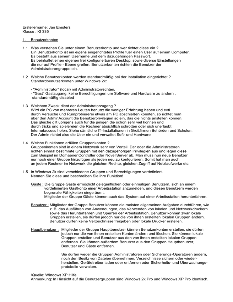 Erstellername: Jan Emsters Klasse : KI 335 1. Benutzerkonten 1.1 Was verstehen Sie unter einem Benutzerkonto und wer richtet diese ein ? Ein Benutzerkonto ist ein eigens eingerichtetes Profile fuer einen User auf einem Computer. Es besteht aus seinem Username und dem dazugehörigen Passwort. Es beinhaltet einen eigenen frei konfigurierbaren Desktop, sowie diverse Einstellungen die nur auf Profile - Ebene greifen. Benutzerkonten richten die Benutzer der Administratorengruppe ein. 1.2 Welche Benutzerkonten werden standardmäßig bei der Installation eingerichtet ? Standardbenutzerkonten unter Windows 2k: - "Administrator" (local) mit Administratorrechten, - "Gast" Gastzugang, keine Berechtigungen um Software und Hardware zu ändern , standardmäßig disabled 1.3 Welchem Zweck dient der Administratorzugang ? Wird ein PC von mehreren Leuten benutzt die weniger Erfahrung haben und evtl. durch Versuche und Rumprobiererei etwas am PC abschießen könnten, so richtet man über den AdminAccount die Benutzerprivilegien so ein, das die nichts anstellen können. Das gleiche gilt übrigens auch für die jenigen die schon sehr viel können und durch tricks und spielereien die Rechner absichtlich schrotten oder sich unerlaubt Internetaccess holen. Siehe sämtliche IT-Installationen in Großfirmen Behörden und Schulen. Der Admin richtet also die User ein und verwaltet Soft- und Hardware 1.4 Welche Funktionen erfüllen Gruppenkonten ? Gruppenkonten sind in einem Netzwerk sehr von Vorteil. Der oder die Administratoren richten einmal bestimmte Gruppen mit den dazugehörigen Privilegien aus und legen diese zum Beispiel im DomaenenController oder NovellServer ab. Man muss nun neue Benutzer nur noch einer Gruppe hinzufügen als jeden neu zu konfgurieren. Somit hat man auch an jedem Rechner im Netzwerk die gleichen Rechte, gleichen Zugriff auf Netzlaufwerke etc. 1.5 In Windows 2k sind verschiedene Gruppen und Berechtigungen vordefiniert. Nennen Sie diese und beschreiben Sie ihre Funktion! Gäste : Die Gruppe Gäste ermöglicht gelegentlichen oder einmaligen Benutzern, sich an einem vordefinierten Gastkonto einer Arbeitsstation anzumelden, und diesen Benutzern werden begrenzte Fähigkeiten eingeräumt. Mitglieder der Gruppe Gäste können auch das System auf einer Arbeitsstation herunterfahren. Benutzer : Mitglieder der Gruppe Benutzer können die meisten allgemeinen Aufgaben durchführen, wie z. B. das Ausführen von Anwendungen, das Verwenden von lokalen und Netzwerkdruckern sowie das Herunterfahren und Sperren der Arbeitsstation. Benutzer können zwar lokale Gruppen erstellen, sie dürfen jedoch nur die von ihnen erstellten lokalen Gruppen ändern. Benutzer dürfen keine Verzeichnisse freigeben oder lokale Drucker erstellen. Hauptbenutzer : Mitglieder der Gruppe Hauptbenutzer können Benutzerkonten erstellen, sie dürfen jedoch nur die von ihnen erstellten Konten ändern und löschen. Sie können lokale Gruppen erstellen und Benutzer aus den von ihnen erstellten lokalen Gruppen entfernen. Sie können außerdem Benutzer aus den Gruppen Hauptbenutzer, Benutzer und Gäste entfernen. Sie dürfen weder die Gruppen Administratoren oder Sicherungs-Operatoren ändern, noch den Besitz von Dateien übernehmen, Verzeichnisse sichern oder wiederherstellen, Gerätetreiber laden oder entfernen oder Sicherheits- und Überwachungsprotokolle verwalten. /Quelle: Windows XP Hilfe Anmerkung: In Hinsicht auf die Benutzergruppen sind Windows 2k Pro und Windows XP Pro identisch. 1.6 Was versteht Windows 2k Pro unter einem Benutzerprofile ? Wie bereits oben unter 1.1 beschrieben : Ein Benutzerprofil definiert angepasste Desktopumgebungen, wie individuelle Anzeigen, sowie Netzwerk- und Druckerverbindungseinstellungen. Ihre Desktopumgebung kann von Ihnen selbst oder vom Systemadministrator eingerichtet werden. Das Startmenü setzt sich aus den Einträgen von ALL USERS und den einträgen von Ihrem Profil zusammen /Quelle: Windows XP Hilfe 2. Dateisysteme 2.1 Was verstehen Sie unter einem Dateisystem ? Der Begriff Dateisystem bezeichnet die Gesamtstruktur, in der Dateien mit einem Namen versehen, abgelegt und angeordnet werden. Windows 2000 unterstützt drei Dateisysteme: FAT, FAT32 und NTFS. Sie können ein Dateisystem auswählen, wenn Sie Windows 2000 installieren, einen bereits vorhandenen Datenträger formatieren oder eine neue Festplatte installieren. 2.2 Windows 2k unterstützt verschiedene Dateisysteme. Nennen Sie diese und beschreiben Sie die Unterschiede hinsichtlich der verwaltbaren HDD-Größe, der Sicherheit, der Länge der Dateinamen und der Kompabilität. Microsoft fährt derzeit mit 3 Systemen FAT , FAT32 und NTFS. Je nach Dateisystem kann man Dateinamen in bestimmtenlängen angeben und Sonderzeichen benutzen: FAT16 (File Allocation Table) : 8 Zeichen plus 3 Erweiterung das sogenannte 8.3 Format Maximale Dateigröße = Maximale Partitionsgröße = 4.294 MByte FAT32 : Abkürzung für "File Allocation Table 32" - Nachfolger des Dateisystems FAT - FAT32 ermöglicht eine effizientere Nutzung der Festplattenkapazität. Auf Grund der großen Kapazitätenverschwendung beim Dateisystem FAT16, welches von Windows95 und MS-DOS genutzt wurde, wurde mit Windows98 das Dateisystem FAT32 eingeführt. Die Cluster sind kleiner gegenüber FAT 16, duch den größeren Verwaltungsaufwand sollte mindestens eine Pentium 90 MHz CPU verwendet werden. Die Dateinamen sind nun nicht mehr an das 8.3 Format gebunden. Max. 2 TB Partitionsgröße. NTFS : Bedeutet New Technology File System und wurde für Windows NT konzipiert. Ab Windows NT 4.0 mit Service Pack 4 konnte NT auch NTFS 5.0 lesen. In Windows 2000 wurde NTFS aber noch einmal verbessert. Die Grundlage von NTFS bildet das Dateisystem HPFS von OS/2. NTFS besitzt gegenüber FAT mehrere Vorteile: Vergabe von Zugriffsberechtigungen durch den Administrator sowohl für Verzeichnisse als auch für Dateien. Diese Berechtigungen können unterschiedlich definiert sein (z.B. Lesen, Schreiben und Ausfü