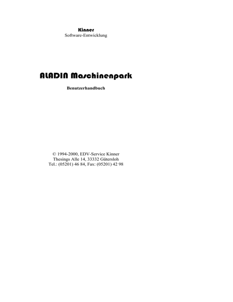 Kinner Software-Entwicklung ALADIN Maschinenpark Benutzerhandbuch © 1994-2000, EDV-Service Kinner Thesings Alle 14, 33332 Gütersloh Tel.: (05201) 46 84, Fax: (05201) 42 98 Copyright© EDV-Service Kinner Thesings Allee 14 33332 Gütersloh Vertrieb u. Support EDV-Service Kinner Software Am Alten Hof 12 33790 Halle/Westf. Tel.: (05201) 46 84 Fax: (05201) 42 98 Eine Hotline für registrierte Anwender ist, außer in Urlaubszeiten, Dienstags und Donnerstags von 10.00-12.00 Uhr eingerichtet. Alle genannten eingetragenen Warenzeichen werden hiermit anerkannt. Die vorliegende Dokumentation ist urheberrechtlich geschützt. Alle Rechte sind vorbehalten. Kein Teil dieser Dokumentation darf ohne schriftliche Genehmigung der Firma EDV-Service Kinner, 33332 Gütersloh in irgendeiner Form reproduziert werden. Der rechtmäßige Erwerb der Programm-Disketten und der Dokumentation erlaubt die Nutzung des Programms analog der Nutzung eines Buches. Entsprechend darf die Einzelplatzversion nicht zur gleichen Zeit von verschiedenen Personen an verschiedenen Orten auf verschiedenen Rechnern benutzt werden. Wir haben uns bei der Erstellung der Software sowie der Dokumentation große Mühe gegeben. Trotzdem können Fehler nicht ganz ausgeschlossen werden. Für Hinweise auf etwaige Fehler sind wir Ihnen sehr dankbar, für deren Folgen können wir aber keine Haftung übernehmen. Diskettenkopien dürfen lediglich zum Zweck der Datensicherung angefertigt werden. 2 Inhaltsverzeichnis 1. ALLGEMEINES ZUM PROGRAMM. .............................................5 2. HARDWARE-VORAUSSETZUNGEN UND INSTALLATION DES PROGRAMMS. ...............................................................................5 2.1 HARDWARE-VORAUSSETZUNGEN.....................................................5 2.2 INSTALLATION UND STARTEN DES PROGRAMMS. .............................5 2.3. NETZWERK INSTALLATION. .............................................................6 3. DIE PROGRAMMSTEUERUNG. .....................................................9 3.1 PULLDOWN-MENÜS. .........................................................................9 3.2 DIE SYMBOLLEISTE. .......................................................................11 3.3 DIE STATUS-ZEILE..........................................................................13 4. DIE WICHTIGSTEN FORMULARE. ............................................15 4.1 STAMMDATEN-FORMULAR. ............................................................15 4.2 MEMO-FORMULAR. ........................................................................19 4.3 VARIABLE KOSTEN-FORMULAR. ....................................................20 4.4 MONATSAUSWERTUNG-FORMULAR. ..............................................24 4.5 MONATSÜBERSICHT-FORMULAR ....................................................27 4.6 TABELLEN-FORMULAR. ..................................................................30 4.7 EINSTELLUNGEN-FORMULAR. ........................................................32 4.8 TERMIN-FORMULAR. ......................................................................36 5. BEDIENUNG DES PROGRAMMS. ................................................38 5.1 NEUANLAGE EINER MASCHINE. ......................................................38 5.2 MEMOTEXT EINGEBEN....................................................................39 5.3 SUCHEN VON GESPEICHERTEN MASCHINEN/DATEN. ......................40 5.3.1 Wertsuche. .............................................................................40 5.3.2 Inkrementelle Suche...............................................................41 5.4 ÄNDERN VON GESPEICHERTEN MASCHINENDATEN. .......................42 5.5 LÖSCHEN VON MASCHINEN. ...........................................................43 5.6 EINGABE VON VARIABLEN KOSTEN. ...............................................43 5.6.1 Löschen von variablen Kosten. ..............................................44 5.7 DIE MONATSAUSWERTUNG. ...........................................................45 5.8 DIE MONATSÜBERSICHT. ................................................................46 5.9 TERMINÜBERWACHUNG. ................................................................47 5.10 LESEZEICHEN. ..............................................................................49 3 5.10.1 Lesezeichen setzen. ............................................................. 49 5.10.2 Lesezeichen verwenden. ...................................................... 49 6. BENUTZERRECHTE. ..................................................................... 50 6.1 PAßWORTVERGABE........................................................................ 50 6.2 ÄNDERUNG DER BENUTZERRECHTE. ............................................. 50 7. STICHWÖRTER. ............................................................................. 51 8. DATENSICHERUNG. ...................................................................... 52 9. ERGÄNZUNGEN UND ÄNDERUNGEN. ...................................... 52 9.1. FILTER AUF DATENFELD GRUPPE DEFINIEREN UND EINSCHALTEN 53 9.2. FILTER EIN/AUS SYMBOLSCHALTER .............................................. 53 (c) EDV-Service Kinner, 33332 Gütersloh 4 1. Allgemeines zum Programm. ALADIN Maschinenpark ist eine leistungsfähige Datenbankanwendung unter Windows speziell zur effektiven und kostenminimierenden Verwaltung eines Maschinenparks. Dabei liegt der Schwerpunkt des Programms auf der Terminüberwachung und der Kostenüberwachung der eingesetzten Maschinen, so daß eine Aussage über deren Rentabilität jederzeit möglich ist. 2. Hardware-Voraussetzungen Programms. und Installation des 2.1 Hardware-Voraussetzungen. Das Programm läuft auf allen kompatiblen PCs unter den WindowsVersionen 95, 98 und Windows NT. Als Arbeitsspeicher stellen 16 MByte die untere Grenze dar. Die Festplatte sollte mindestens 10 MByte freien Speicherplatz haben. Alle von Windows unterstützten Drucker können verwendet werden. Die Ve