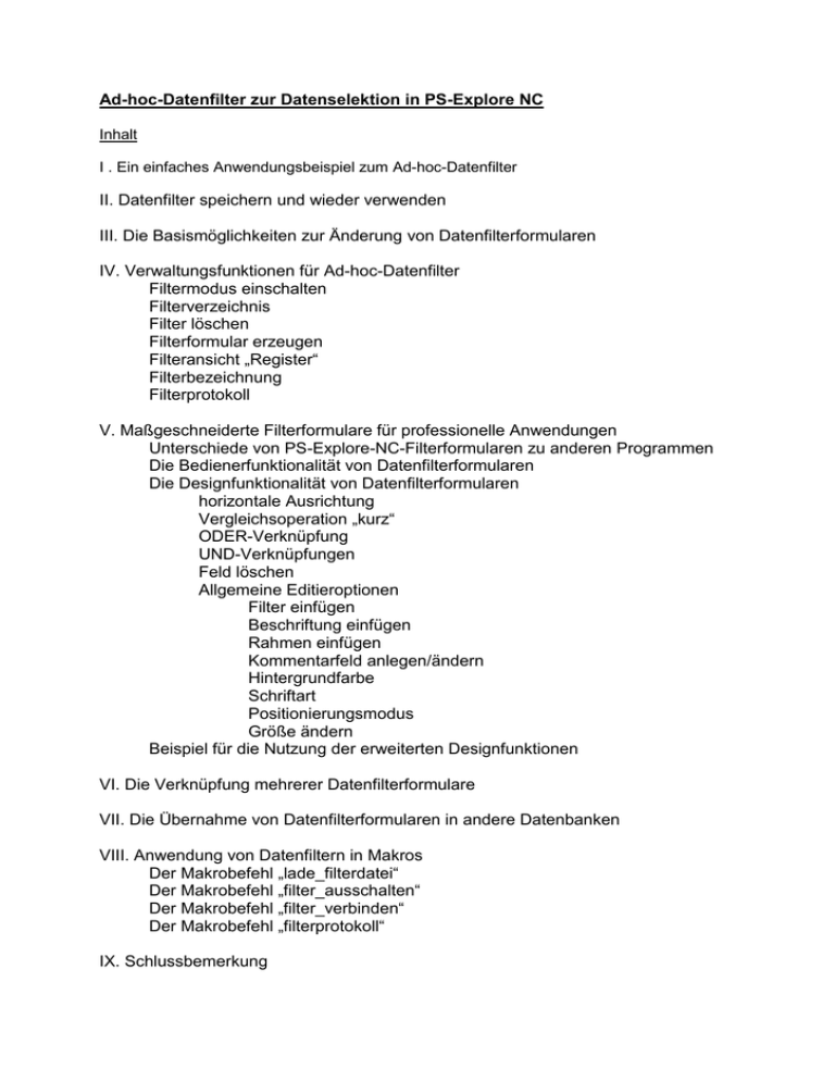 Ad-hoc-Datenfilter zur Datenselektion in PS-Explore NC Inhalt I . Ein einfaches Anwendungsbeispiel zum Ad-hoc-Datenfilter II. Datenfilter speichern und wieder verwenden III. Die Basismöglichkeiten zur Änderung von Datenfilterformularen IV. Verwaltungsfunktionen für Ad-hoc-Datenfilter Filtermodus einschalten Filterverzeichnis Filter löschen Filterformular erzeugen Filteransicht „Register“ Filterbezeichnung Filterprotokoll V. Maßgeschneiderte Filterformulare für professionelle Anwendungen Unterschiede von PS-Explore-NC-Filterformularen zu anderen Programmen Die Bedienerfunktionalität von Datenfilterformularen Die Designfunktionalität von Datenfilterformularen horizontale Ausrichtung Vergleichsoperation „kurz“ ODER-Verknüpfung UND-Verknüpfungen Feld löschen Allgemeine Editieroptionen Filter einfügen Beschriftung einfügen Rahmen einfügen Kommentarfeld anlegen/ändern Hintergrundfarbe Schriftart Positionierungsmodus Größe ändern Beispiel für die Nutzung der erweiterten Designfunktionen VI. Die Verknüpfung mehrerer Datenfilterformulare VII. Die Übernahme von Datenfilterformularen in andere Datenbanken VIII. Anwendung von Datenfiltern in Makros Der Makrobefehl „lade_filterdatei“ Der Makrobefehl „filter_ausschalten“ Der Makrobefehl „filter_verbinden“ Der Makrobefehl „filterprotokoll“ IX. Schlussbemerkung Ad-hoc-Datenfilter zur Datenselektion in PS-Explore NC Mit der aktuellen Version von PS-Explore NC (Stand 25.09.2003) steht eine völlig neue und hinsichtlich Bedienungskomfort und Effizienz sensationelle Datenselektionstechnik zur Verfügung, die es dem Anwender erlaubt wahrhaft in Windeseile über beliebige Kriterien Daten einer Datensammlung zu selektieren. Dabei können sowohl individuelle Suchstrategien benutzt werden als auch fest einstellbare Suchabläufe. Somit ist die Möglichkeit gegeben in der Praxis gerade anfallende Datenselektionen ad hoc und schrittweise auszuführen, aber auch einfache wie komplexe Abfragen auf einen Datenbestand festzulegen, die jederzeit wiederholt werden können. Es können Formulare mit Abfragebedingungen zur Selektion ohne jegliche Programmierkenntnisse in wenigen Minuten vom Anwender aufgebaut und zum Einsatz gebracht werden. Diese Selektionsformulare binden sich automatisch in die PS-Explore-NC-Oberfläche ein, so dass diese bei erneuten Selektionen direkt per Mausklick zur Verfügung stehen. Bei der Entwicklung des neuen Verfahrens wurde äußerste Sorgfalt auf eine sofortige Einsetzbarkeit in der Praxis ohne Notwendigkeit der Einarbeitung des Anwenders gelegt. Hierin ist auch der Unterschied der neuen Möglichkeiten zur Datenselektion gegenüber der bisherigen programmiersprachlichen Abfrage in der PS-Explore-NC-Makroprogrammierung. zu sehen. Gleichwohl ist es natürlich möglich einmal durchgeführte Ad-hocDatenfiltrierungen in Makros jederzeit wieder zu verwenden. I . Ein einfaches Anwendungsbeispiel zum Ad-hoc-Datenfilter Nach Programmstart findet man die Basisfunktionen der Ad-hoc-Datenfiltertechnik in der Befehlsleiste im Kopf des Eröffnungsbildschirmes sowie in der Bilddoppelleiste der Registerkarte „Arbeitsblatt“: Für die eigentliche Ad-hoc-Anwendung, d.h. das schnelle und anwendungsfreundliche Filtern von Daten, benötigt man im Prinzip nur das in der Bilddoppelleiste gezeigte links befindliche hellblaue Filter-Symbol. Wir wollen hier zunächst nur mittels der damit verbundenen Funktion ein paar Datenselektionsschritte vollziehen. Alle anderen angezeigten Funktionen werden später in entsprechendem Kontext näher erörtert. Zunächst wird eine Datenbank auf die übliche Weise in das PS-Explore-NCArbeitsblatt geladen und mit Klick auf das hellblaue Filtersymbol der sog. Filtermodus eingeschaltet. Es erscheint ein kleines Formular mit dem Titel „Ad-hoc-Datenfilter“: Zu beachten ist, dass das blaue Filtersymbol nun „versenkt“ dargestellt bleibt. Dies zeigt an, dass der Filtermodus aktiv ist. Klickt man nach mehreren Filter- und evtl. zwischengeschalteten Analyseschritten das Filtersymbol erneut an, wird das Symbol wieder „normal“ dargestellt und der Datenbestand wird wieder so hergestellt, wie er vor Aktivierung des Filtermodus war. Alle durch Filtern oder auch manuelles Löschen aus dem Arbeitsblatt entfernten Daten, stehen somit sofort wieder zur Verfügung. Das Ad-hoc-Datenfilterformular zeigt drei Schaltflächen und drei Eingabefelder an, mittels derer ein Filter eingestellt wird. Unter einem Filter versteht man hierbei die zu einer Spalte des Arbeitblattes formulierte Selektionsbedingung. Das erste Eingabefeld dient der Festlegung der Selektionsspalte. Mit Klick auf den schwarzen Abwärtspfeil des Feldes kann man eine Liste aller Felder der Datenbank bzw. aller Spalten des Arbeitsblattes öffnen. Hier lässt sich dann auch die gewünschte Spalte für den ersten Selektionsschritt auswählen. Ebenso kann man aber auch im Arbeitsblatt selbst zu der entsprechenden Spalte mit den bekannten bequemen Mitteln des Arbeitsblattes hinnavigieren. Dies ist speziell dann vorteilhaft, wenn man vor einer Filtrierung der Daten, sich diese z.B. mit den grafischen (etwa MOLAP) oder statistischen (etwa „Zellenstatistik“) Mitteln von PS-Explore NC erst noch einmal genauer anschauen möchte, um das entsprechende Merkmal auf seine Eignung für die Selektion zu untersuchen. Im nachstehenden Beispiel wurde im Ad-hoc-Datenfilterformular das Merkmal Ursprungsbaujahr eingestellt. Sofort wird automatisch die Spalte „Ursprungsbaujahr“ angesprungen. In der dritten Zeile des Datenfilterformulars wird ist der Vergleichswert für die Selektion einzustellen. Hierzu kann man in der Auswahlspalte selbst den gewünschten Wert anklicken, der dann selbsttätig vom Formular übernommen und angezeigt wird. Ebenso können Sie aber auch einen Wert im Formular eingeben und das Programm springt dann automatisch abwärts suchend in die Zeile, in der ausgehend von der aktuellen Cursorposition der eingegebene Wert gefunden 