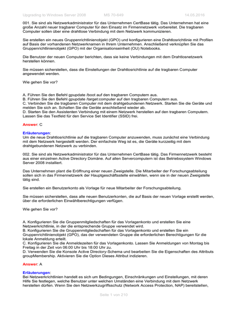001. Sie sind als Netzwerkadministrator für das Unternehmen CertBase tätig. Das Unternehmen hat eine