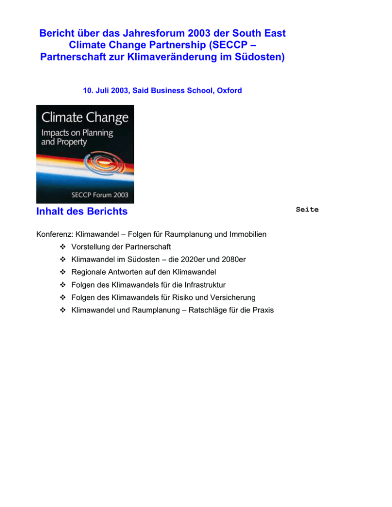 Bericht über das Jahresforum 2003 der South East Climate Change Partnership (SECCP – Partnerschaft zur Klimaveränderung im Südosten) 10. Juli 2003, Said Business School, Oxford Inhalt des Berichts Konferenz: Klimawandel – Folgen für Raumplanung und Immobilien Vorstellung der Partnerschaft Klimawandel im Südosten – die 2020er und 2080er Regionale Antworten auf den Klimawandel Folgen des Klimawandels für die Infrastruktur Folgen des Klimawandels für Risiko und Versicherung Klimawandel und Raumplanung – Ratschläge für die Praxis Seite Klimaänderung: Auswirkungen auf Bauplanung und Immobilien Die 3 Elemente der Konferenz: A. Kurze Präsentationen zu spezifischen Aspekten des Klimawandels und den Folgen für Raumplanung und Immobilien in der Region durch eingeladene Fachleute. B. Bildung von Arbeitsgruppen zu jedem Präsentationsthema, um Diskussionen der Delegierten mit den Vortragenden und/oder anderen eingeladenen Sachverständigen anzuregen. Zu jeder Gruppe gehörten ein Moderator und ein Protokollant. C. Eine abschließende Plenarsitzung zum Austausch kurzer Feedbacks der Gruppen und eine Abschlusspräsentation von unserem Präsidenten, John Craven OBE (siehe Vorwort). Zusammenfassungen der Präsentationen und der Diskussionen werden zusammen nach Themengebiet sortiert zur Verfügung gestellt. Kopien der Folien finden Sie in Anhang 5. Vorstellung der Partnerschaft Mark Goldthorpe beschrieb die zweifache Herausforderung, der wir wegen des Klimawandels gegenüber stehen: Die Eindämmung des Problems an der Wurzel durch Maßnahmen zur Reduzierung von Treibhausgasen (z. B. Einhaltung des Ziels, den Ausstoß von Kohlendioxid bis zum Jahr 2050 um 60% zu senken, wie im Energy White Paper der Regierung ausgeführt) und Änderung der Planung und des Managements unserer Aktivitäten, so dass unsere Landschaften, Küstengebiete, Auen, Wasserressourcen und Unternehmen sich anpassen und florieren können. Das Hauptaugenmerk der Partnerschaft liegt auf den Folgen und der Anpassung. Wir bekräftigen jedoch auch völlig die Notwendigkeit wirkungsvollerer Maßnahmen zur Schadensbegrenzung, und versuchen, Lösungen zu entwickeln, die beide Aspekte berücksichtigen. Die Partnerschaft geht das Problem regional an durch Förderung von adaptiver Raumplanung für die Region und ihre Bezirke. Mark Goldthorpe ist Programm-Manager der South East Climate Change Partnership und arbeitet in den SEEDA-Büros in Guildford. Er hat diesen Posten seit Oktober 2001 inne und hat mit Partnern und dem Vorstand zusammen gearbeitet, um das Arbeitsprogramm der Partnerschaft zu entwickeln. Klimawandel im Südosten – die 2020er und 2080ger Dann bereitete Dr. Chris West den Boden für die weiteren Präsentationen, indem er unser derzeitiges Wissen über den Klimawandel in der Region beschrieb. Er begann mit einer Zusammenfassung der verschiedenen Unsicherheitsfaktoren – von menschlichem Verhalten bis zu den genauen Eigenschaften der Atmosphäre und den Zusammenhängen zwischen langfristigem Klimawandel und den kurzfristigen Wetteränderungen, die wir erleben. Chris fasste die Bandbreite der KlimawandelSzenarien 2002 in Großbritannien zusammen und beendete den Vortrag mit einem Blick auf die Prognosen der Hoch- und Niedrig-Emissions-Szenarien für die Jahresdurchschnittstemperaturen der Region in den 2020ern und 2080ern. South East Climate Change Partnership: Bericht vom Jahresforum 2003 Seite 2 Klimaänderung: Auswirkungen auf Bauplanung und Immobilien Chris West ist seit März 2002 Direktor des UK Climate Impacts Programme. UKCIP hilft Organisationen, zu ermitteln, inwieweit sie vom Klimawandel betroffen sein könnten, so dass sie sich auf die Folgen vorbereiten können. Zu einem Schlüsselthema (Die Prinzipien der Anpassung an den Klimawandel) in Zusammenhang mit Chris’ Präsentation wurden zwei parallele Diskussionsgruppen gebildet. Die Zusammenfassungen beider Gruppen finden Sie im folgenden. Die Prinzipien der Anpassung an den Klimawandel- Diskussionsgruppe A Moderator: Sachverständiger: Protokollführer: Bryan Boult, Hampshire County Council Professor Nigel Arnell, Southampton University & Tyndall Centre Alan Williams, Hampshire County Council Der Moderator der Gruppe eröffnete die Sitzung mit der Frage: „Was sind die wichtigsten Punkte bei der Anpassung an den Klimawandel und wie gehen wir mit ihnen um?“ Mehrere Antworten folgten, u. a.: Verhalten/Eigentum Aufklärung Verhalten Eine Veränderung unseres Verhaltens wurde als Schlüssel zur Anpassung an die Klimawandel vorgeschlagen. Diese Verpflichtung betrifft Einzelpersonen, und mehr noch Organisationen. Mehrere Beispiele für adaptives Verhalten wurden angeführt. Es tauchte die Frage zum nötigen Ausmaß der Verhaltensänderung auf. Die Meinungen gingen dahin, dass dieses Ausmaß so groß wie möglich sein sollte, dass der Wandel in der Regierung beginnen sollte und sich dann nach unten hin ausbreitet. Es wurde jedoch eingesehen, dass dies in der Realität derzeit nicht möglich ist, aber dass es andere Wege gibt, sowohl auf regionaler als auch auf mehr lokaler Ebene. Der Sachverständige der Gruppe brachte die Frage auf: „Die meisten Organisationen verändern sich als Antwort auf so viele Dinge, warum ist das mit dem Klimawandel so anders?“ Mehrere Antworten wurden gegeben: Es handelt sich um eine Anpassung an etwas, was noch nicht passiert ist. Die „grünen“ Wertvorstellungen und das entsprechende Image werden nicht ernst genommen. Die Kurzsichtigkeit vieler Organisationen. Professor Arnell fragte noch einmal: „Was macht den Klimawandel so anders?” Antworten waren: Die Unsicherheit desselben. Sein Zeitrahmen (sehr langfristig, wenn 2080er betrachtet). Die Glaubwürdigkeit der Meinungen Dass es kurzfristig keine Gewinne gibt. Weitsicht ist erforderlich in Zusammenhang mit Klimawandel. Beispiel: Infrastruktur. Es wurde darauf verwiesen, dass die Änderung der Einstellung der Öffentlichkeit zu diesem Thema sehr viel Zeit in Ansp