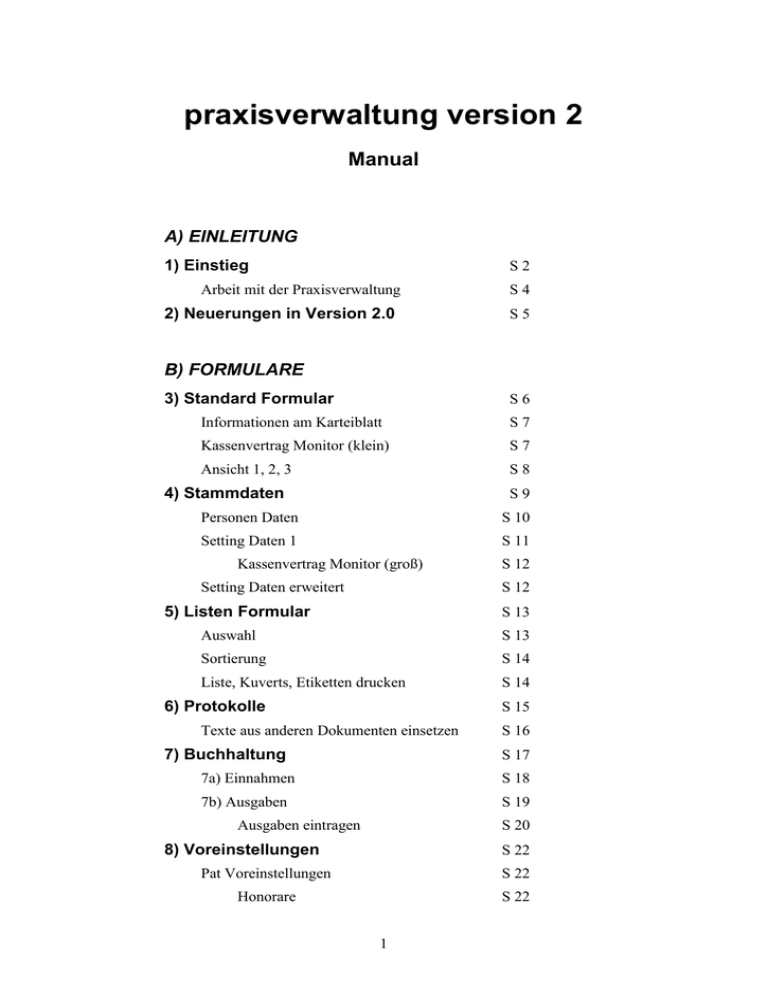 praxisverwaltung version 2 Manual A) EINLEITUNG 1) Einstieg S2 Arbeit mit der Praxisverwaltung 2) Neuerungen in Version 2.0 S4 S5 B) FORMULARE 3) Standard Formular S6 Informationen am Karteiblatt S7 Kassenvertrag Monitor (klein) S7 Ansicht 1, 2, 3 S8 4) Stammdaten S9 Personen Daten S 10 Setting Daten 1 S 11 Kassenvertrag Monitor (groß) Setting Daten erweitert S 12 S 12 5) Listen Formular S 13 Auswahl S 13 Sortierung S 14 Liste, Kuverts, Etiketten drucken S 14 6) Protokolle S 15 Texte aus anderen Dokumenten einsetzen 7) Buchhaltung S 16 S 17 7a) Einnahmen S 18 7b) Ausgaben S 19 Ausgaben eintragen S 20 8) Voreinstellungen S 22 Pat Voreinstellungen S 22 Honorare S 22 1 Allgemeine S 23 Euro-Umstellung S 24 Allg. Honorar S 26 Briefkopf S 27 Briefkopf, Stempel S 28 C) AKTIONEN 9) Klient/in –Neu, Import S 28 Klientin –Neu S 28 Setting Angaben S 29 Modus der Verarbeitung S 30 Import S 32 10) Sitzung eintragen S 33 Wechselndes Setting S 33 11) Zahlung S 35 12) Supervision S 35 13) Honorare drucken S 36 14) Kassenantrag stellen S 37 15) Briefe erstellen S 38 Einfacher Brief S 38 Serienbriefe S 39 Mahnbrief S 40 16) Vereinbarung S 40 17) Korrektur S 41 18) Klient/in oder sämtl. Einträge löschen S 41 19) Sicherheitshinweise u Sonderfälle S 42 Sicherheitshinweise S 42 Sonderfälle S 43 Klient versäumt Stunde S 43 Klientin in Einzel- und Gruppentherapie S 43 20) Häufige Fehler S 44 Bildschirm S 44 Druckfehler S 44 Rechtschreibprüfung S 46 Beschädigte Dateien S 47 2 1) Start und erster Einstieg Bitte beginnen sie hier, wenn sie noch keine Erfahrung mit dem Programm haben, und arbeiten sie dieses 1.Kapitel bis zum Ende durch. Sie ersparen sich viel Rätselraten, wenn sie die grundlegenden Funktionen hier einmal mit Anleitung durchprobiert haben. Sie starten durch Doppelklicken in die Datei praxis25 Unter Windows: Startmenü Programme – Praxisverwaltung2.5 - praxis25 anklicken. Oder direkt auf praxis25 (nur bei 32 Bit). Auf Apple: Ordner Praxisverwaltung 2.5 auf Festplatte, dort wieder praxisv (doppelklicken) oder schneller: Alias praxis25 am Schreibtisch oder im Applemenü. Wenn sie die Praxisverwaltung eben neu installiert haben, müssen sie beim ersten Einstieg zur Initialisierung der Vollversion ihre Seriennnummer und ihren vollen Namen, auf den ihre Version personalisiert wurde, angeben. Beides, die Seriennummer und den Namen (wie sie ihn bei der Bestellung angegeben haben), finden sie in den Begleitpapieren. Wenn sie bei der ersten Abfrage „Demo“ wählen, öffnen sie die Demoversion für die sie keine Seriennummer brauchen. Verwenden sie nun als erstes die On-line Einführung, indem sie auf INTRO (links oben) klicken. Sie werden automatisch durch viele Funktionen dieses Programms geführt. Anmerkung zur Programmoberfläche: Aus programmier-technischen Gründen, war es nötig die Oberfläche so anzulegen, dass Sie die Programmfenster mit den entsprechenden Rahmen und oben einige Menübefehle sehen. Verwenden sie die Schaltflächen in den diversen Fensterrahmen nicht und auch die Befehle der Menüs am oberen Bildschirmrand nach Möglichkeit nicht (außer es wird ausdrücklich darauf verwiesen, wie etwa bei Textlineal) Grundsätzlich befinden sich alle nötigen Schaltflächen und Tasten innerhalb des Programmfensters. Am Beginn wird der Bereich für das Fenster durch zwei Symbolleisten verkleinert, die sei nicht brauchen. Sie können diese ausschalten: Oben, Menü „Ansicht“: Statusleiste deaktivieren und Funktionsleisten > Standard deaktivieren. Beim nächsten Start des Programms nützt das Programm den gewonnenen Platz aus!! Für einen ersten Einstieg können sie dann die beiden fiktiven Klienten benutzen, die schon eingegeben sind. Sie können dabei spielerisch Beliebiges ausprobieren. Wenn sie genug experimentiert haben, können sie sämtliche Einträge, die zu den „Probeklienten/innen“ gehören, wieder löschen. Nach dem Start befinden sie sich in der Patienten/Klienten-Kartei und zwar im Formular Liste, einer listenförmigen Darstellung ihre Klienten/innen. Zuerst sehen sie die einfache Liste, wo sie bei jeden Klienten die Tel.Nr., die Felder “aktiv/Reihenfolge” (z.B. Montag 15h00), den Modus der Verarbeitung (kk, kkV, usw. Erklärung später) sehen. Sie können umschalten auf ausführliche Liste und bekommen dann noch weitere Angaben, wie z.B. den offenen Betrag und die Daten von der Kassenbewilligung, angezeigt. Mit den Pfeilen können sie sich von einem zum anderen Klienten bewegen (bei welchem sie sich gerade befinden sehen sie an der dunklen balkenförmigen Marke links außen). Sie können aber auch direkt in den Bereich eines/r Klienten/in (am besten auf seinen/ihren Namen) klicken um sie /ihn auszuwählen. Wenn sie dann auf die Taste „Standard“ (oben links) klicken, kommen sie zum Standard Formular und finden das Karteiblatt des ausgewählten Klienten aufgeschlagen. Sie haben hier für jede/n Klientin/en ein Karteiblatt (= Bildschirm). Oben befinden sich verschiedene Tasten, mit denen sie bestimmte Aktionen, wie z.B. Sitzung eintragen und ähnliches veranlassen können. 3 Im Standard-Formular können sie nun einfach eine Sitzung eintragen, indem sie die entsprechende Taste klicken. Ebenso eine Zahlung oder eine Supervisionsstunde eintragen. Weiters können sie eine Honorarnote ausstellen, oder einen Krankenkassen-Antrag erstellen. Mit der Taste „Stammd.“ (= Stammdaten) kommen sie in ein weiters zu diesem/r Klienten/in gehöriges Karteiblatt, das alle wesentlichen Daten enthält. Mit der Protokoll-Taste gelangen sie in den Protokollbereich. Dort können sie sofort mit dem Eintippen eines Protokolls beginnen. In dieser Aufstellung ist für jeden Sitzungs- und Supervisionseintrag ein Protokoll vorgesehen. Sie können mit den Pfeiltasten durch die Protokolle navigieren. Die Taste Buchhaltung bringt sie in den Buchhaltungsbereich. Dort finden sie eine Liste der bisher erfolgten Einnahmen und eine Tabelle, in die sie ihre Ausgaben eintragen können. Um sich