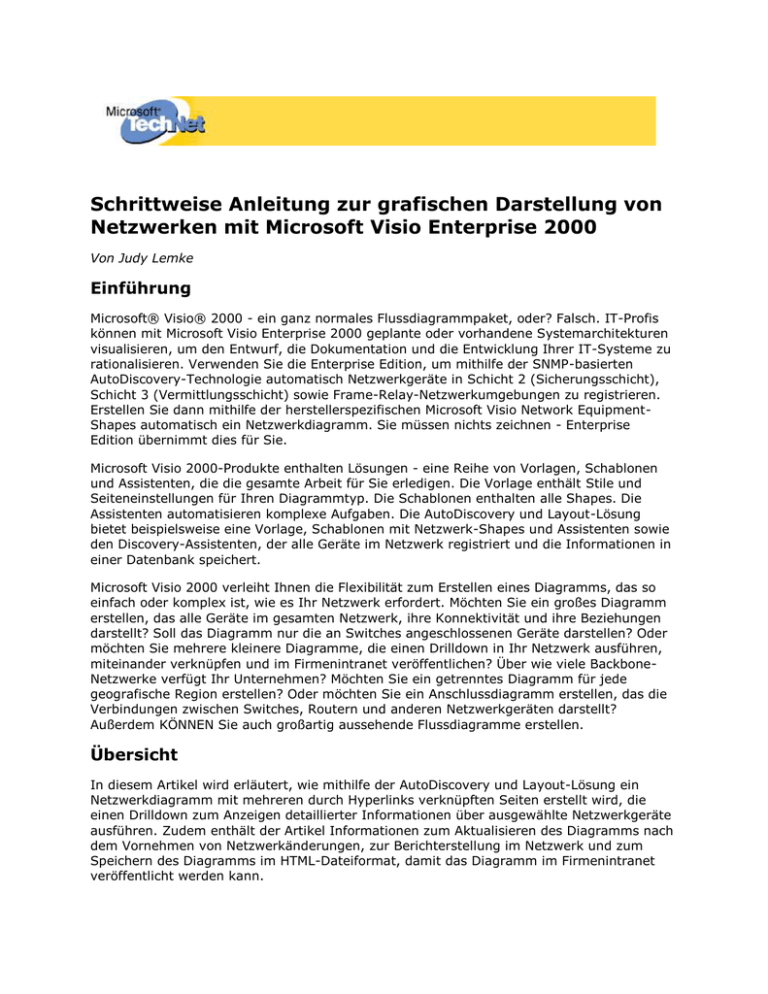 Schrittweise Anleitung zur grafischen Darstellung von Netzwerken mit Microsoft Visio Enterprise 2000 Von Judy Lemke Einführung Microsoft® Visio® 2000 - ein ganz normales Flussdiagrammpaket, oder? Falsch. IT-Profis können mit Microsoft Visio Enterprise 2000 geplante oder vorhandene Systemarchitekturen visualisieren, um den Entwurf, die Dokumentation und die Entwicklung Ihrer IT-Systeme zu rationalisieren. Verwenden Sie die Enterprise Edition, um mithilfe der SNMP-basierten AutoDiscovery-Technologie automatisch Netzwerkgeräte in Schicht 2 (Sicherungsschicht), Schicht 3 (Vermittlungsschicht) sowie Frame-Relay-Netzwerkumgebungen zu registrieren. Erstellen Sie dann mithilfe der herstellerspezifischen Microsoft Visio Network EquipmentShapes automatisch ein Netzwerkdiagramm. Sie müssen nichts zeichnen - Enterprise Edition übernimmt dies für Sie. Microsoft Visio 2000-Produkte enthalten Lösungen - eine Reihe von Vorlagen, Schablonen und Assistenten, die die gesamte Arbeit für Sie erledigen. Die Vorlage enthält Stile und Seiteneinstellungen für Ihren Diagrammtyp. Die Schablonen enthalten alle Shapes. Die Assistenten automatisieren komplexe Aufgaben. Die AutoDiscovery und Layout-Lösung bietet beispielsweise eine Vorlage, Schablonen mit Netzwerk-Shapes und Assistenten sowie den Discovery-Assistenten, der alle Geräte im Netzwerk registriert und die Informationen in einer Datenbank speichert. Microsoft Visio 2000 verleiht Ihnen die Flexibilität zum Erstellen eines Diagramms, das so einfach oder komplex ist, wie es Ihr Netzwerk erfordert. Möchten Sie ein großes Diagramm erstellen, das alle Geräte im gesamten Netzwerk, ihre Konnektivität und ihre Beziehungen darstellt? Soll das Diagramm nur die an Switches angeschlossenen Geräte darstellen? Oder möchten Sie mehrere kleinere Diagramme, die einen Drilldown in Ihr Netzwerk ausführen, miteinander verknüpfen und im Firmenintranet veröffentlichen? Über wie viele BackboneNetzwerke verfügt Ihr Unternehmen? Möchten Sie ein getrenntes Diagramm für jede geografische Region erstellen? Oder möchten Sie ein Anschlussdiagramm erstellen, das die Verbindungen zwischen Switches, Routern und anderen Netzwerkgeräten darstellt? Außerdem KÖNNEN Sie auch großartig aussehende Flussdiagramme erstellen. Übersicht In diesem Artikel wird erläutert, wie mithilfe der AutoDiscovery und Layout-Lösung ein Netzwerkdiagramm mit mehreren durch Hyperlinks verknüpften Seiten erstellt wird, die einen Drilldown zum Anzeigen detaillierter Informationen über ausgewählte Netzwerkgeräte ausführen. Zudem enthält der Artikel Informationen zum Aktualisieren des Diagramms nach dem Vornehmen von Netzwerkänderungen, zur Berichterstellung im Netzwerk und zum Speichern des Diagramms im HTML-Dateiformat, damit das Diagramm im Firmenintranet veröffentlicht werden kann. Der erste Schritt bei der grafischen Darstellung Ihres Netzwerks besteht in der Registrierung des Netzwerks. Dazu öffnen Sie die Vorlage AutoDiscovery und Layout und führen den Discovery-Assistenten zum Erstellen einer Datenbank aus, in der Informationen zu Ihrem Netzwerk gespeichert werden. Anschließend können Sie mithilfe der Symbolleiste AutoDiscovery und Layout Ihre Zeichnung erstellen oder mit dem Feature Automatisches Layout die Datenbank lesen und das Diagramm automatisch anlegen. Nach dem Anlegen des Diagramms können Sie einen Bericht zu den Daten in Ihrer Netzwerkdatenbank ausführen. Schließlich können Sie das Diagramm gemeinsam mit anderen Personen nutzen, indem Sie das Diagramm drucken oder im HTML-Dateiformat speichern und anschließend im Firmenintranet veröffentlichen. Schritt 1: Registrieren der Geräte im Netzwerk Mithilfe der vom Discovery-Assistenten verwendeten AutoDiscovery-Technologie wird das Netzwerk durchsucht und eine Datenbank der im Netzwerk gefundenen Schicht-2- und Schicht-3-Geräte erstellt. Auch Informationen zu den einzelnen Geräten werden gesammelt und in die Datenbank eingefügt, z. B. der Netzwerkname, die IP-Adresse, das Betriebssystem und der Hersteller des Geräts sowie der vom Gerät verwendete SNMPCommunity-String und Informationen zur Schnittstelle. Sie können die Discovery-Funktion so anpasssen, dass nur spezielle Netzwerke oder Geräte oder alle Geräte in beliebig vielen Netzwerken registriert werden. Wie lange dauert die Discovery-Funktion? Kein Netzwerk ist wie das andere. Daher kann nur schwer angegeben werden, wie lange es dauert, das Netzwerk zu registrieren. Der Vorgang kann für ein kleines Netzwerk nur wenige Minuten, für ein großes Netzwerk jedoch bis zu mehreren Stunden dauern. Beispielsweise könnte es 12 Stunden dauern, ein Netzwerk mit 200 Routern zu registrieren. Die folgenden Faktoren können Ihnen beim Optimieren des Prozesses helfen: Berücksichtigen Sie die Anzahl der Geräte, nach denen der DiscoveryAssistent suchen muss. Beim Auswählen der Optionen im Discovery-Assistenten sollten Sie bedenken, dass der Abschluss der Registrierung mit zunehmender Anzahl der ausgewählten Optionen (wie den zu registrierenden Gerätetypen und der Anzahl der Netzwerke) umso länger dauert. Überprüfen Sie die Timeout- und Wiederholungseinstellungen. Sie können festlegen, wie lange das Discovery-Modul vor dem Timeout warten soll, wenn ein Gerät nicht auf einen Ping oder eine SNMP-Anforderung reagiert, und wie oft die Anforderung wiederholt werden soll. Wenn Sie beispielsweise über mehrere Geräte verfügen, die nicht auf SNMP-Anforderungen reagieren, sollten Sie den Wert im SNMP-Timeoutfeld verringern. Berücksichtigen Sie Verbindungsgeschwindigkeiten. Wenn Sie z. B. über eine WAN-Verbindung mit einer Remoteabteilung verbunden sind, verläuft der Paketaustausch langsamer. Möglicherweise möchten Sie die Geräte in RemoteTeilnetzen vom zu registrierenden Netzwerk ausschließen. Sie können auch die Anzahl der SNMP-Wiederholungsversuche und -Timeouts erhöhen. So öffnen Sie die Vorlage AutoDiscovery und Layout: 1. Starten Sie Microsoft V