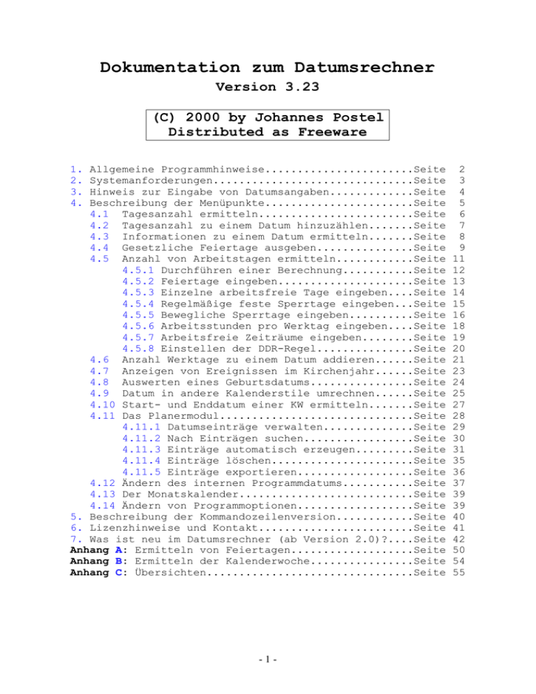 Dokumentation zum Datumsrechner Version 3.23 (C) 2000 by Johannes Postel Distributed as Freeware 1. 2. 3. 4. Allgemeine Programmhinweise.......................Seite Systemanforderungen...............................Seite Hinweis zur Eingabe von Datumsangaben.............Seite Beschreibung der Menüpunkte.......................Seite 4.1 Tagesanzahl ermitteln........................Seite 4.2 Tagesanzahl zu einem Datum hinzuzählen.......Seite 4.3 Informationen zu einem Datum ermitteln.......Seite 4.4 Gesetzliche Feiertage ausgeben...............Seite 4.5 Anzahl von Arbeitstagen ermitteln............Seite 4.5.1 Durchführen einer Berechnung...........Seite 4.5.2 Feiertage eingeben.....................Seite 4.5.3 Einzelne arbeitsfreie Tage eingeben....Seite 4.5.4 Regelmäßige feste Sperrtage eingeben...Seite 4.5.5 Bewegliche Sperrtage eingeben..........Seite 4.5.6 Arbeitsstunden pro Werktag eingeben....Seite 4.5.7 Arbeitsfreie Zeiträume eingeben........Seite 4.5.8 Einstellen der DDR-Regel...............Seite 4.6 Anzahl Werktage zu einem Datum addieren......Seite 4.7 Anzeigen von Ereignissen im Kirchenjahr......Seite 4.8 Auswerten eines Geburtsdatums................Seite 4.9 Datum in andere Kalenderstile umrechnen......Seite 4.10 Start- und Enddatum einer KW ermitteln.......Seite 4.11 Das Planermodul..............................Seite 4.11.1 Datumseinträge verwalten..............Seite 4.11.2 Nach Einträgen suchen.................Seite 4.11.3 Einträge automatisch erzeugen.........Seite 4.11.4 Einträge löschen......................Seite 4.11.5 Einträge exportieren..................Seite 4.12 Ändern des internen Programmdatums...........Seite 4.13 Der Monatskalender...........................Seite 4.14 Ändern von Programmoptionen..................Seite 5. Beschreibung der Kommandozeilenversion............Seite 6. Lizenzhinweise und Kontakt........................Seite 7. Was ist neu im Datumsrechner (ab Version 2.0)?....Seite Anhang A: Ermitteln von Feiertagen...................Seite Anhang B: Ermitteln der Kalenderwoche................Seite Anhang C: Übersichten................................Seite -1- 2 3 4 5 6 7 8 9 11 12 13 14 15 16 18 19 20 21 23 24 25 27 28 29 30 31 35 36 37 39 39 40 41 42 50 54 55 1. Allgemeine Programmhinweise Der Datumsrechner ist ein Konsolenprogramm für MS-DOS und alle Versionen von Microsoft Windows, einschließlich Windows XP. Er ermöglicht vielfältige der sonst schwierig durchzuführenden Rechnungen mit Datumsangaben, z. B. das Ermitteln der Tagesanzahl zwischen zwei Datumsangaben, das Hinzuzählen oder Abziehen einer Tagesanzahl zu einem Datum und das Errechnen des Wochentages eines bestimmten Datums. Außerdem unterstützt der Datumsrechner komplexere datumsrelevante Berechnungen, wie etwa das Ermitteln von Feiertagen und Kirchenereignissen eines Jahres und die Berechnung der Anzahl von Arbeitstagen innerhalb zweier Datumsangaben. Aufgrund des schlichten Designs ist der Datumsrechner klein, systemstabil und schnell. Hinweis 1: Zur besseren Darstellung in der DOS-Konsole von Windows NT, Windows 2000 und Windows XP schaltet das Programm dort automatisch in den Vollbildmodus, unabhängig von den Einstellungen im Fächer "Bildschirm" der Verknüpung. Dieser kann bei Bedarf durch Drücken von [ALT] + [TAB] verlassen werden. Um das automatische Umschalten in den Vollbildmodus zu verhindern, muss das Programm mit dem Kommandozeilenparameter "/" (ohne die "") gestartet werden. Unter Windows muss dazu eine entsprechende Verknüpfung angelegt werden: Abbildung 1: Anlegen einer Verknüpfung, die den Datumsrechner nicht im Vollbildmodus startet -2- Hinweis 2: Es ist auf Windows-Systemen nicht erforderlich, auch nicht unter Windows XP, das Programm in einem DOS-Emulator, wie etwa DOSBox, laufen zu lassen. Dies setzt lediglich die Programm-Performance drastisch herab und bietet keinerlei positiven Effekt. Wenn ein Emulator erkannt wird, bietet der Datumsrechner nur die Kommandozeilenversion (siehe 5.) an, es sei denn, das Programm wurde mit dem Parameter / gestartet. 2. Systemanforderungen Obwohl stets auf Kompatibilität zu aktuellen Versionen von Microsoft Windows geachtet wurde, handelt es sich beim Datumsrechner um ein reines DOS-Programm. Die Anforderungen sind daher für heutige Rechner als sehr gering einzustufen. Jeder Rechner, auf dem eine Version von Microsoft Windows 95 oder später problemlos läuft, sollte keine Schwierigkeiten mit dem Datumsrechner haben. Vom Starten des Programms in einem DOS-Emulator wird ausdrücklich abgeraten. Lediglich zur Nutzung des Programms unter Linux wäre eine Emulation sinnvoll. -3- 3. Hinweis zur Eingabe von Datumsangaben An vielen Stellen innerhalb des Programms müssen Datumsangaben als Parameter für Berechnungen eingegeben werden. Datumsangaben müssen immer im Format TT.MM.JJJJ erfasst werden, d.h. führende Nullen müssen gesetzt werden, so dass die Eingabe (inklusive der Punkte) genau 10-stellig ist. Es werden nur existierende Datumsangaben in diesem Format zugelassen, andere Eingaben akzeptiert das Programm nicht. Es wird bei der Eingabe berücksichtigt, dass infolge des Kalenderwechsels bestimmte Datumsangaben nicht existieren, beispielsweise "07.10.1582". Standardmäßig ist in den Optionen (siehe 4.14) der Eintrag "Spezialfunktionen im Datumseingabefeld aktiv" aktiviert. Das bedeutet, dass bei der Eingabe eines Datums folgende Tasten aktiv sind: [Cursor Auf] = Einen Tag vor [Cursor Ab] = Einen Tag zurück [Cursor Rechts] = 30 Tage vor [Cursor Links] = 30 Tage zurück [Bild Auf] = 365 Tage vor [Bild Ab] = 365 Tage zurück [Pos 1] = heutiges Datum Außerdem kann mit der [ENTER]-Taste der bereits eingegebene Teil eines Datums mit dem restlichen Teil des heutigen Datums ergänzt werden. Beispiel: Heute ist der 31.12.1999. Wenn Sie nur "03" eingeben und die [ENTER]-Taste betätigen, so nimmt das Programm an, dass 03.12.1999 verwendendet werden soll. Wurde nur eine zweistellige anstatt der geforderten vierstellig