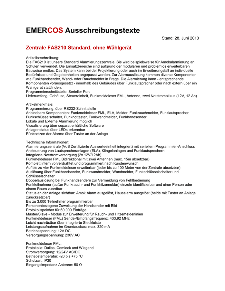 EMERCOS Ausschreibungstexte Stand: 28. Juni 2013 Zentrale FAS210 Standard, ohne Wählgerät Artikelbeschreibung: Die FAS210 ist unsere Standard Alarmierungszentrale. Sie wird beispielsweise für Amokalarmierung an Schulen verwendet. Die Einsatzbereiche sind aufgrund der modularen und problemlos erweiterbaren Bauweise endlos. Das System kann bei der Projektierung oder auch im Erweiterungsfall an individuelle Bedürfnisse und Gegebenheiten angepasst werden. Zur Alarmauslösung kommen diverse Komponenten wie Funkhandsender, Wand- oder Rauchmelder in Frage. Die Alarmierung kann - entsprechende Komponenten vorausgesetzt - innerhalb des Gebäudes über Funklautsprecher oder nach extern über ein Wählgerät stattfinden. Programmierschnittstelle: Serieller Port Lieferumfang: Gehäuse, Steuereinheit, Funkmeldeleser FML, Antenne, zwei Notstromakkus (12V, 12 Ah) Artikelmerkmale: Programmierung: über RS232-Schnittstelle Anbindbare Komponenten: Funkmeldeleser FML, ELA, Melder, Funkrauchmelder, Funklautsprecher, Funkschlüsselschalter, Funknottaster, Funkwandmelder, Funkhandsender Lokale und Externe Alarmierung möglich Visualisierung über separat erhältliche Software Anlagenstatus über LEDs erkennbar Rücksetzen der Alarme über Taster an der Anlage Technische Informationen: Alarmierungszentrale (VdS Zertifizierte Auswerteeinheit integriert) mit seriellem Programmier-Anschluss Ansteuerung von Lautsprecheranlagen (ELA), Klingelanlagen und Funklautsprechern Integrierte Notstromversorgung (2x 12V/12Ah) Funkmeldeleser FML Bidirektional mit zwei Antennen (max. 15m absetzbar) Komplett intern vorverdrahtet und programmiert nach Kundenwunsch Auf bis zu vier Funkmeldeleser erweiterbar (jeder bis zu 100 Meter von der Zentrale absetzbar) Auslösung über Funkhandsender, Funkwandmelder, Wandmelder, Funkschlüsselschalter und Schlüsselschalter Doppelauslösung bei Funkhandsendern zur Vermeidung von Fehlbedienung Funkteilnehmer (außer Funkrauch- und Funkhitzemelder) einzeln identifizierbar und einer Person oder einem Raum zuordbar Status an der Anlage sichtbar: Amok Alarm ausgelöst, Hausalarm ausgelöst (beide mit Taster an Anlage zurücksetzbar) Bis zu 3.000 Teilnehmer programmierbar Personenbezogene Zuweisung der Handsender mit Bild Protokollspeicher für 60.000 Einträge Master/Slave - Modus zur Erweiterung für Rauch- und Hitzemelderlinien Funkmeldeleser (FML) Sende-/Empfangsfrequenz: 433,92 MHz Leicht nachrüstbar über integrierte Steckleiste Leistungsaufnahme im Grundausbau: max. 320 mA Betriebsspannung: 12V DC Versorgungsspannung: 230V AC Funkmeldeleser FML: Protokolle: Dallas, Comlock und Wiegand Stromversorgung: 12/24V AC/DC Betriebstemperatur: -20 bis +75 °C Schutzart: IP30 Eingangsimpedanz Antenne: 50 Ω Stromaufnahme: 45 mA Frequenz: 433,92 MHz +/- 10 kHz Ansprechempfindlichkeit: -110 dBm 0,7 μV Selektivität: ±43 kHz Modulation: FSK Modulation mit Delta-F: 10 kHz Scheinstrahlungsleistung: -10...-7 dBm (100-200 μW) Scheinleistung der harmonischen Produkte: <-54 dBm (4 nW) Dekodierungsart: Rolling Code Kodierung: 128 bit Lieferumfang: Komplette Anlage inklusive Netzteil, Notstromakkus, Funkmeldeleser FML, Antenne, ohne Wählgerät Maße: 330 x 390 x 170 mm Farbe: Weiss, RAL 9016 Artikelnummer: ZE-FAS210-STD-OW Fabrikat: EMERCOS Zentrale FAS210 Netzwerk, ohne Wählgerät Artikelbeschreibung: Die FAS210 ist unsere Standard Alarmierungszentrale. Sie wird beispielsweise für Amokalarmierung an Schulen verwendet. Die Einsatzbereiche sind aufgrund der modularen und problemlos erweiterbaren Bauweise endlos. Das System kann bei der Projektierung oder auch im Erweiterungsfall an individuelle Bedürfnisse und Gegebenheiten angepasst werden. Zur Alarmauslösung kommen diverse Komponenten wie Funkhandsender, Wand- oder Rauchmelder in Frage. Die Alarmierung kann - entsprechende Komponenten vorausgesetzt - innerhalb des Gebäudes über Funklautsprecher oder nach extern über ein Wählgerät stattfinden. Programmierschnittstelle: Netzwerk Lieferumfang: Gehäuse, Steuereinheit, Funkmeldeleser FML, Antenne, zwei Notstromakkus (12V, 12 Ah) Artikelmerkmale: Programmierung: über Netzwerk-Schnittstelle Anbindbare Komponenten: Funkmeldeleser FML, ELA, Melder, Funkrauchmelder, Funklautsprecher, Funkschlüsselschalter, Funknottaster, Funkwandmelder, Funkhandsender Lokale und Externe Alarmierung möglich Visualisierung über separat erhältliche Software Anlagenstatus über LEDs erkennbar Rücksetzen der Alarme über Taster an der Anlage Technische Informationen: Alarmierungszentrale (VdS Zertifizierte Auswerteeinheit integriert) Programmier-Anschluss über Netzwerk Ansteuerung von Lautsprecheranlagen (ELA), Klingelanlagen und Funklautsprechern Integrierte Notstromversorgung (2x 12V/12Ah) Funkmeldeleser FML Bidirektional mit zwei Antennen (max. 15m absetzbar) Komplett intern vorverdrahtet und programmiert nach Kundenwunsch Auf bis zu vier Funkmeldeleser FML erweiterbar (jeder bis zu 100 Meter von der Zentrale absetzbar) Auslösung über Funkhandsender, Funkwandmelder, Wandmelder, Funkschlüsselschalter und Schlüsselschalter Doppelauslösung bei Funkhandsendern zur Vermeidung von Fehlbedienung Funkteilnehmer (außer Funkrauch- und Funkhitzemelder) einzeln identifizierbar und einer Person oder einem Raum zuordbar Status an der Anlage sichtbar: Amok Alarm ausgelöst, Hausalarm ausgelöst (beide mit Taster an Anlage zurücksetzbar) Bis zu 3.000 Teilnehmer programmierbar Personenbezogene Zuweisung der Handsender mit Bild Protokollspeicher für 60.000 Einträge Master/Slave - Modus zur Erweiterung für Rauch- und Hitzemelderlinien Funkmeldeleser (FML) Sende-/Empfangsfrequenz: 433,92 MHz Leicht nachrüstbar über integrierte Steckleiste Leistungsaufnahme im Grundausbau: max. 320 mA Betriebsspannung: 12V DC Versorgungsspannung: 230V AC Funkmeldeleser FML: Protokolle: Dallas, Comlock und Wiegand Stromversorgung: 12/24V AC/DC Betriebstemperatur: -20 bis +75 °C Schutzart: IP30 Eingangsimpedanz Antenne: 50 Ω Stromaufnahme: