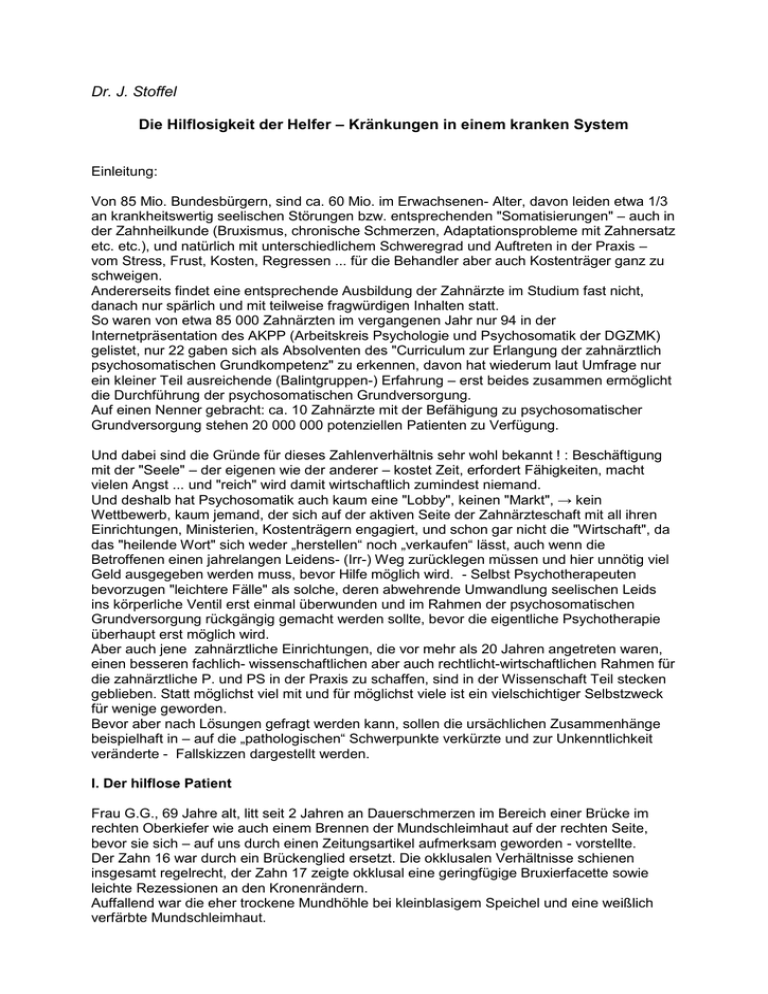 Dr. J. Stoffel Die Hilflosigkeit der Helfer – Kränkungen in einem kranken System Einleitung: Von 85 Mio. Bundesbürgern, sind ca. 60 Mio. im Erwachsenen- Alter, davon leiden etwa 1/3 an krankheitswertig seelischen Störungen bzw. entsprechenden "Somatisierungen" – auch in der Zahnheilkunde (Bruxismus, chronische Schmerzen, Adaptationsprobleme mit Zahnersatz etc. etc.), und natürlich mit unterschiedlichem Schweregrad und Auftreten in der Praxis – vom Stress, Frust, Kosten, Regressen ... für die Behandler aber auch Kostenträger ganz zu schweigen. Andererseits findet eine entsprechende Ausbildung der Zahnärzte im Studium fast nicht, danach nur spärlich und mit teilweise fragwürdigen Inhalten statt. So waren von etwa 85 000 Zahnärzten im vergangenen Jahr nur 94 in der Internetpräsentation des AKPP (Arbeitskreis Psychologie und Psychosomatik der DGZMK) gelistet, nur 22 gaben sich als Absolventen des "Curriculum zur Erlangung der zahnärztlich psychosomatischen Grundkompetenz" zu erkennen, davon hat wiederum laut Umfrage nur ein kleiner Teil ausreichende (Balintgruppen-) Erfahrung – erst beides zusammen ermöglicht die Durchführung der psychosomatischen Grundversorgung. Auf einen Nenner gebracht: ca. 10 Zahnärzte mit der Befähigung zu psychosomatischer Grundversorgung stehen 20 000 000 potenziellen Patienten zu Verfügung. Und dabei sind die Gründe für dieses Zahlenverhältnis sehr wohl bekannt ! : Beschäftigung mit der "Seele" – der eigenen wie der anderer – kostet Zeit, erfordert Fähigkeiten, macht vielen Angst ... und "reich" wird damit wirtschaftlich zumindest niemand. Und deshalb hat Psychosomatik auch kaum eine "Lobby", keinen "Markt", → kein Wettbewerb, kaum jemand, der sich auf der aktiven Seite der Zahnärzteschaft mit all ihren Einrichtungen, Ministerien, Kostenträgern engagiert, und schon gar nicht die "Wirtschaft", da das "heilende Wort" sich weder „herstellen“ noch „verkaufen“ lässt, auch wenn die Betroffenen einen jahrelangen Leidens- (Irr-) Weg zurücklegen müssen und hier unnötig viel Geld ausgegeben werden muss, bevor Hilfe möglich wird. - Selbst Psychotherapeuten bevorzugen "leichtere Fälle" als solche, deren abwehrende Umwandlung seelischen Leids ins körperliche Ventil erst einmal überwunden und im Rahmen der psychosomatischen Grundversorgung rückgängig gemacht werden sollte, bevor die eigentliche Psychotherapie überhaupt erst möglich wird. Aber auch jene zahnärztliche Einrichtungen, die vor mehr als 20 Jahren angetreten waren, einen besseren fachlich- wissenschaftlichen aber auch rechtlicht-wirtschaftlichen Rahmen für die zahnärztliche P. und PS in der Praxis zu schaffen, sind in der Wissenschaft Teil stecken geblieben. Statt möglichst viel mit und für möglichst viele ist ein vielschichtiger Selbstzweck für wenige geworden. Bevor aber nach Lösungen gefragt werden kann, sollen die ursächlichen Zusammenhänge beispielhaft in – auf die „pathologischen“ Schwerpunkte verkürzte und zur Unkenntlichkeit veränderte - Fallskizzen dargestellt werden. I. Der hilflose Patient Frau G.G., 69 Jahre alt, litt seit 2 Jahren an Dauerschmerzen im Bereich einer Brücke im rechten Oberkiefer wie auch einem Brennen der Mundschleimhaut auf der rechten Seite, bevor sie sich – auf uns durch einen Zeitungsartikel aufmerksam geworden - vorstellte. Der Zahn 16 war durch ein Brückenglied ersetzt. Die okklusalen Verhältnisse schienen insgesamt regelrecht, der Zahn 17 zeigte okklusal eine geringfügige Bruxierfacette sowie leichte Rezessionen an den Kronenrändern. Auffallend war die eher trockene Mundhöhle bei kleinblasigem Speichel und eine weißlich verfärbte Mundschleimhaut. Allgemeingesundheitlich wurde ein auf die Mundhöhle beschränkter Lichen ruber mucosae nachgewiesen. Bildhaft, zuweilen dramatisch mit leicht agitiert- depressiver Tönung schilderte die Patientin die Beschwerden im Rahmen der Bio-psycho-sozialen Anamneseerhebung: Schon nach der Abformung für die neue Brücke (2001) sei der ganze Mund weiß gewesen. Nach IP- Maßnahmen hätten sich Blutergüsse gezeigt. Auch die Anwendung von Interdentalbürsten und Zahnseide sei "furchtbar" unangenehm. Die allergologische Testung sei ohne Befund geblieben. Sie habe anfangs jeden 2. Tag Voltaren genommen, dies aber abgesetzt, weil es nichts gebracht habe, zur Zeit nehme sie nur Bepanthen wegen Brennen, weil sie sonst nicht schlafen könne, die Mundschleimhaut sei "ziemlich mitgenommen". Beim Trinken kalter Flüssigkeiten habe sie Schmerzen, im Bereich der rechten OK- Brücke einen Dauerschmerz, saures brennt nur rechts "als wäre Feuer eingeschlossen bis wo das Gold aufhört". Die Brücke habe sie noch nie leiden können, sie sei zu groß, zu breit, zu eng, sie habe sich immer auf die Wange gebissen. Der Zahn 17 habe sich "nach vorne geneigt, "er fühle sich eingesperrt" – "ich mag den Zahn nicht". Aus der Sicht der Patientin ließen sich letztlich alle Beschwerden auf die "unpassende" Brücke im rechten OK zurückführen, wobei das Mundbrennen auch mit Wetterfühligkeit und möglicher Beeinflussung durch Strahlen (via neues Telefon) in Verbindung gebracht wurde. In der weiter zurückgreifenden psychischen Anamnese schildert Frau G.G. ihre Lebensgeschichte als unproblematisch – mit einem besonders guten Verhältnis zum Vater. Ihren 12 Jahre älteren Mann habe sie früh geheiratet, anfangs sei sie in der Ehe eher unglücklich gewesen, aber er habe alles für sie getan, sie habe sich auch von ihm abhängig gefühlt. In letzter Zeit aber habe sie immer Enttäuschungen erlebt: Nach der Aufgabe einer gemeinsam betriebenen Fremdenpension erkrankte der Mann an Alzheimer-Demenz und verstarb vor 1 ½ Jahren infolge einer Infektion nach Darmspiegelung. - Aber die Ärzte hätten Ihr alle nicht zu gehört. "Dies machte alle gemeinsamen Erwartungen auf einen schönen Lebensabend zunichte". Auf die Frage, wie sie sich da gefühlt habe, sagte sie: "Ich habe nie Depressionen – Ich wa