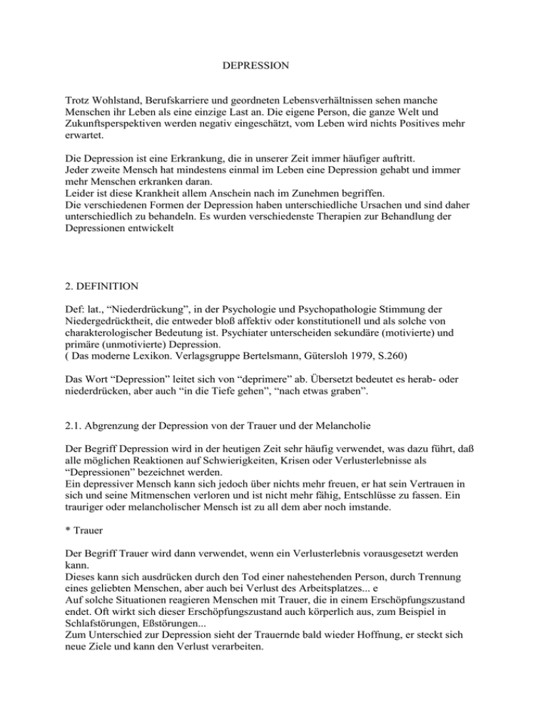 DEPRESSION Trotz Wohlstand, Berufskarriere und geordneten Lebensverhältnissen sehen manche Menschen ihr Leben als eine einzige Last an. Die eigene Person, die ganze Welt und Zukunftsperspektiven werden negativ eingeschätzt, vom Leben wird nichts Positives mehr erwartet. Die Depression ist eine Erkrankung, die in unserer Zeit immer häufiger auftritt. Jeder zweite Mensch hat mindestens einmal im Leben eine Depression gehabt und immer mehr Menschen erkranken daran. Leider ist diese Krankheit allem Anschein nach im Zunehmen begriffen. Die verschiedenen Formen der Depression haben unterschiedliche Ursachen und sind daher unterschiedlich zu behandeln. Es wurden verschiedenste Therapien zur Behandlung der Depressionen entwickelt 2. DEFINITION Def: lat., “Niederdrückung”, in der Psychologie und Psychopathologie Stimmung der Niedergedrücktheit, die entweder bloß affektiv oder konstitutionell und als solche von charakterologischer Bedeutung ist. Psychiater unterscheiden sekundäre (motivierte) und primäre (unmotivierte) Depression. ( Das moderne Lexikon. Verlagsgruppe Bertelsmann, Gütersloh 1979, S.260) Das Wort “Depression” leitet sich von “deprimere” ab. Übersetzt bedeutet es herab- oder niederdrücken, aber auch “in die Tiefe gehen”, “nach etwas graben”. 2.1. Abgrenzung der Depression von der Trauer und der Melancholie Der Begriff Depression wird in der heutigen Zeit sehr häufig verwendet, was dazu führt, daß alle möglichen Reaktionen auf Schwierigkeiten, Krisen oder Verlusterlebnisse als “Depressionen” bezeichnet werden. Ein depressiver Mensch kann sich jedoch über nichts mehr freuen, er hat sein Vertrauen in sich und seine Mitmenschen verloren und ist nicht mehr fähig, Entschlüsse zu fassen. Ein trauriger oder melancholischer Mensch ist zu all dem aber noch imstande. * Trauer Der Begriff Trauer wird dann verwendet, wenn ein Verlusterlebnis vorausgesetzt werden kann. Dieses kann sich ausdrücken durch den Tod einer nahestehenden Person, durch Trennung eines geliebten Menschen, aber auch bei Verlust des Arbeitsplatzes... e Auf solche Situationen reagieren Menschen mit Trauer, die in einem Erschöpfungszustand endet. Oft wirkt sich dieser Erschöpfungszustand auch körperlich aus, zum Beispiel in Schlafstörungen, Eßstörungen... Zum Unterschied zur Depression sieht der Trauernde bald wieder Hoffnung, er steckt sich neue Ziele und kann den Verlust verarbeiten. Der depressiv Kranke findet im Gegensatz kein neues Ziel mehr, auf das er hinarbeiten könnte. * Melancholie Melancholie wird eher als ein Persönlichkeitsmerkmal angesehen. Zurückgezogene, traurige Menschen, die oft als sehr ruhig und nachdenklich bezeichnet werden, bezeichnet man als melancholisch. 3. VERTEILUNG DEPRESSIVER MENSCHEN: MÄNNER - FRAUEN Frauen erkranken circa doppelt so häufig an Depressionen wie Männer, was verschiedenste Ursachen haben kann. Man nimmt an, daß vor allem hormonelle Störungen die höhere Depressionsrate von Frauen erklären können, da sie starken Hormonschwankungen ausgesetzt sind. Diese können ihre psychische Verfassung beeinflussen, müssen es aber nicht. Zum Beispiel: 3.1. Depressionen nach der Geburt eines Kindes Unmittelbar nach der Geburt eines Kindes verfallen viele Mütter in Depressionen, d.h. sie fühlen sich müde, schlapp und haben an nichts Interesse, auch nicht an ihrem eigenen Baby. Diese Frauen entwickeln deshalb Schuldgefühle, da sie ihr Kind doch eigentlich lieben sollten. Dadurch verschlechtert sich ihre Stimmung noch mehr. Nach einigen Tagen bis Wochen verschwindet diese Depression jedoch wieder. Erklärt wird dieses Phänomen anhand der enormen Hormonumstellung, die nach der Geburt eines Kindes stattfindet. . VERSCHIEDENE ARTEN DER DEPRESSION 4.1. Anaklitische Depression Die anaklitische Depression wird auch Säuglingsdepression benannt. Verliert ein Säugling seine Bezugsperson, ohne eine adäquate Bezugsperson zu finden, so reagiert er mit starken emotionalen Veränderungen: er weint sehr viel, ist unruhig, hat Eßund Schlafstörungen, bis er völlig apathisch wird. 4.2. Schuldepression Die Schuldepression ist eine reaktive Depression. Von einer Schuldepression spricht man dann, wenn sich das Kind in der Schule nicht wohl fühlt, sehr häufig traurig und niedergeschlagen ist. Oft sind diese Kinder in der Schule überfordert oder werden vom Klassenlehrer abgelehnt. Sobald jedoch die Ferien beginnen, sind die Kinder fröhlich und ausgelassen. 4.3. Larvierte Depression Die larvierte Depression kann bei Kindern als auch bei Erwachsenen auftreten. Sie ist sehr schwer zu erkennen, deshalb wird sie auch “maskierte Depression” genannt. Kinder drücken ihre negative Stimmung vor allem somatisch aus, das heißt sie haben ständig körperliche Beschwerden, deren Ursachen aber nicht auffindbar sind. 5. ENDOGENE DEPRESSION 5.1 Allgemeines Die endogene Depression ist eine chronische Depression. Man nimmt an, daß die Disposition für diese Krankheit vererbbar ist. Die endogene Depression, auch Melancholie genannt, geht auf eine Stoffwechselstörung zurück, die eine Verzögerung der Impulsübertragung im Nervensystem und damit eine Blockierung des vegetativen Nervensystems zur Folge hat. Dies wird auch schon im Begriff “endogen” angedeutet, der wörtlich übersetzt “aus dem Inneren” bedeutet. Endogene Depressionen sind die Folge von unbekannten internen Prozessen, sie werden durch keine äußeren Ereignisse gesteuert. Es wird angenommen, daß die Disposition für Depressionen vererbbar ist. Ungefähr 20% aller Depressiven leiden unter endogenen Depressionen. Endogene Depressionen folgen einem zyklischen Verlauf und können in zwei Variationen ablaufen: bipolar oder unipolar. 5.1.1. Bipolare Depressionen Bipolare Depressionen werden manisch-depressive Störungen genannt. Das bedeutet, daß der Patient regelmäßig wiederkehrende Phasen durchläuft: Verzweiflung, neutrale Stimmung und einen Zustand von Überaktivität, der als Manie bezeichn
